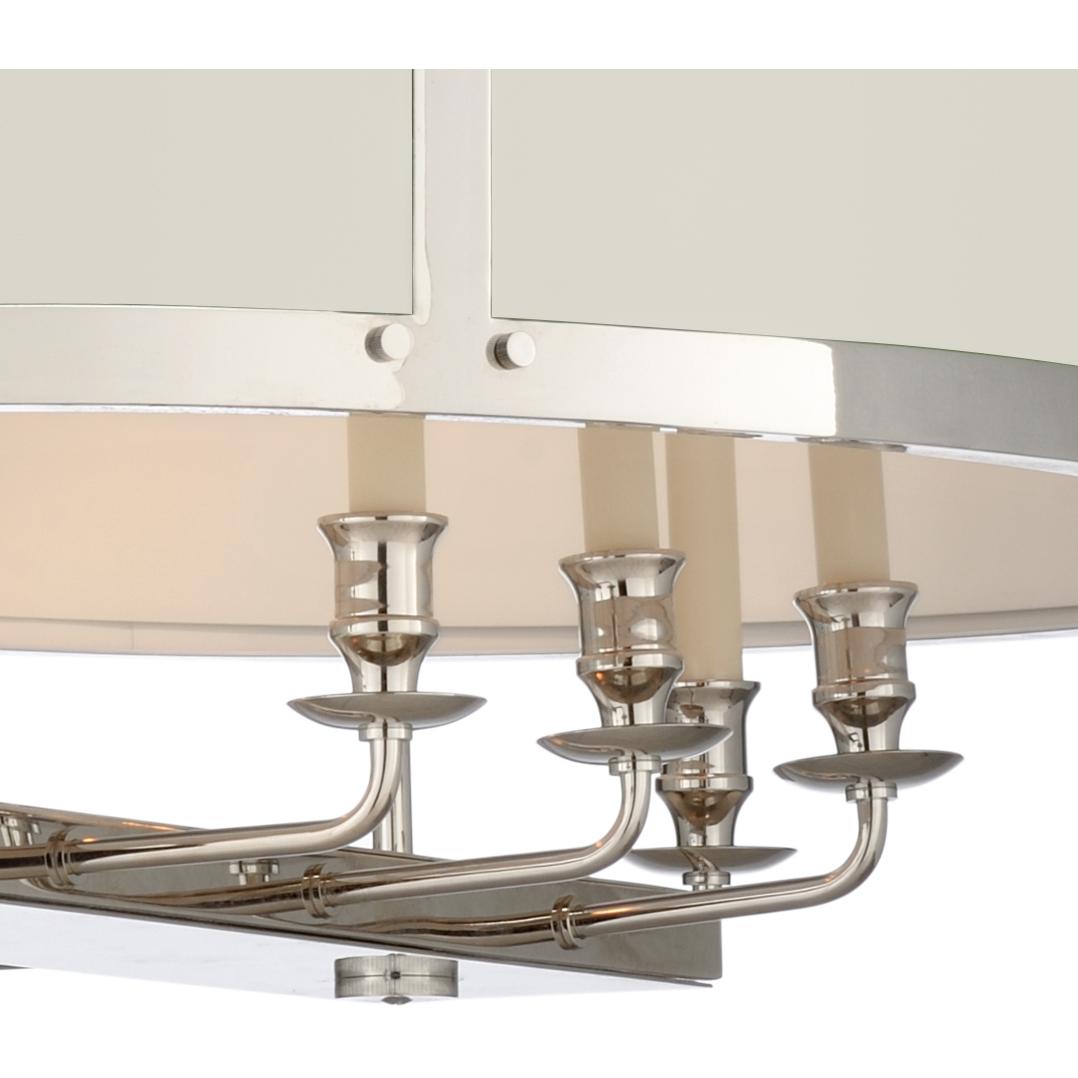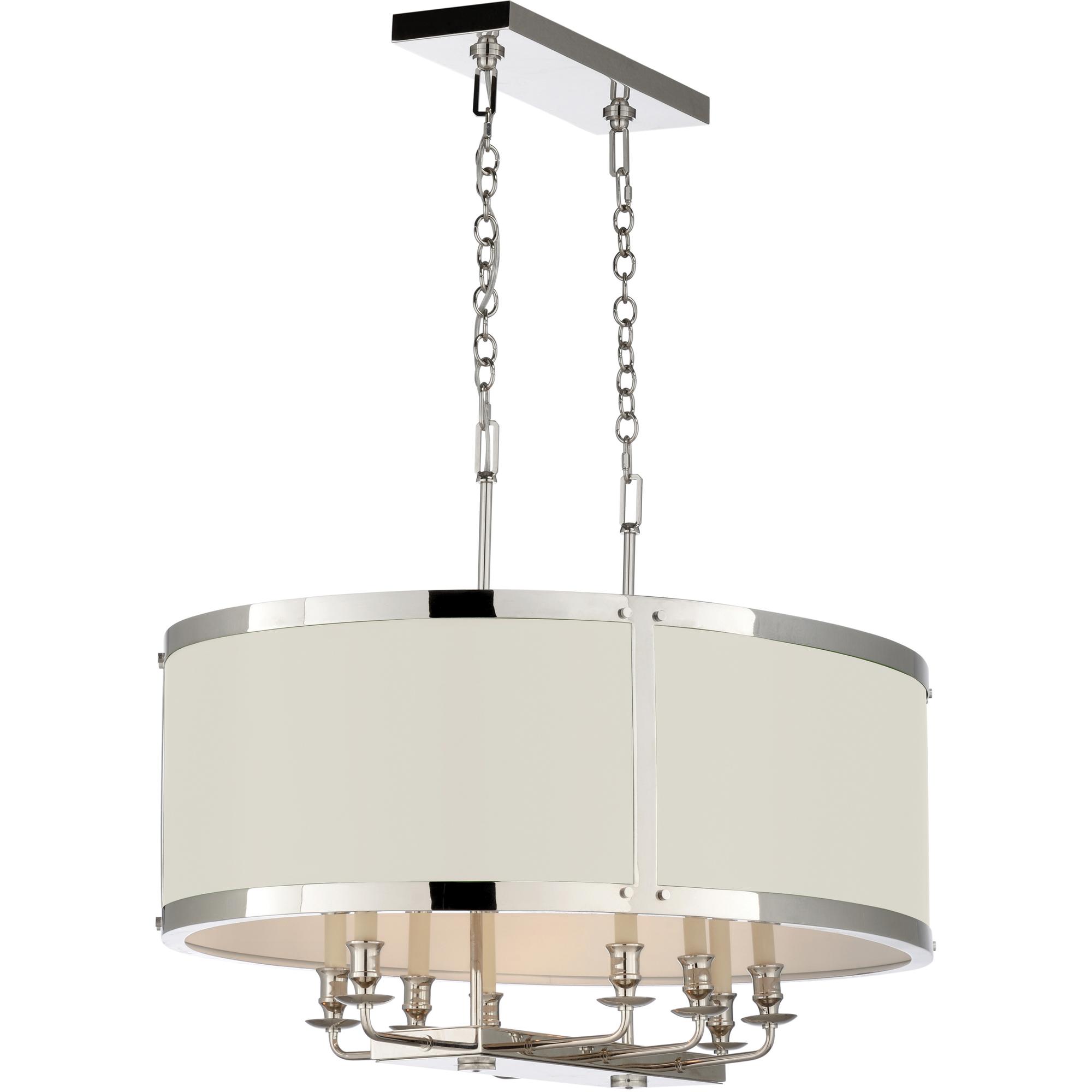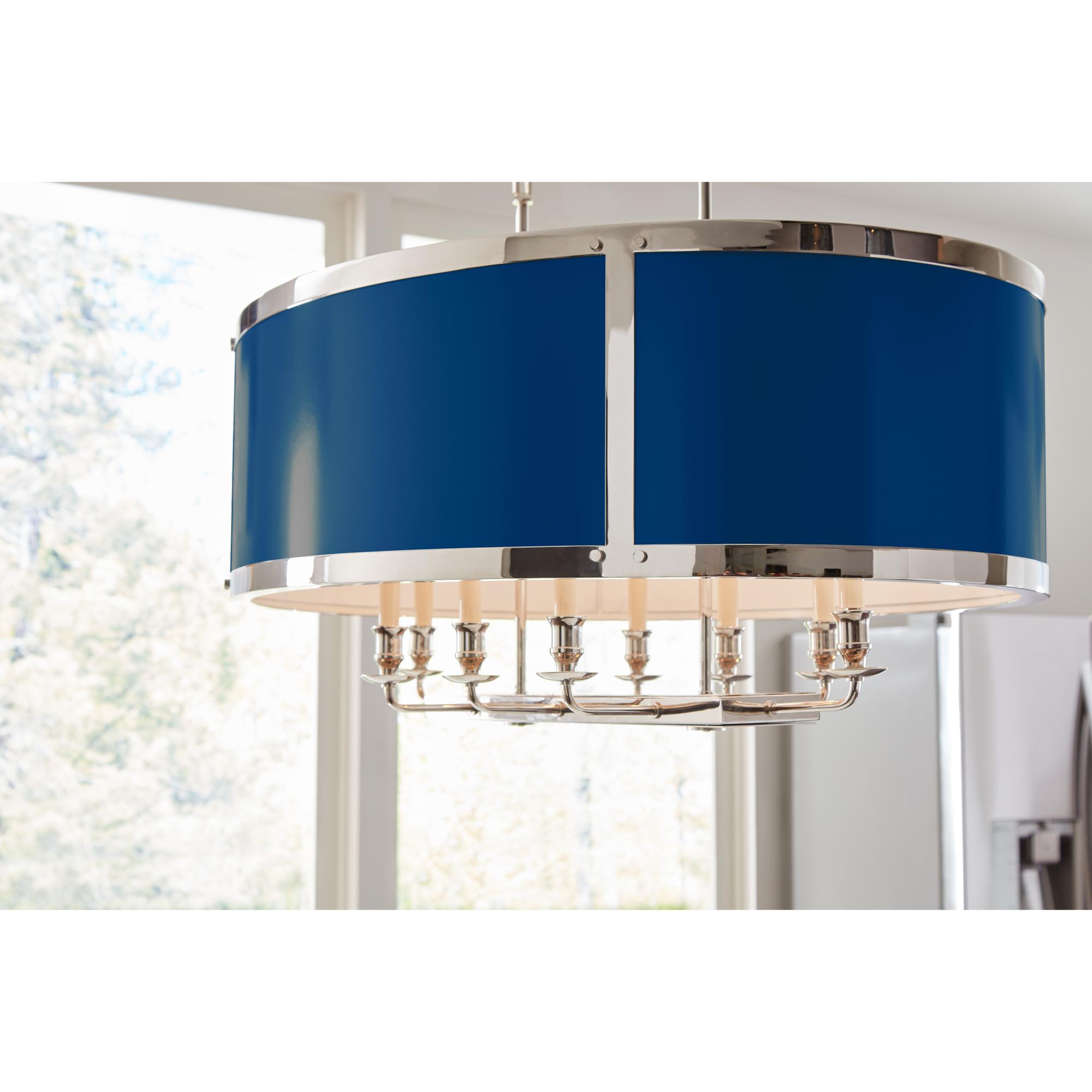 Perfect style and proportion, the High Street Oval Chandelier is a stunning hanging shade perfect for use over kitchen islands, breakfast tables, and in hallways and entry foyers. Available in a polished nickel body, the panels can be painted any Benjamin Moore or custom painted by your decorative painter on-site. (Comes with two 6 foot chains and has eight lights)