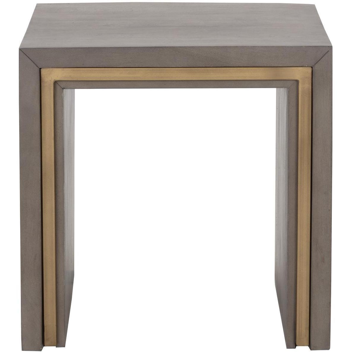- Solid acacia wood in a grey finish and brass inlay