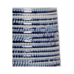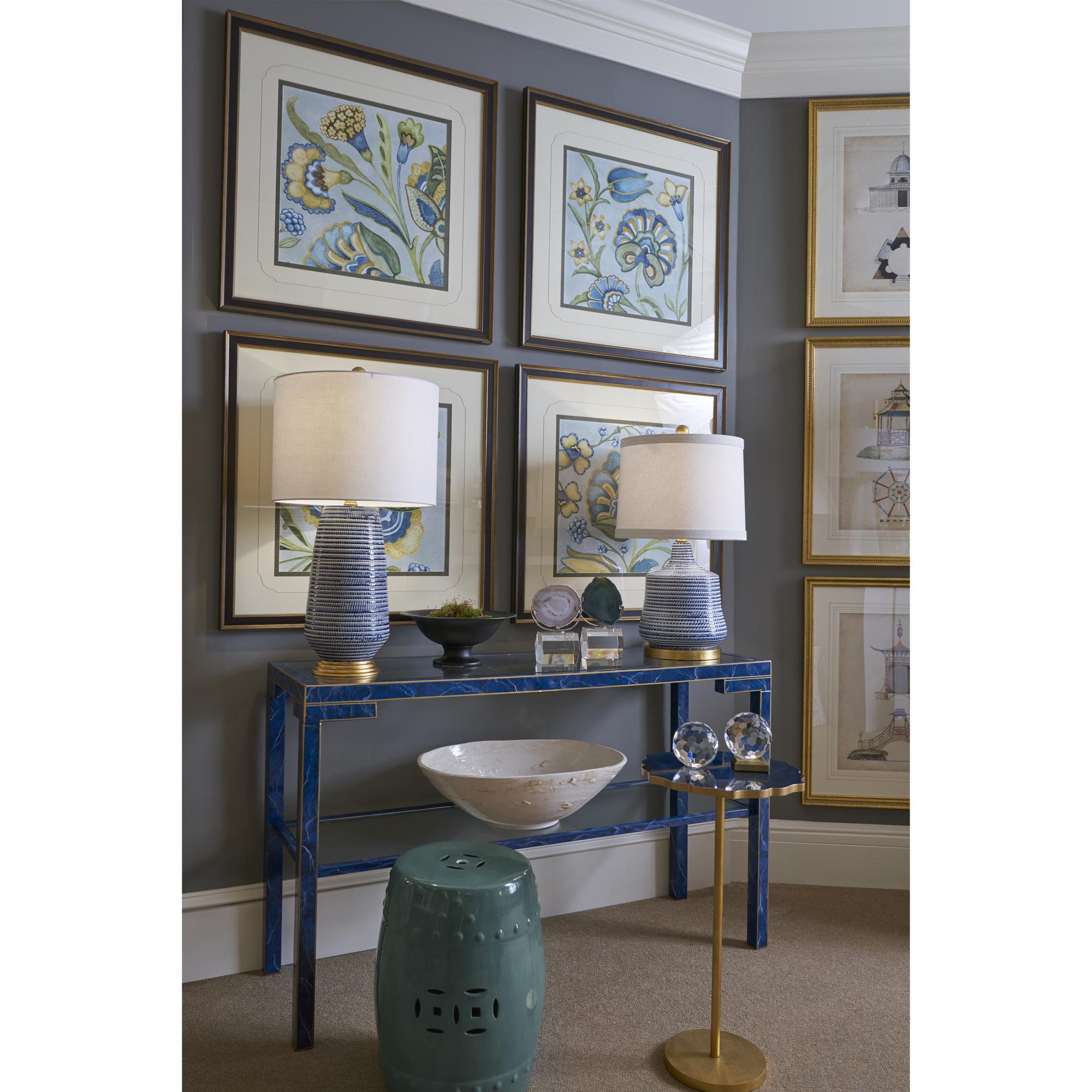 This cobalt blue and white glazed porcelain table lamp features a curved silhouette and texture reminiscent of a beehive. The antique gold leaf base and matching finial add a warm glow while the off white linen drum shade completes the look. The classic colors make this ideal for any table, nightstand or desk in a traditional design scheme.