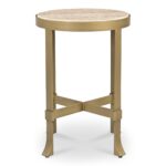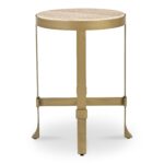 The Holli side table blends timeless travertine with sleek iron, as its organic top rests within a subtle metal rim. The antique gold base, featuring gentle curves and distinctive buckle-like detail, showcases meticulous craftsmanship in a timeless hue.