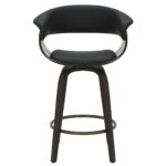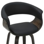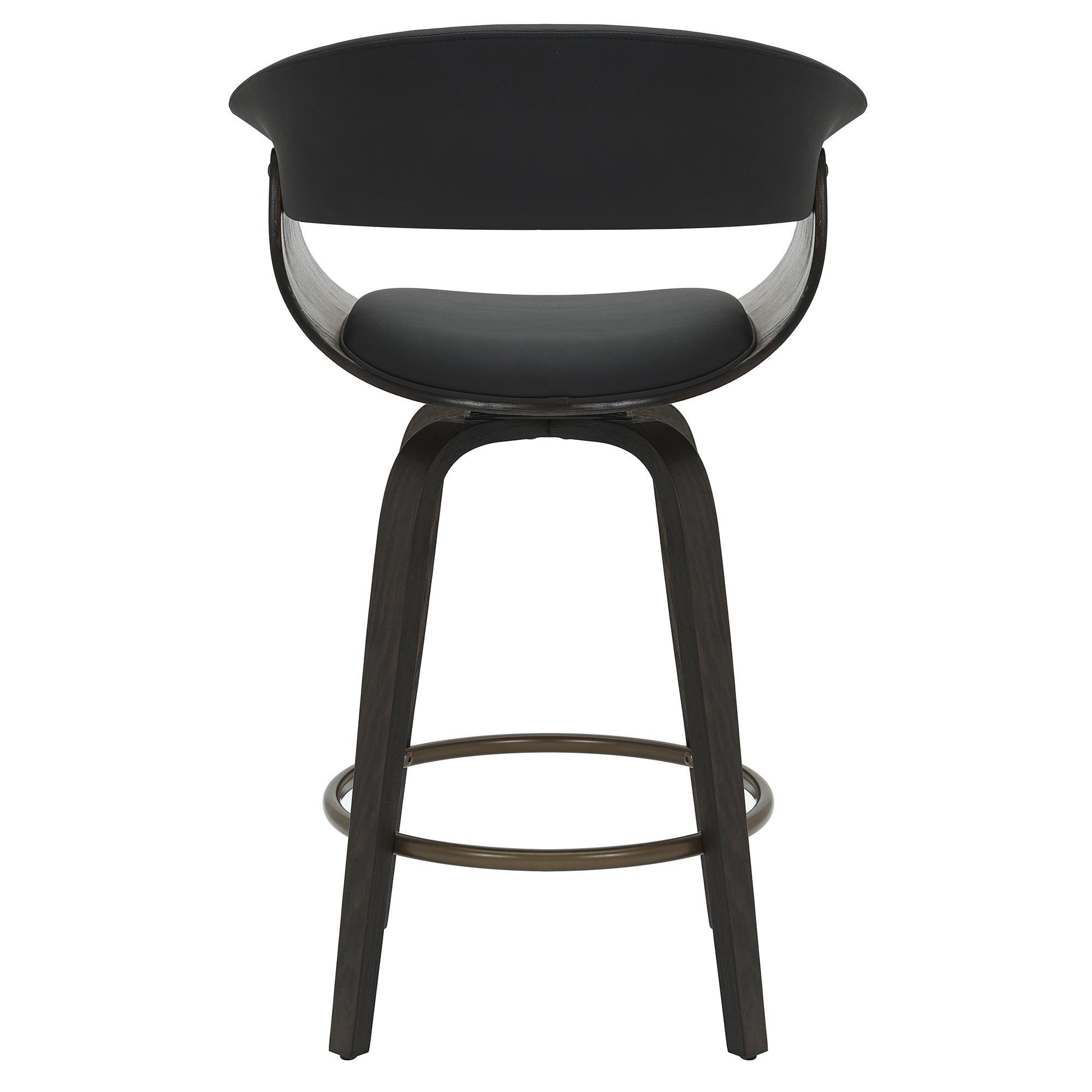 This mid-century style counter stool is crafted with a curved bentwood frame and legs in a dark walnut finish, and a black faux leather seat and back with piping details. The contoured back will envelope your body with plush elegance and the 360° swivel will ensure you can carry on a conversation in any direction. The aged gold footrest is the perfect finishing touch.