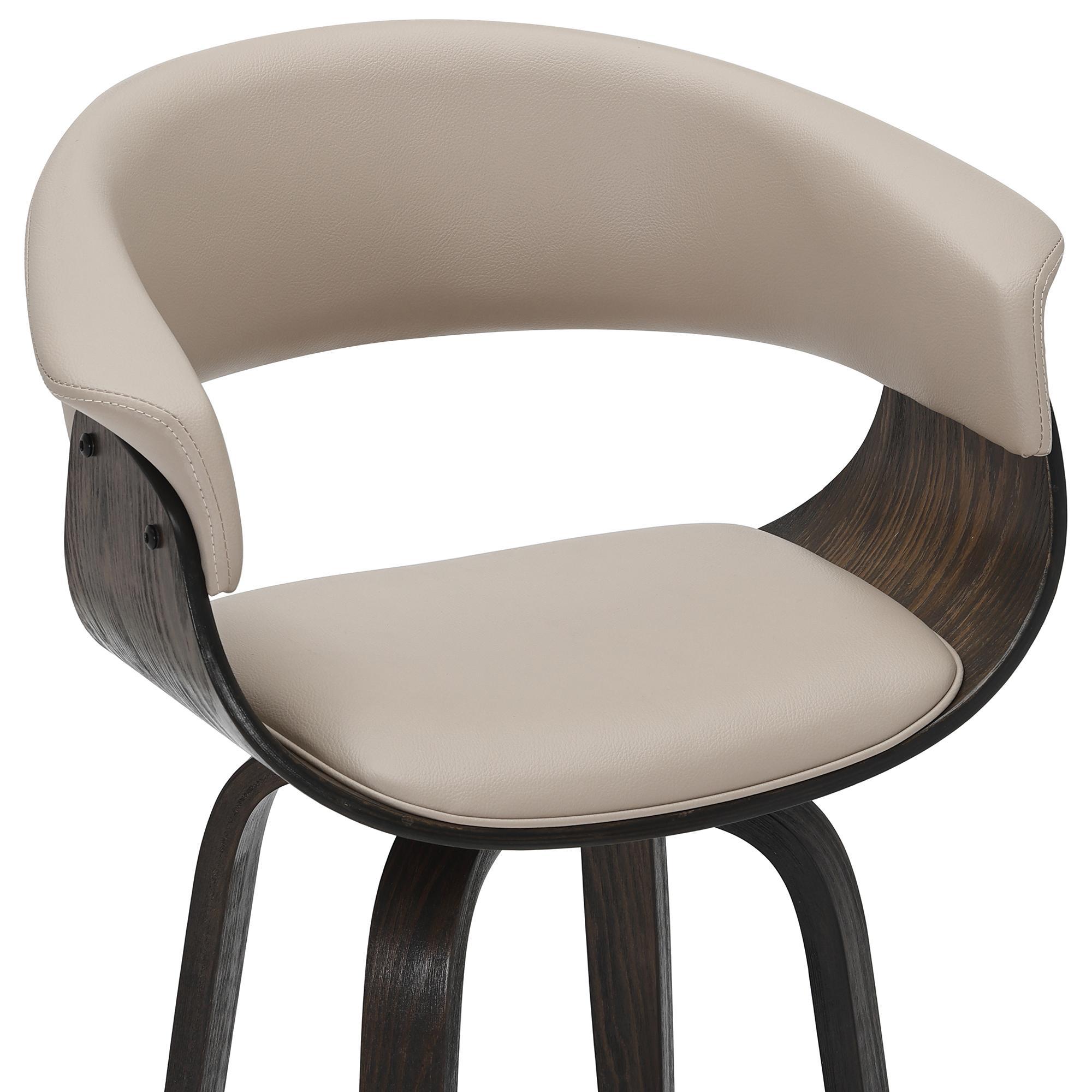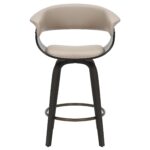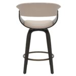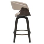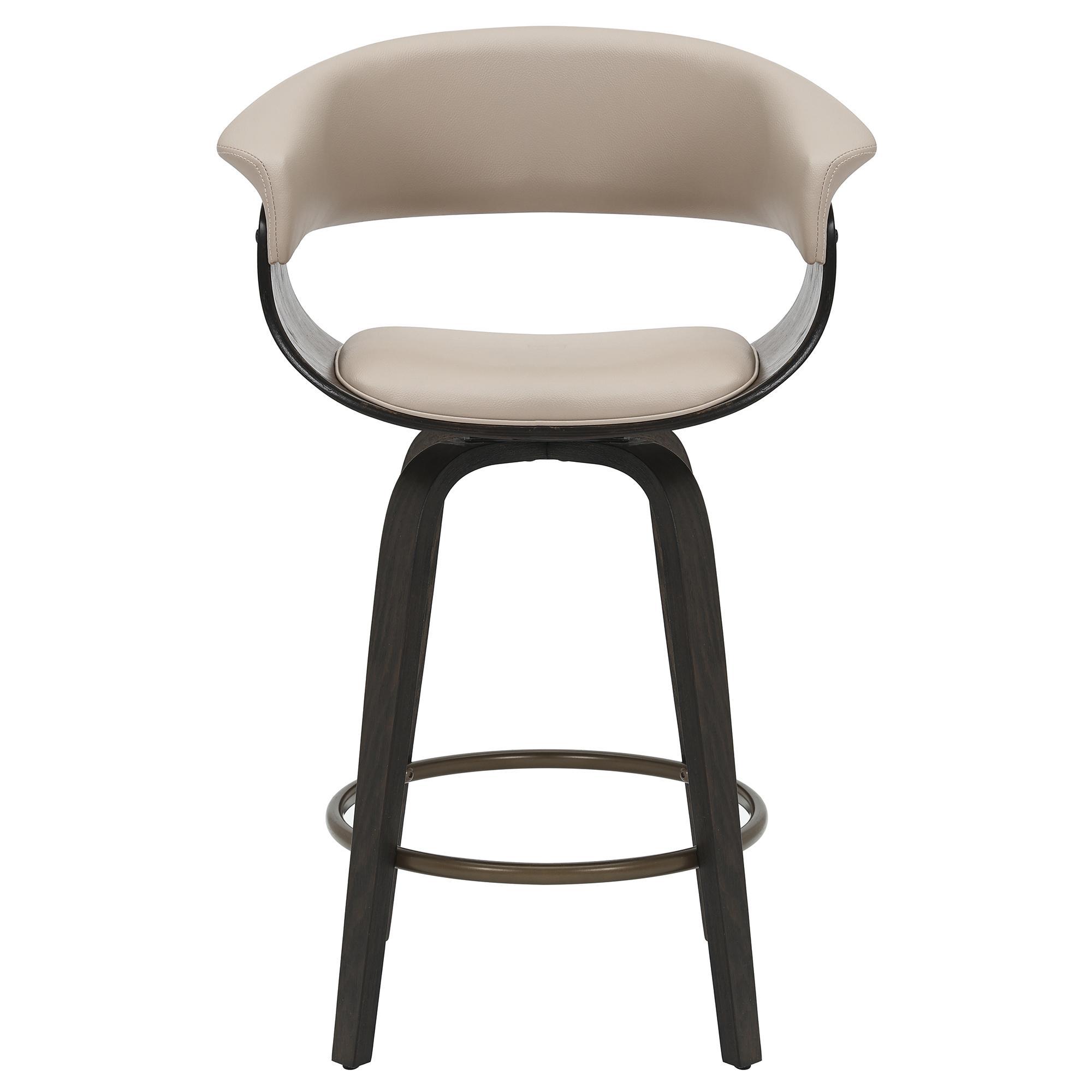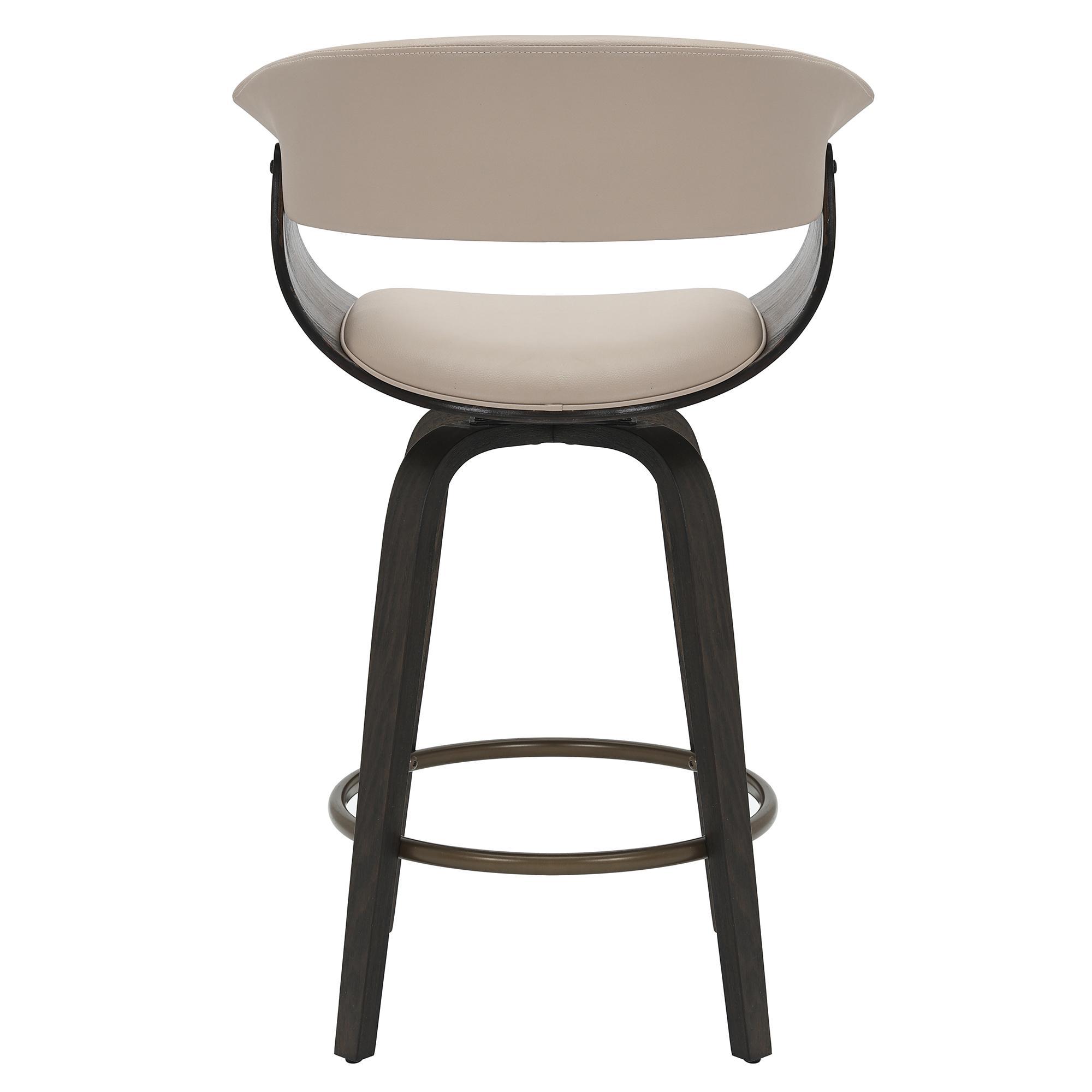 This mid-century style counter stool is crafted with a curved bentwood frame and legs in a dark walnut finish, and a mushroom-toned faux leather seat and back with piping details. The contoured back will envelope your body with plush elegance and the 360° swivel will ensure you can carry on a conversation in any direction. The aged gold footrest is the perfect finishing touch.