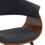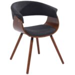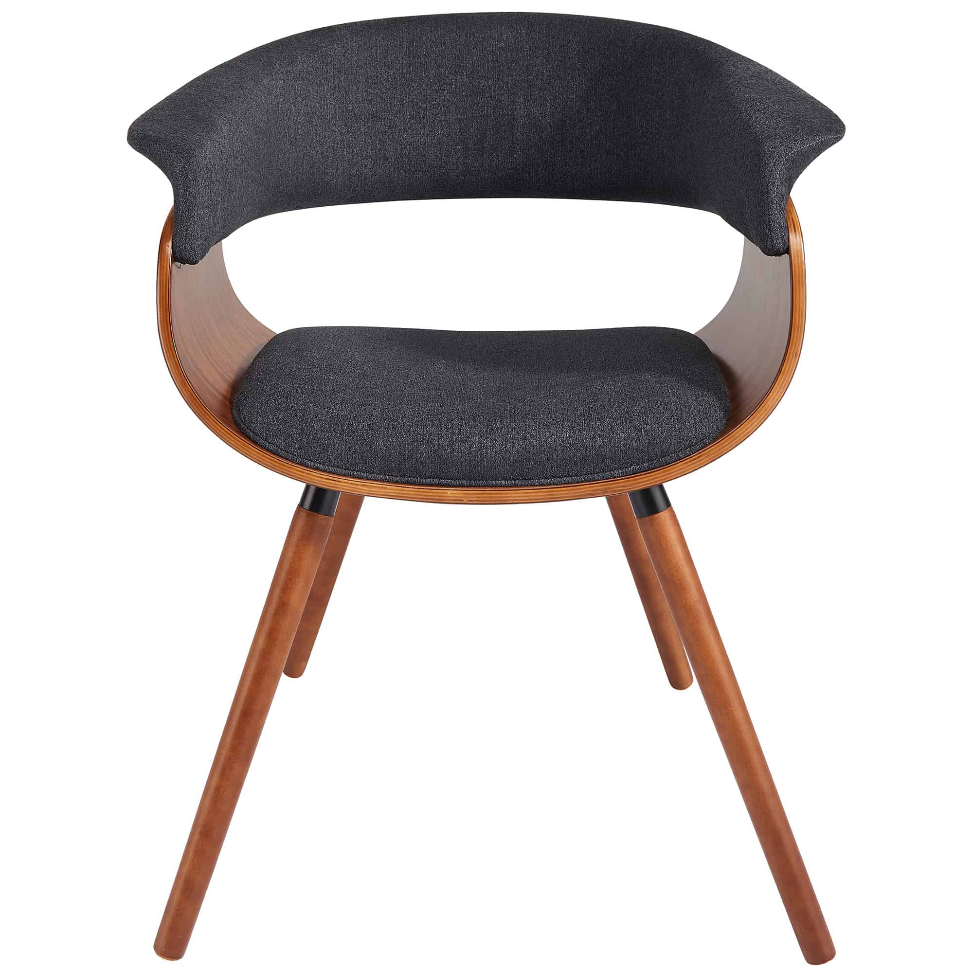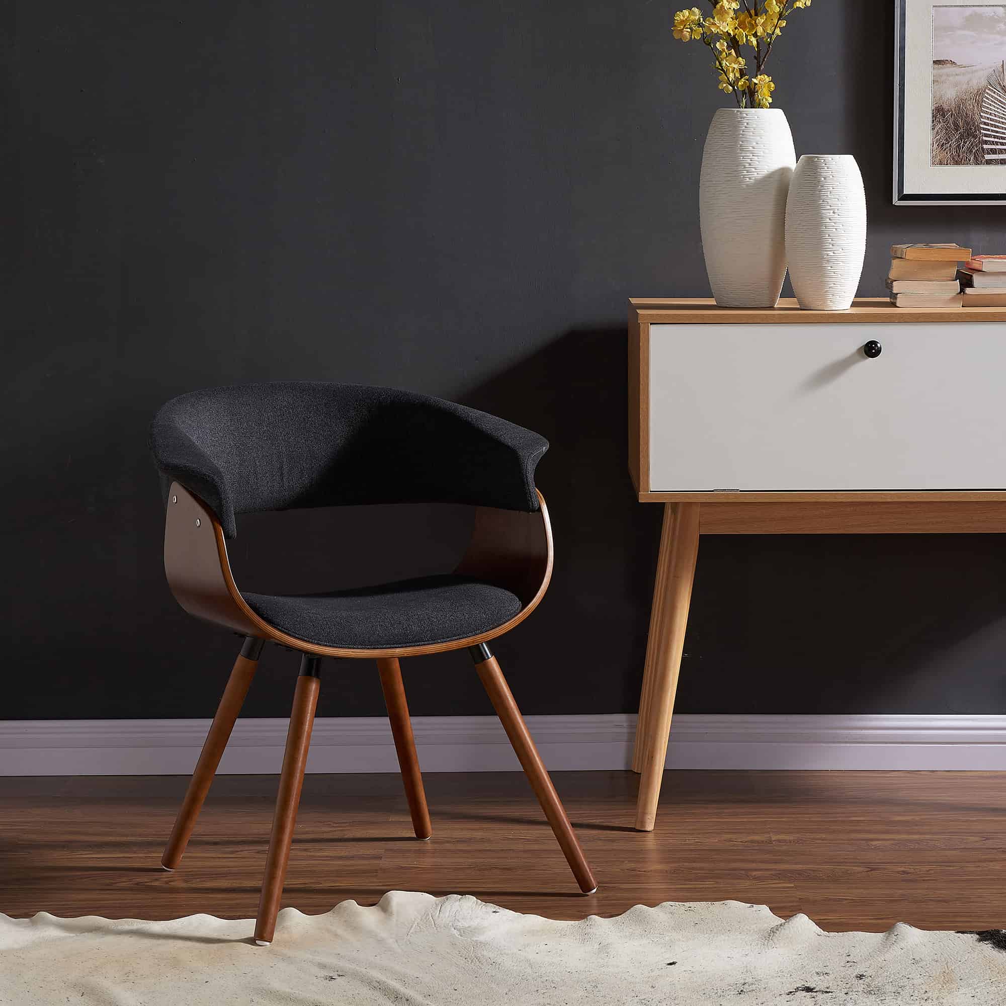 Utilizing a curved bentwood frame and solid rubber wood legs in a rich walnut finish, the structure of this chair will be quick to catch even the most critical eye with its appealing flair. The mid-century modern styling is finished with charcoal grey fabric, embellished with piping details. This chair is perfectly suited to pair with any style of dining table, or to hold its own as an accent piece in a living room, hallway, or bedroom.