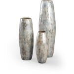 Add visual interest with this set of three distressed gray enamel vases. Crafted of iron with an glossy enamel finish, each vase has a tapered cylindrical body. Use separately or as a set in any rustic modern design. Small 12.5″h x 5″w x 5″d, Medium 17.5″h x 6″w x 6″d, Large 24.5″h x 7″w x 7″d