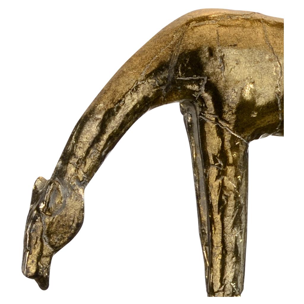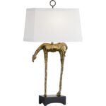 Inspired by the works of Giacometti, Homer Lamp features an elongated figural sculpture of a horse. Crafted in a textured composite, this antique brass plated sculpture stands on a black painted base. The texture and color reflect the light throughout your space. An off-white rectangular shade is secured on top with a circular finial. Ideal for the animal lover or any equestrian themed space.