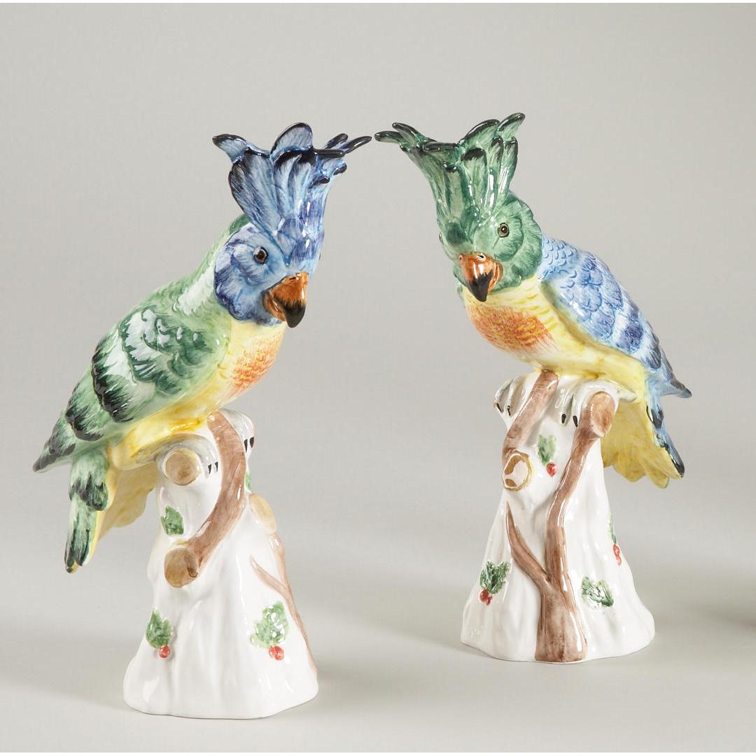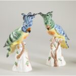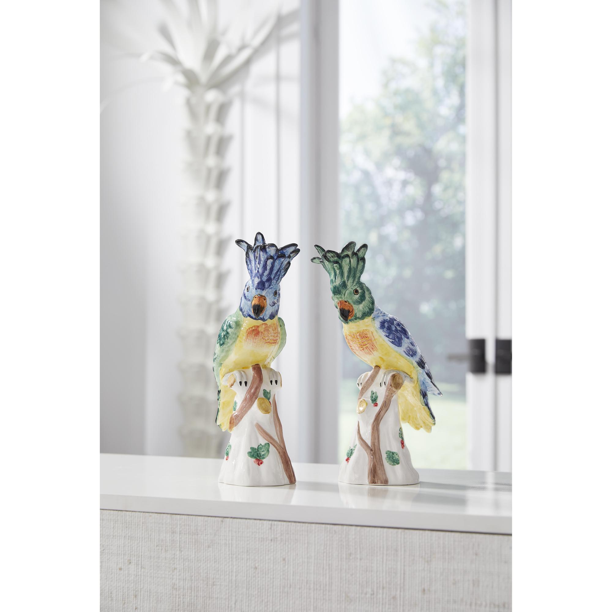 Known as a symbol of everyday beauty, our exquisite hope parrot figurines will brighten any decor. Molded from Italian ceramic and hand painted in vivid greens and blues, this pair of charming parrots are ideal for displaying on an etagere, wall shelf, tabletop or anywhere a splash of color and beauty are needed. Made in Italy.