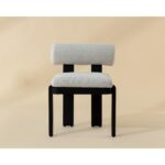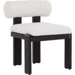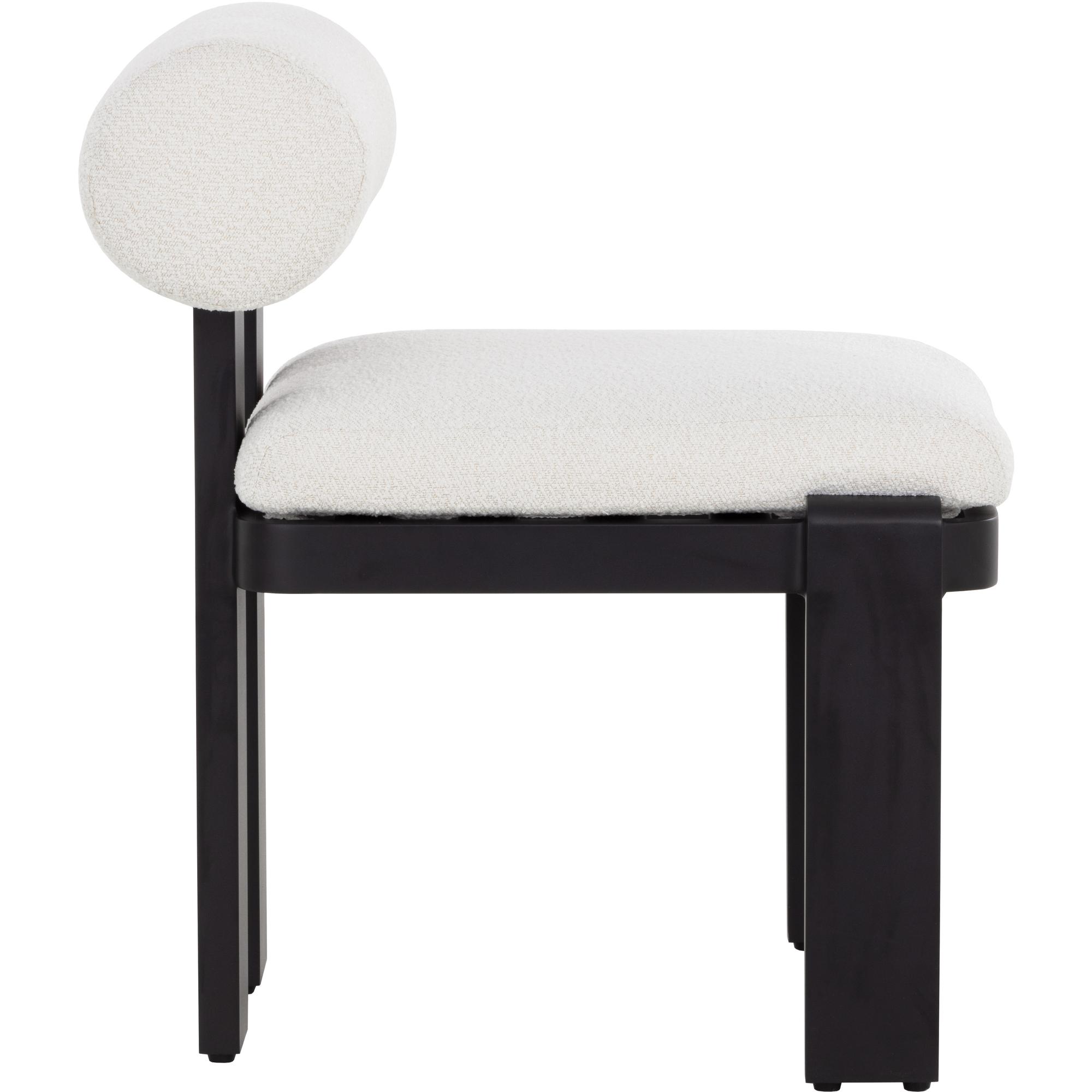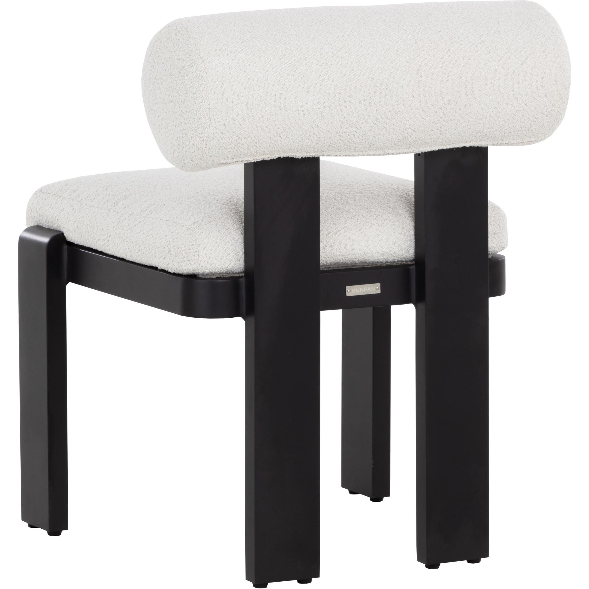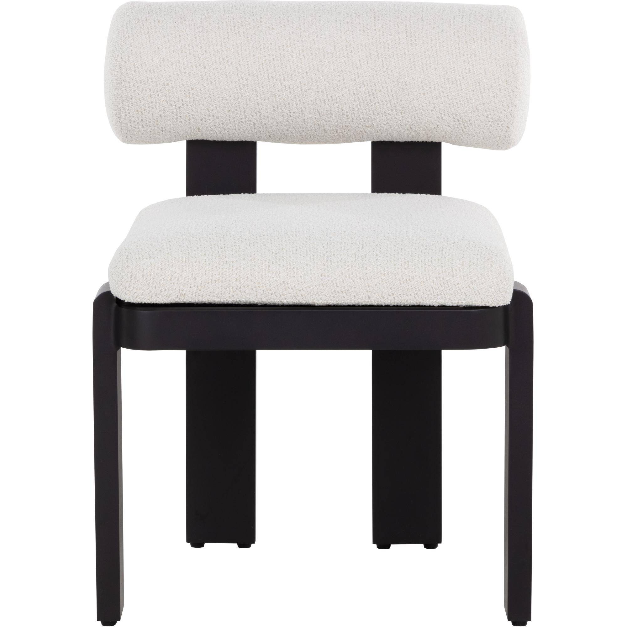 Beautifully contoured, the Horris Dining Armchair is sculpted with geometric lines. A bolster back and square seat upholstered in louis cream fabric softens the look while a black aluminum frame displays shape and modern style.
