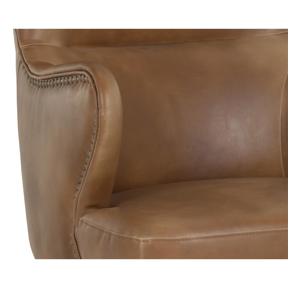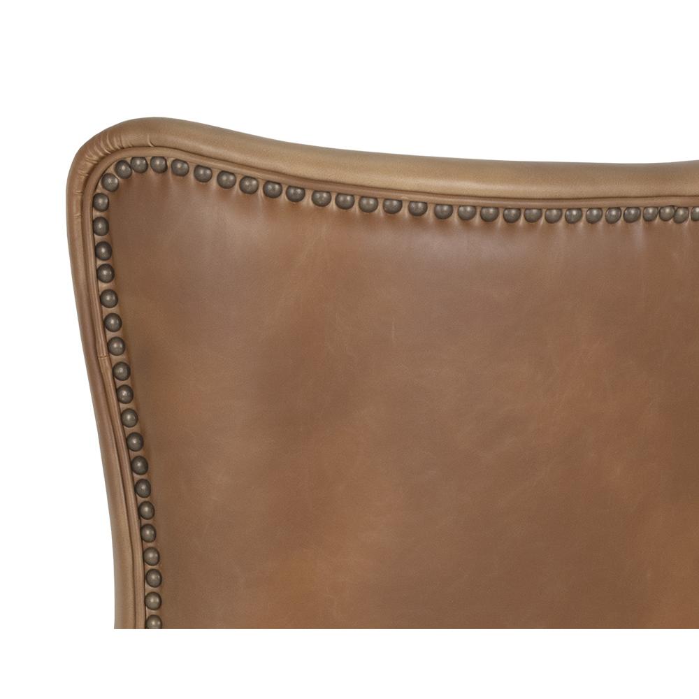 Introduce an element of sophisitcation to any workspace with this regal office chair that features a stunning wingback design with nailhead detailing on the seatback. Upholstered in tobacco tan faux leather and completed with a black birch wood base. Includes added castors with antique brass covers. Handle With Care: This design has been crafted with faux leather. Faux leather is manufactured to reflect the natural characteristics of leather; as such, colour variations, markings wrinkles, grooves, and light scratches are appreciated characteristics. No two pieces will be alike. Visit our Product Care page for more information on how to ensure the lasting beauty of this piece.