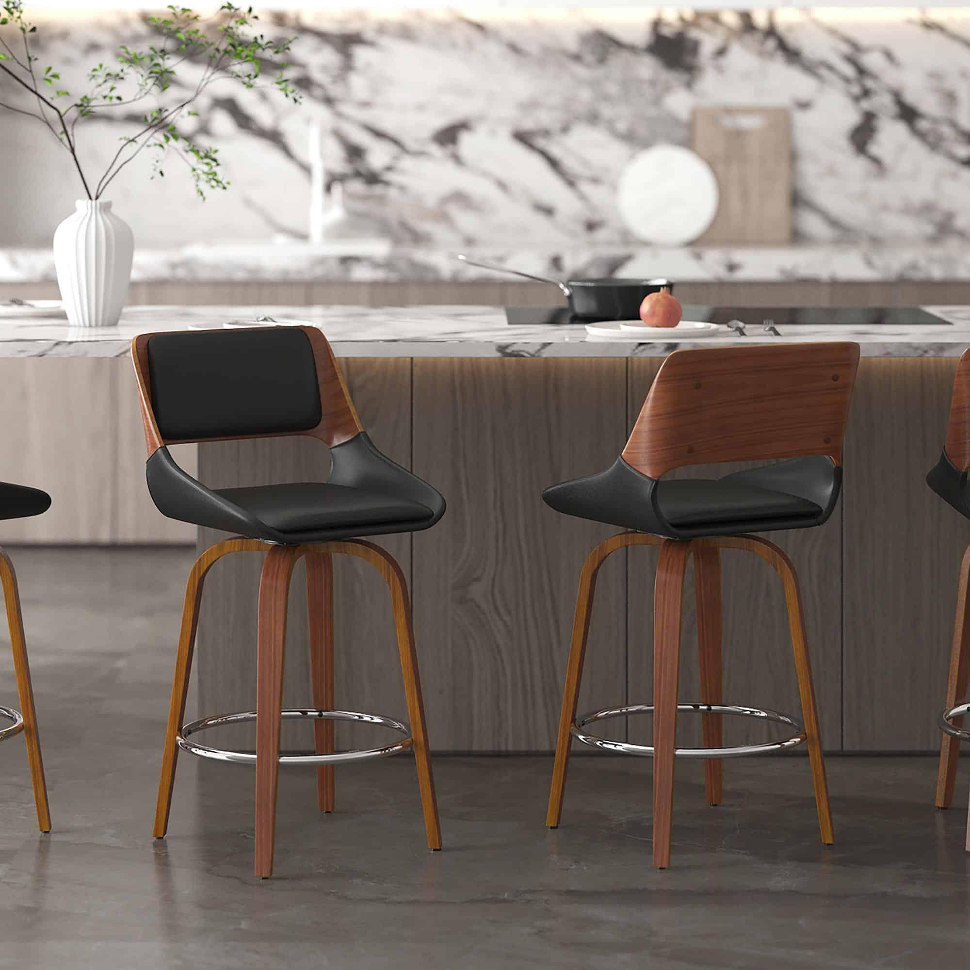 When the best of mid-century modern design is integrated perfectly into the current design world, you get gorgeous pieces like this stool. The bentwood frame and legs are beautifully finished in a timeless walnut, and the cushioning is all upholstered in a matte faux leather – creating the perfect modern mid-century piece. Full swivel allows for ease of use at any counter space.