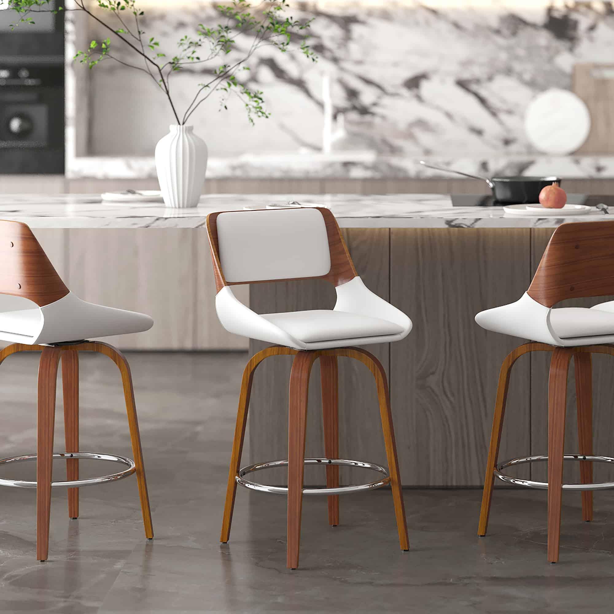 When the best of mid-century modern design is integrated perfectly into the current design world, you get gorgeous pieces like this stool. The bentwood frame and legs are beautifully finished in a timeless walnut, and the cushioning is all upholstered in a matte faux leather – creating the perfect modern mid-century piece. Full swivel allows for ease of use at any counter space.