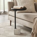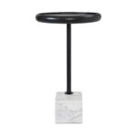 Looking for the perfect complement to your design project? The Hull side accent table is poised to impress. Measuring 14 inches wide, it’s perfectly sized to sit comfortably next to a couch, lounge chair or bed. Designed with a compact footprint, its natural white marble and black finished iron base ensures an airy feel while maintaining ample space on its acacia tabletop. Simple and sleek in its design, this end table would be a great fit in any modern space.