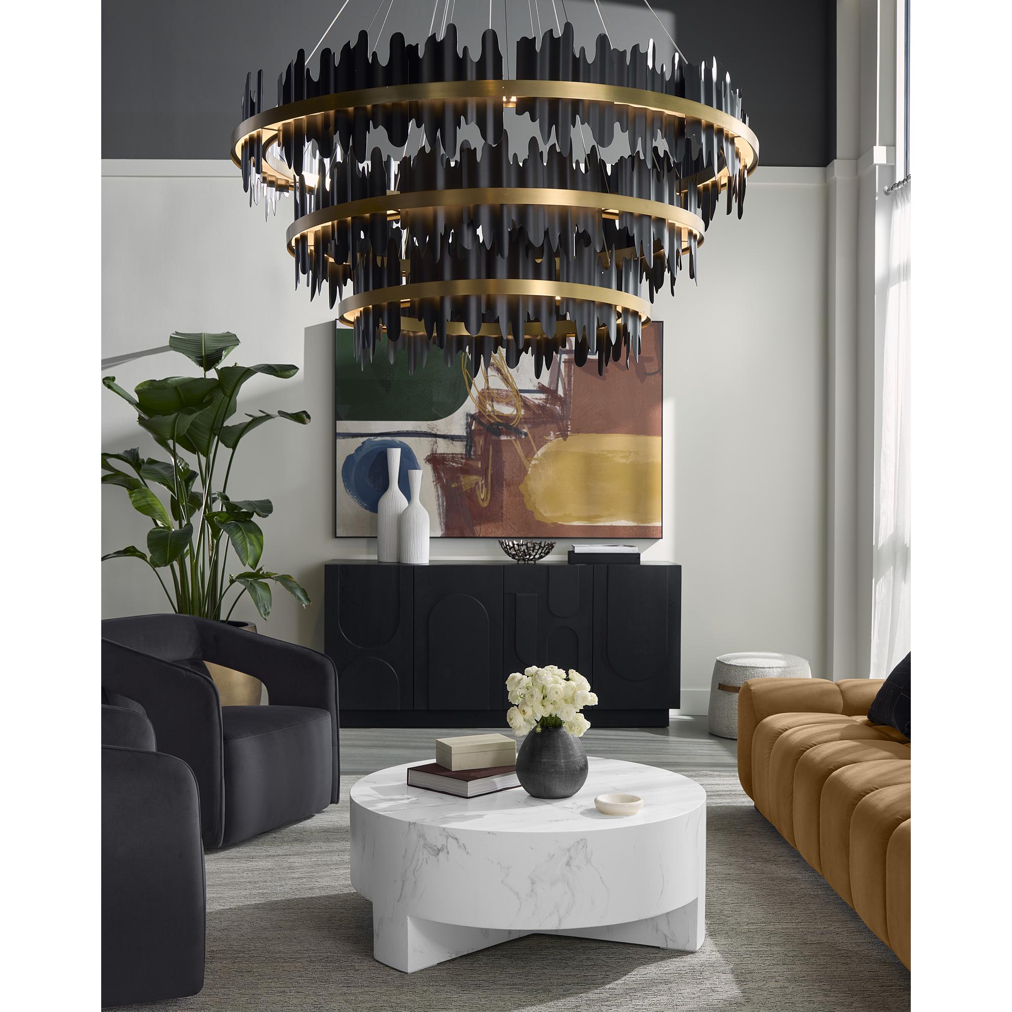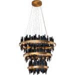 Eye-catching and intriguing, the Icarcus Chandelier brings a moody ambience to any space. Matte black metal pieces are carefully inserted within the brushed gold aluminum bands to give off a striking presence.