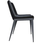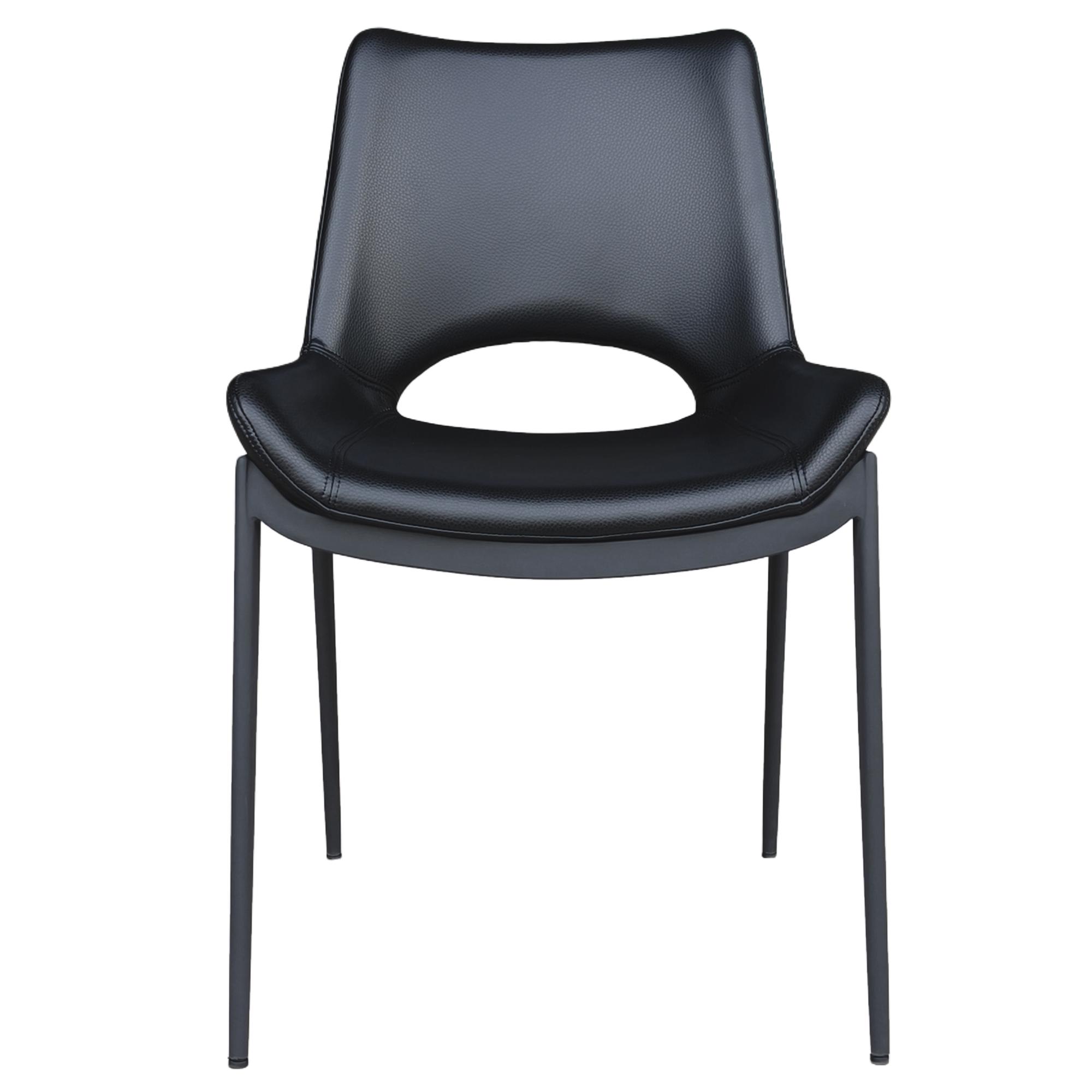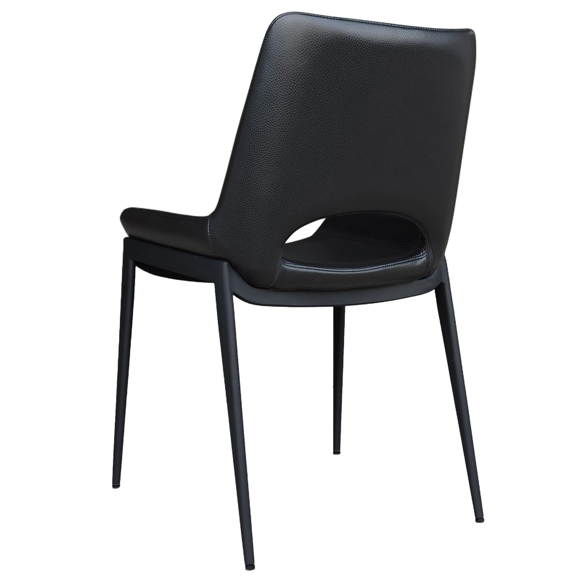 Experience high-class seating firsthand with these designer-inspired chairs. Comfortable, contoured seating is perfect for hours of seated conversation. Textured faux leather and metal base come together to create the perfect contemporary design for your space. These chairs can be used for dining or lounge areas and are suitable for residential or commercial spaces.