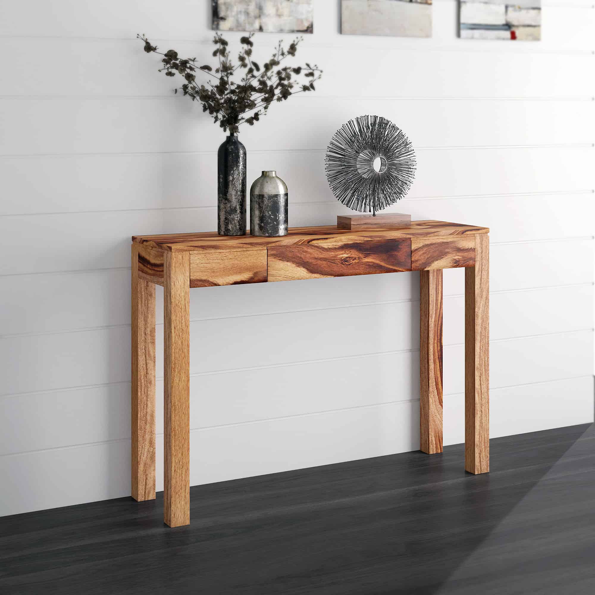 The natural beauty of Indian Sheesham wood shows in this solid wood, hand-crafted table. Compact sizing makes this a great piece for a narrow hallway or entryway. The functional drawer is a great catch-all for keys and other knick knacks. Experience piece-of-mind knowing that this table is made with “green” materials. Wood characteristics include; mineral deposits, irregular grain patterns, and unusual knots. Any of these may occur with changes in humidity and other severe climate conditions and are inherent in product.