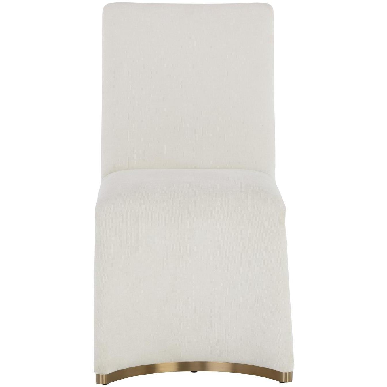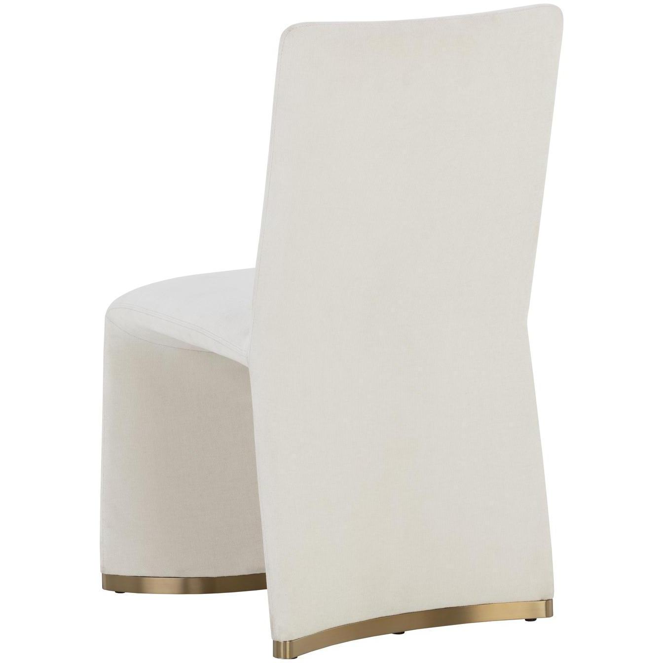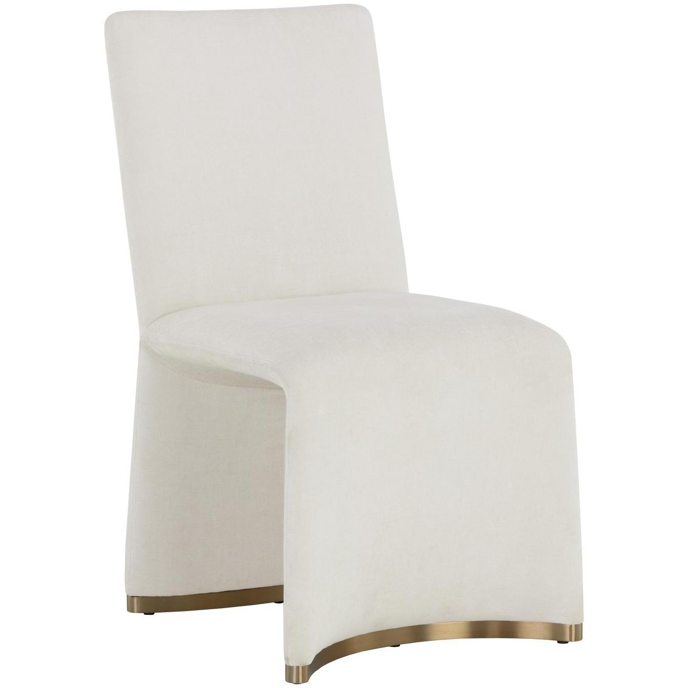 The Iluka Dining Chair features a sophisticated profile with contoured curves for ultimate support. Generously upholstered in danny ivory fabric with chic stainless steel gold accents on the bottom.