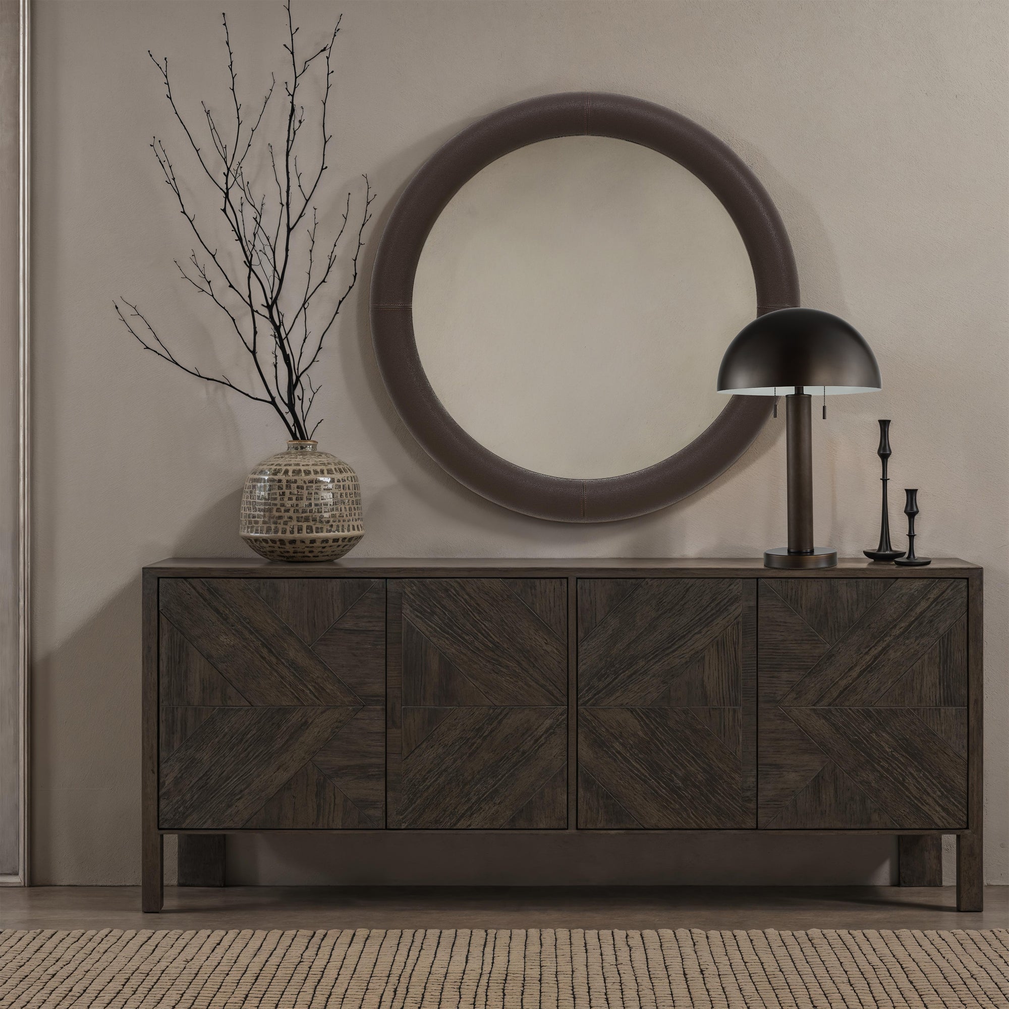 Bring modern edge to any space with the Incanta table lamp. Finished in rich dark bronze with subtle faux-leather accents, its smooth iron body and sleek dome shade hold an understated, minimalist presence. A simple pull-chain adds easy everyday functionality, making this lamp a welcoming addition to bedrooms, living areas, or any corner that could use a soft, stylish glow.