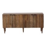 An elegant mix of organic allure and practical function, the Infinity sideboard is a sleek, contemporary design with two adjustable interior shelves that provide plenty of versatile hide-away storage options. Unexpected pops of pattern and playfulness circle its four swinging doors, adding depth and texture to the dark, moody, solid mango wood construction.