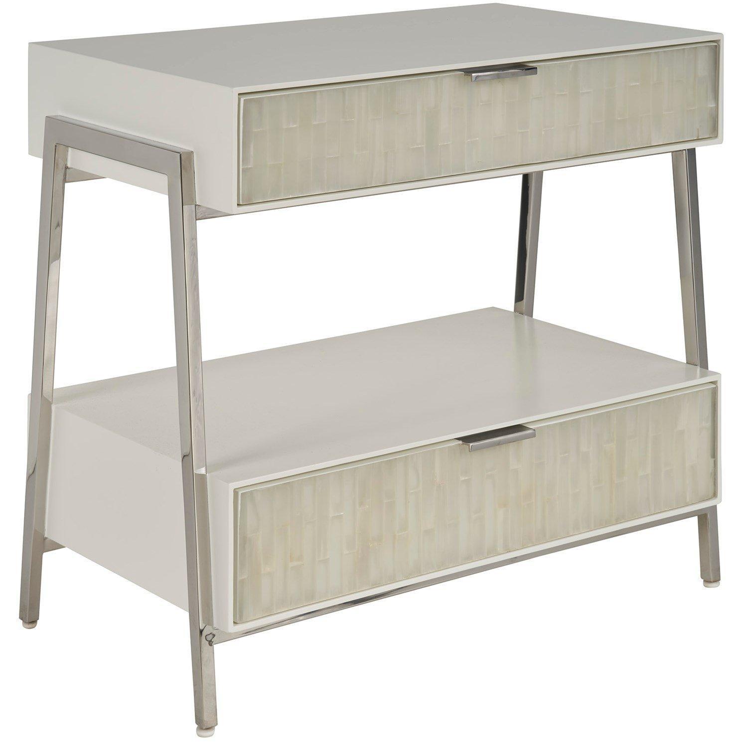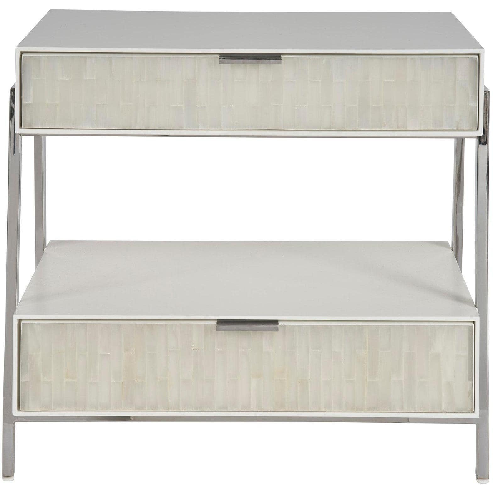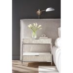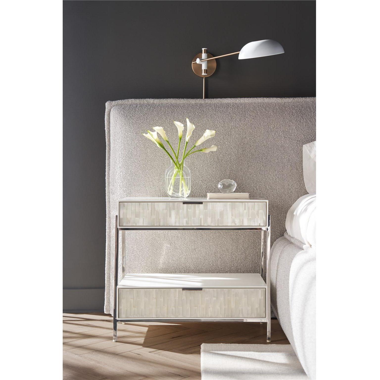 The Ingrid Nightstand presents an elevated design with two drawers, showcasing stunning selenite fronts set against a sleek polished nickel base. This piece epitomizes clean, refined aesthetics, offering an ultra-modern touch that seamlessly integrates into sophisticated bedroom interiors.