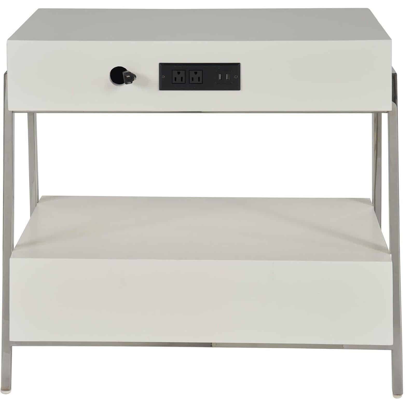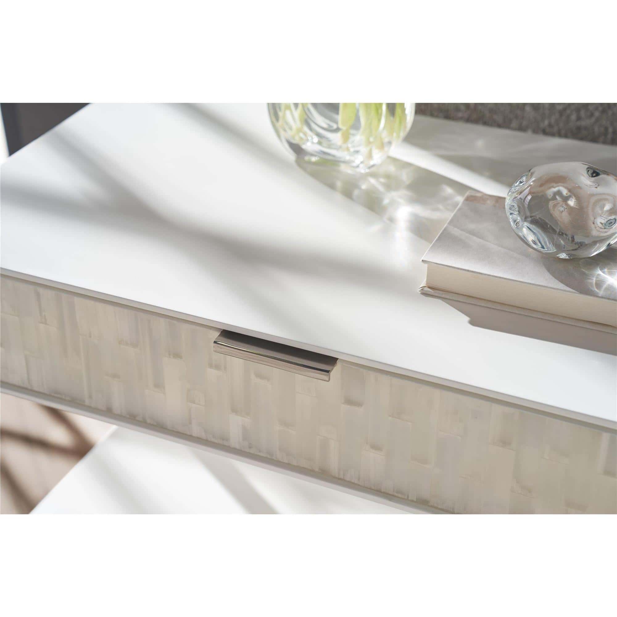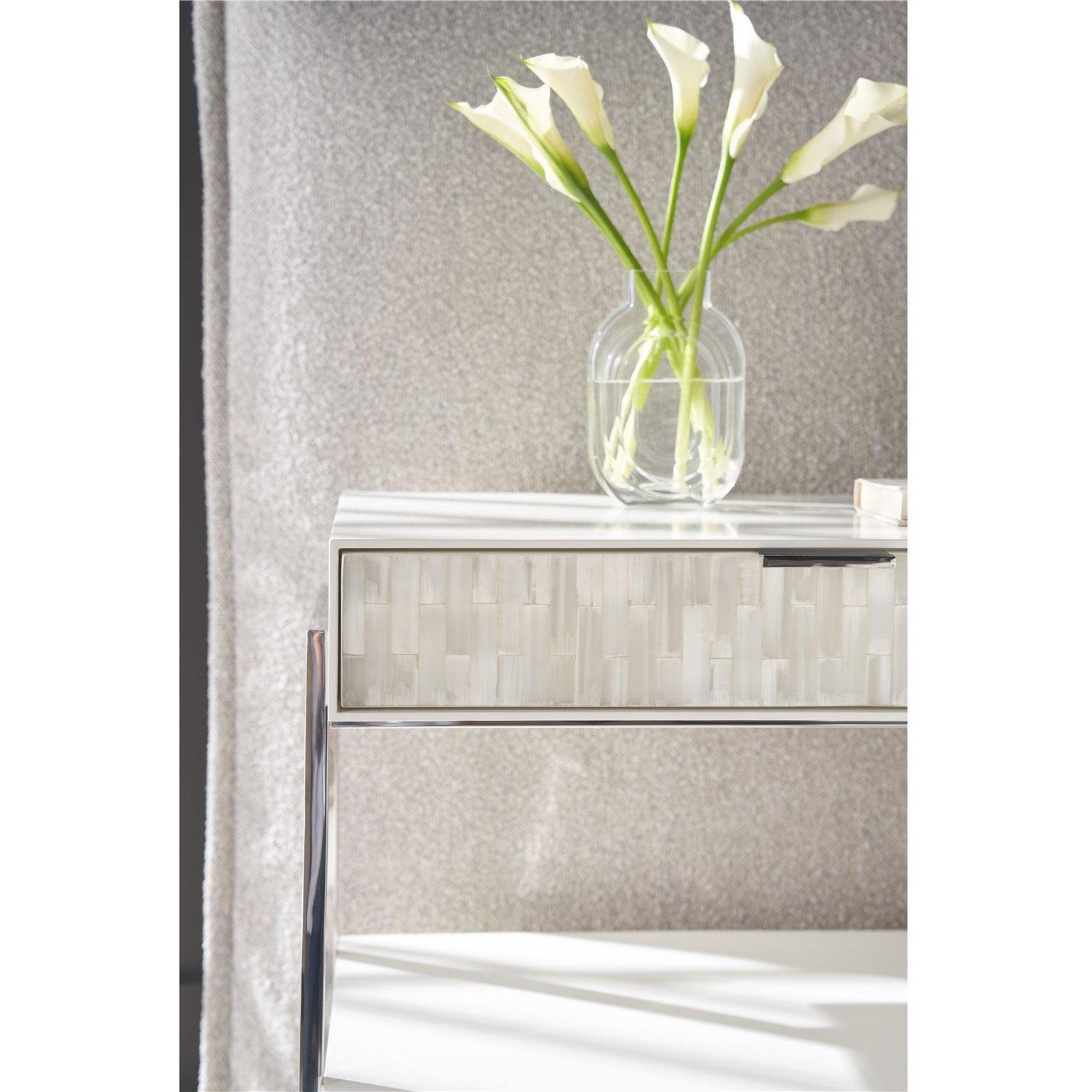 The Ingrid Nightstand presents an elevated design with two drawers, showcasing stunning selenite fronts set against a sleek polished nickel base. This piece epitomizes clean, refined aesthetics, offering an ultra-modern touch that seamlessly integrates into sophisticated bedroom interiors.