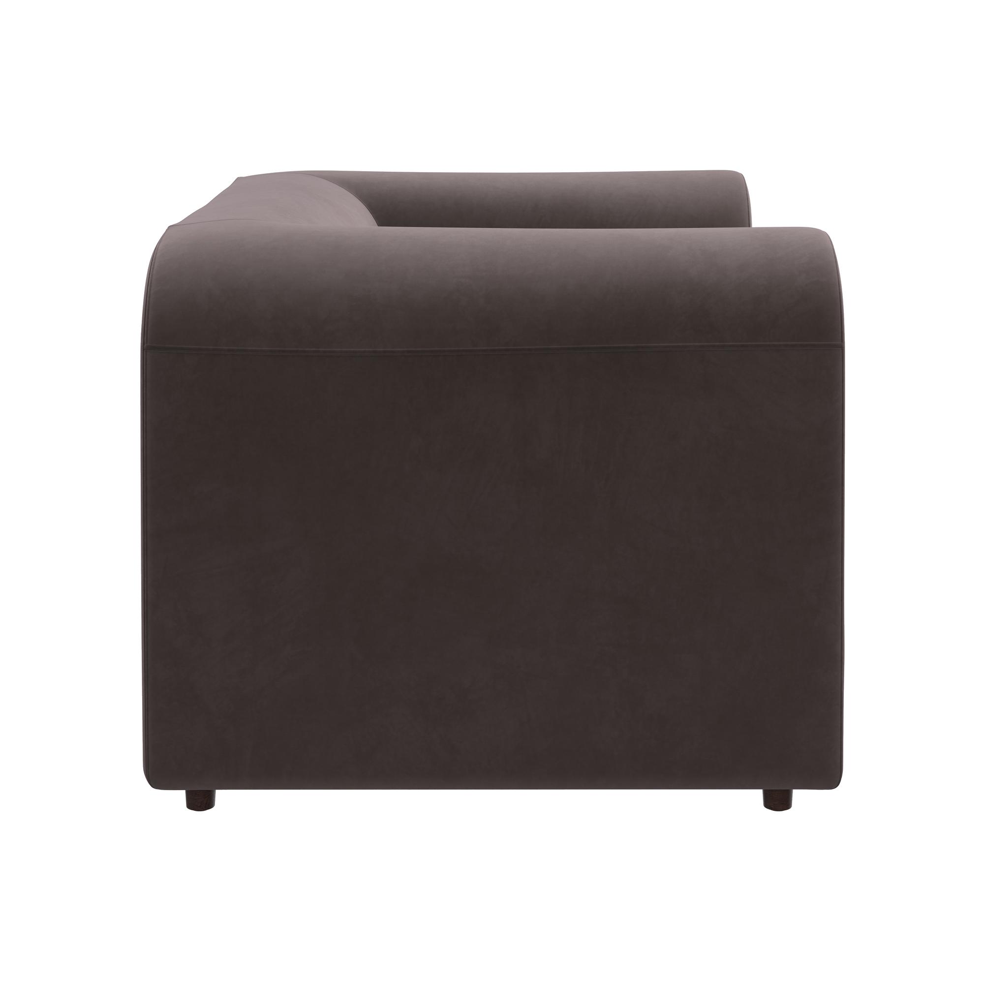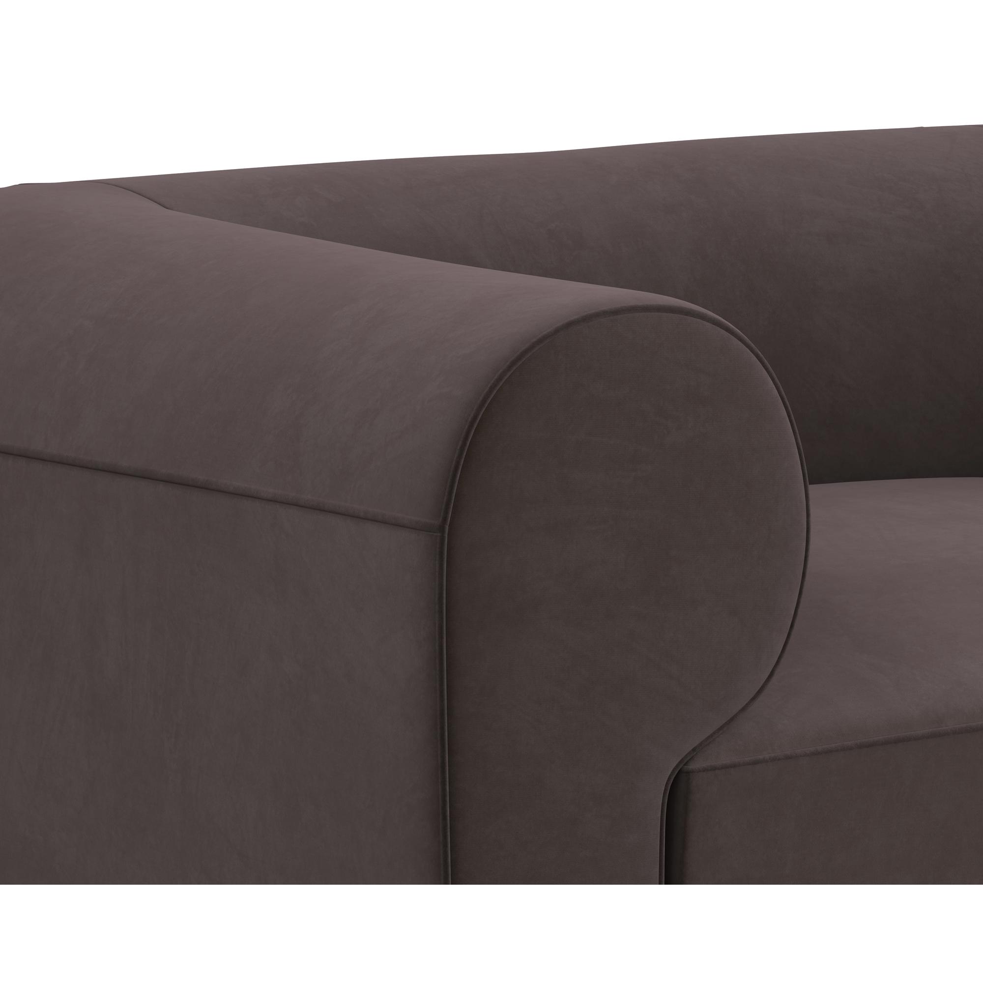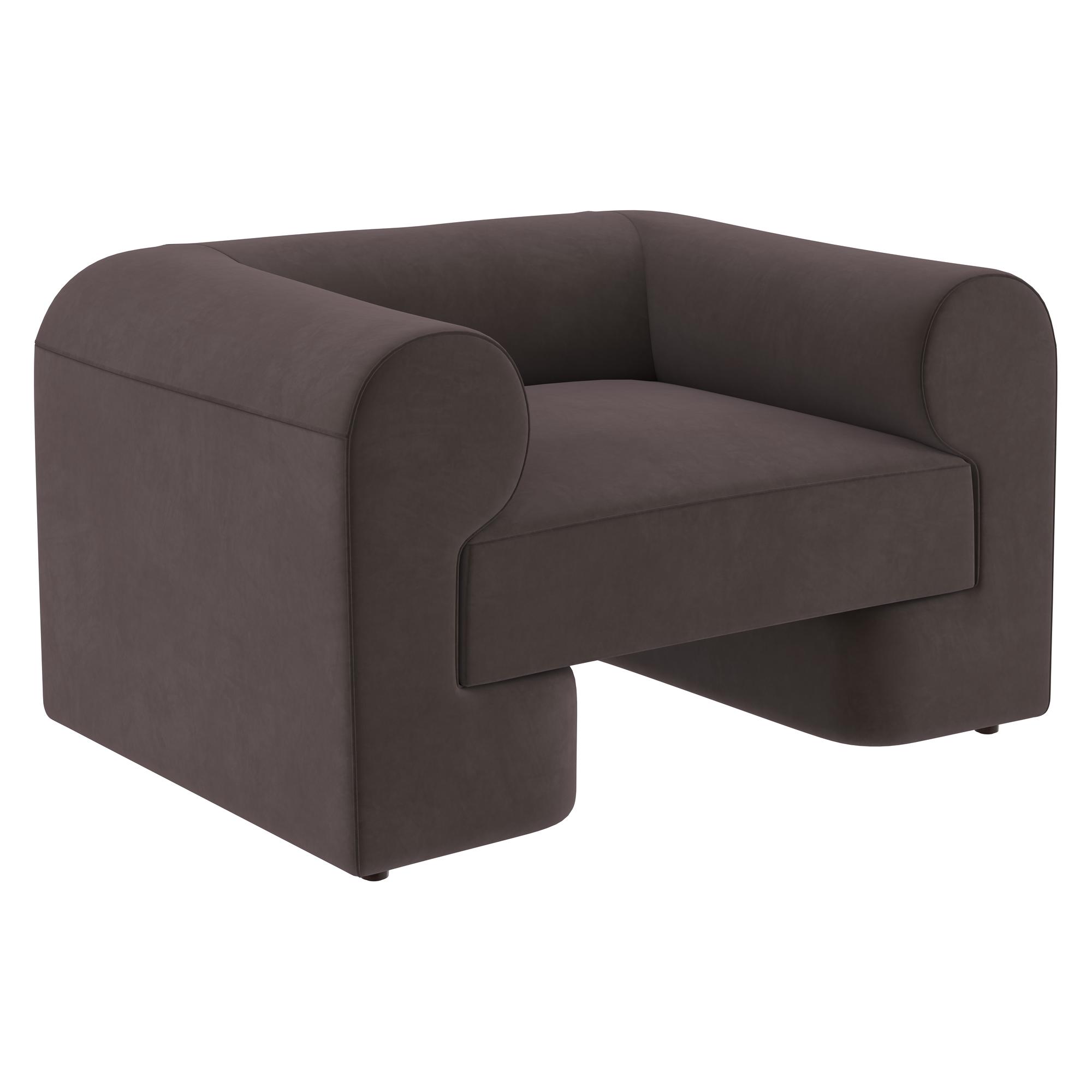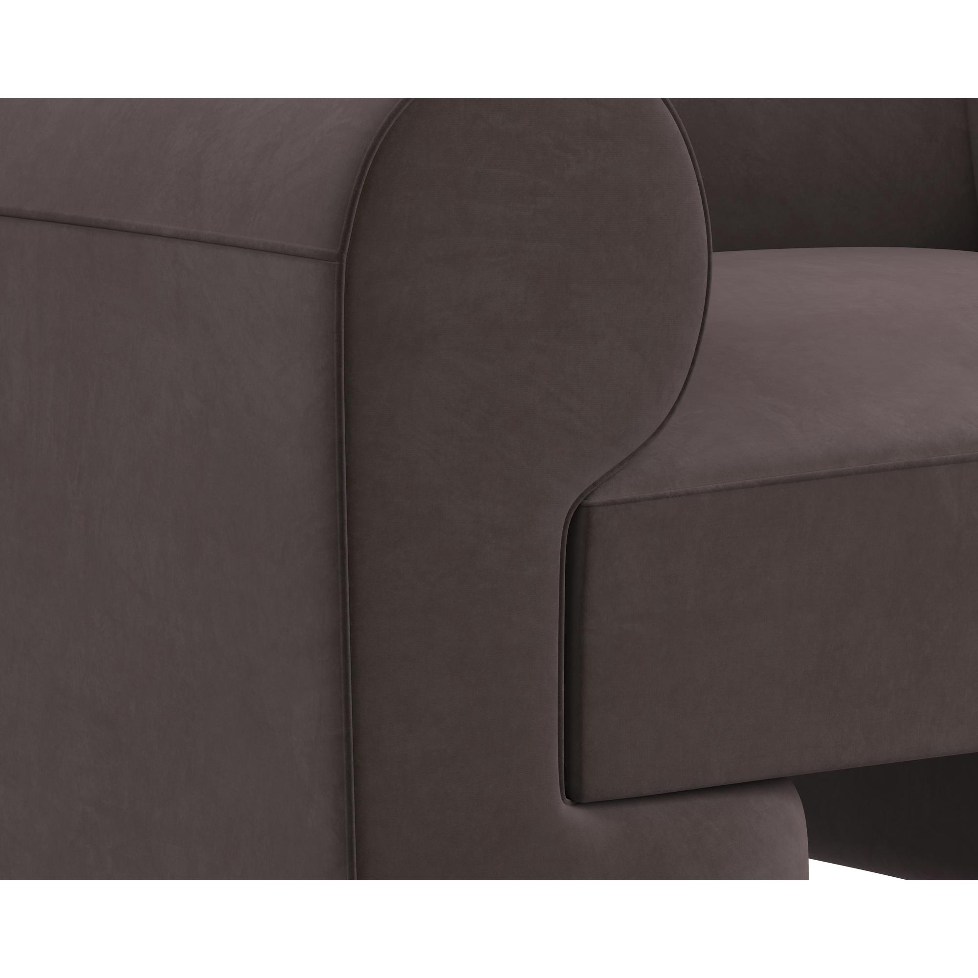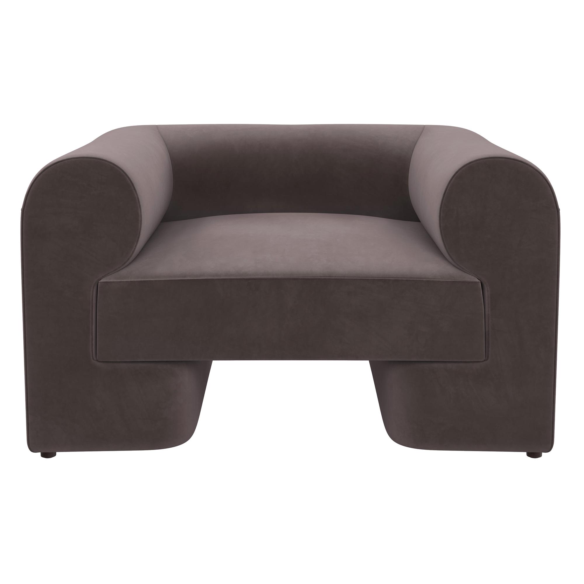 A bold take on contemporary style, this armchair will stand out in any space. Features rounded back and arm rests for ultimate comfort. Fully upholstered in luxurious meg ash, taupe and gold fabrics. Pair with coordinating sofa to complete the look.