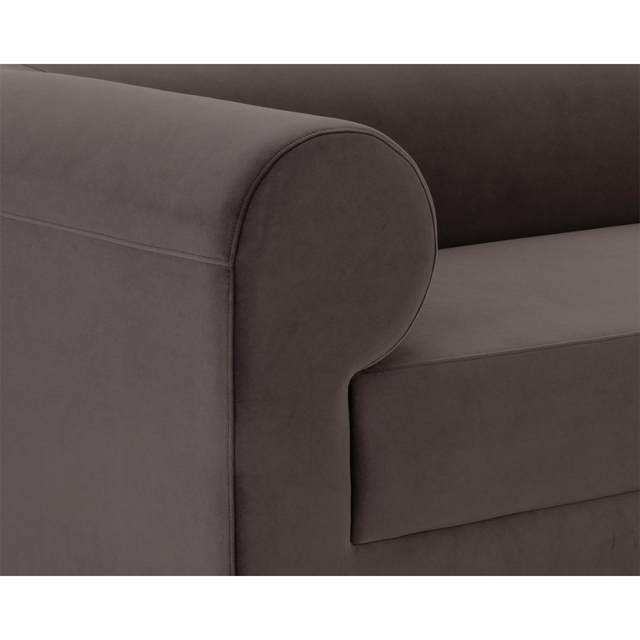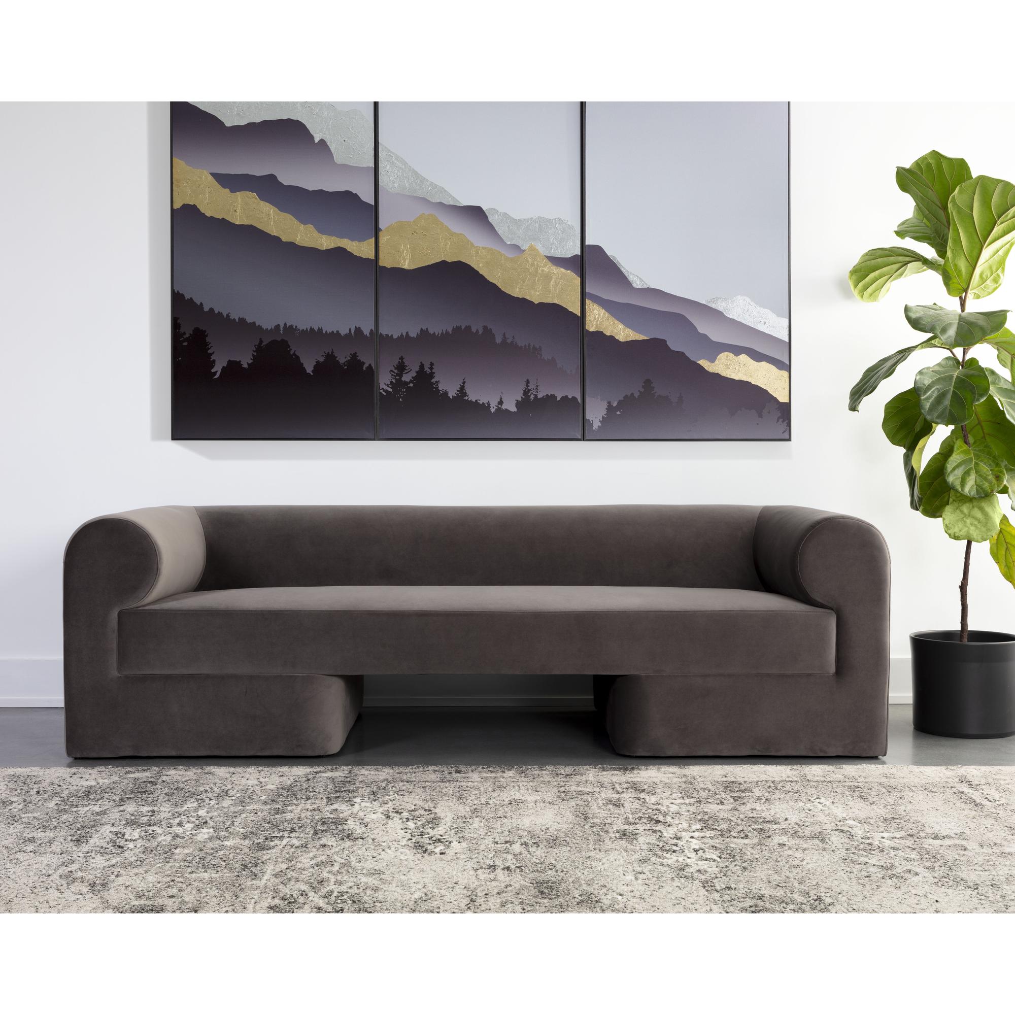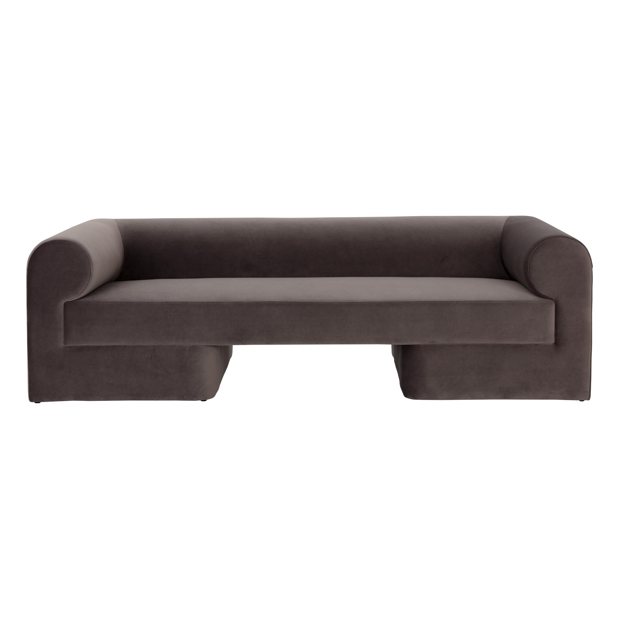 A bold take on contemporary style, this sofa will stand out in any space. Features rounded back and arm rests for ultimate comfort. Fully upholstered in luxurious meg ash fabric. Pair with coordinating armchair to complete the look.