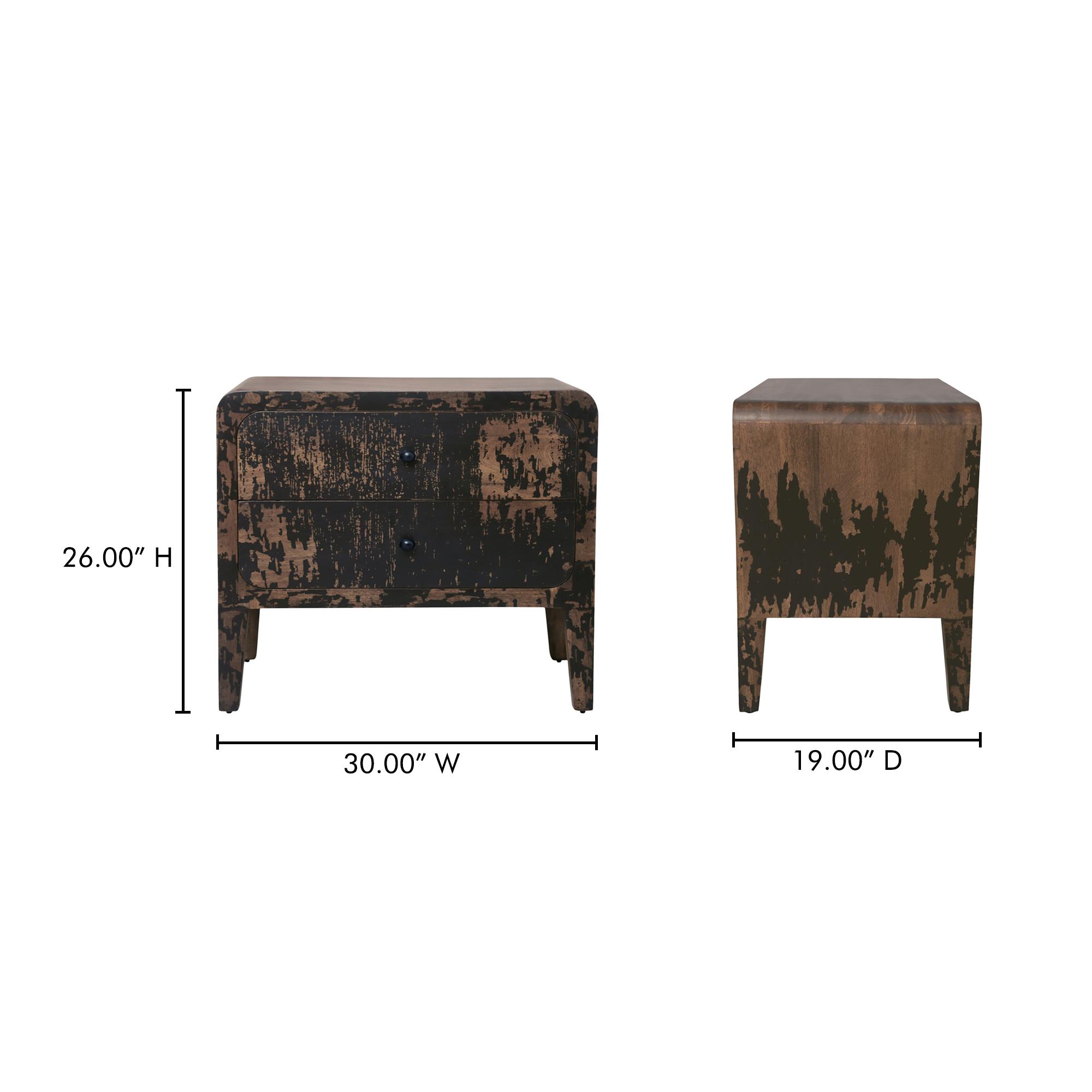 The Iris nightstand is crafted from mango wood with a carefully distressed finish and paired with minimal yet expressive hardware, paying homage to antique design while offering a fresh, contemporary edge. Its heavily distressed look captures a sense of history and character, making each piece uniquely its own. This piece combines structure and style, bringing a warm, rustic aesthetic to any bedroom.