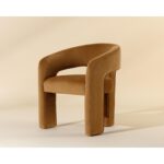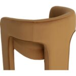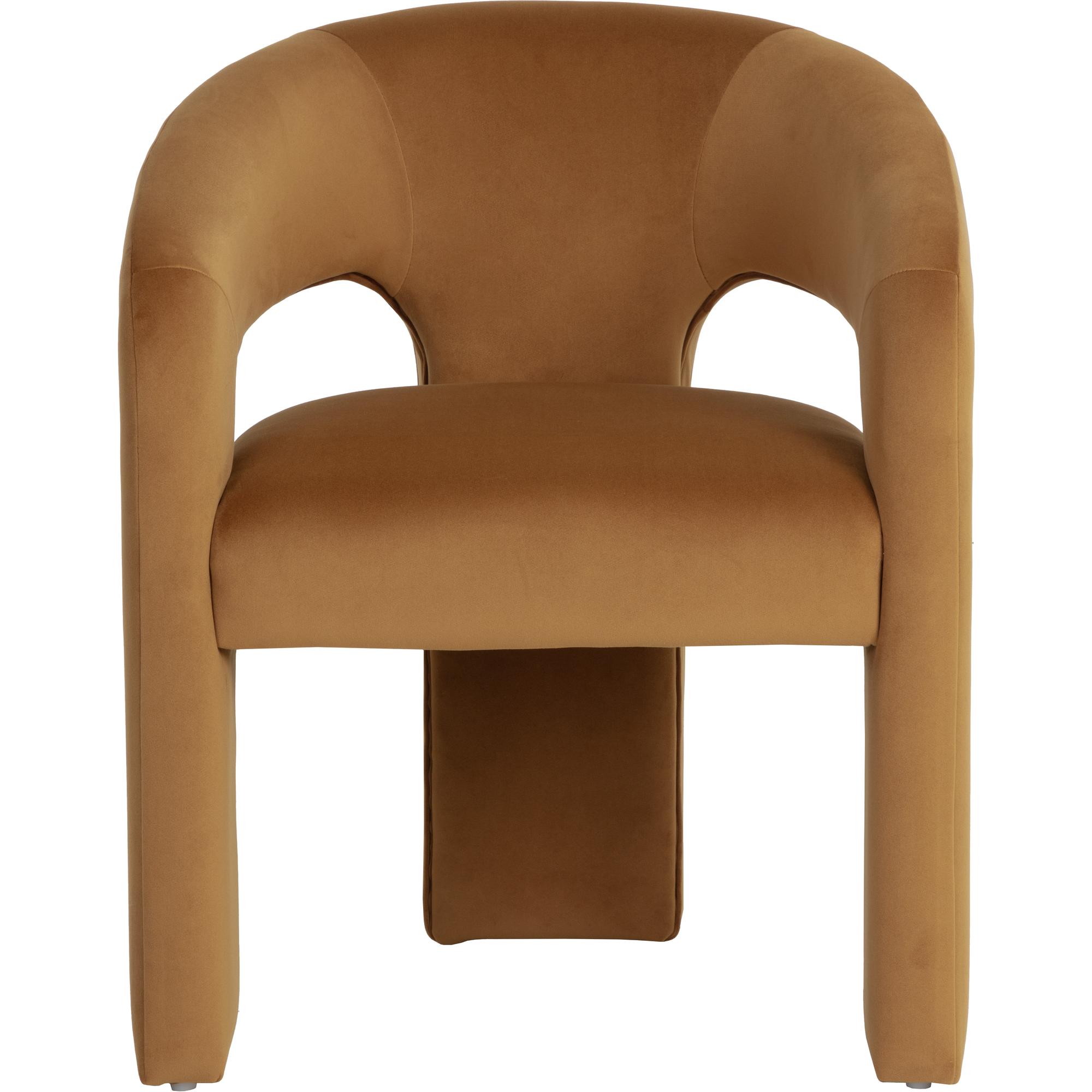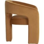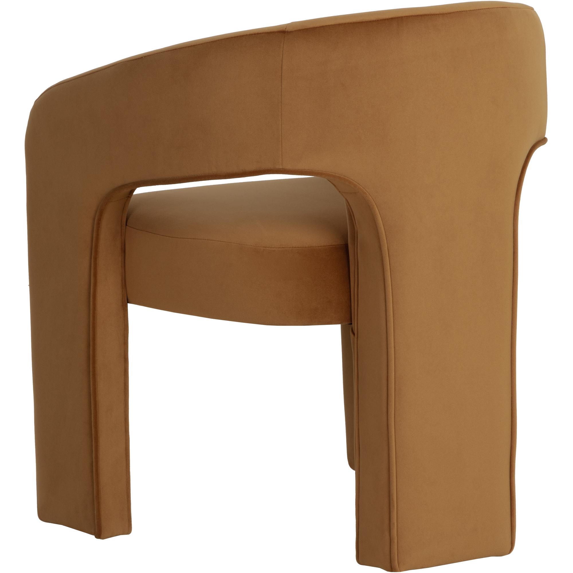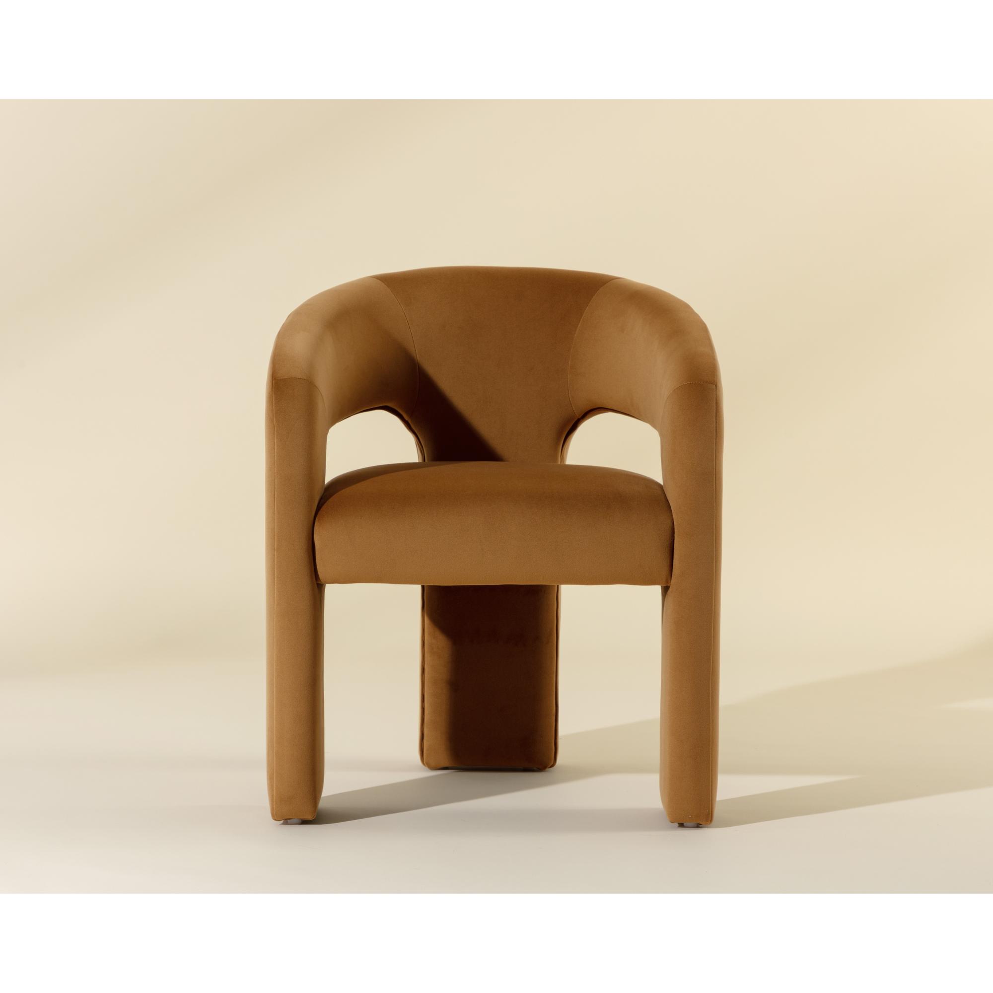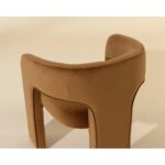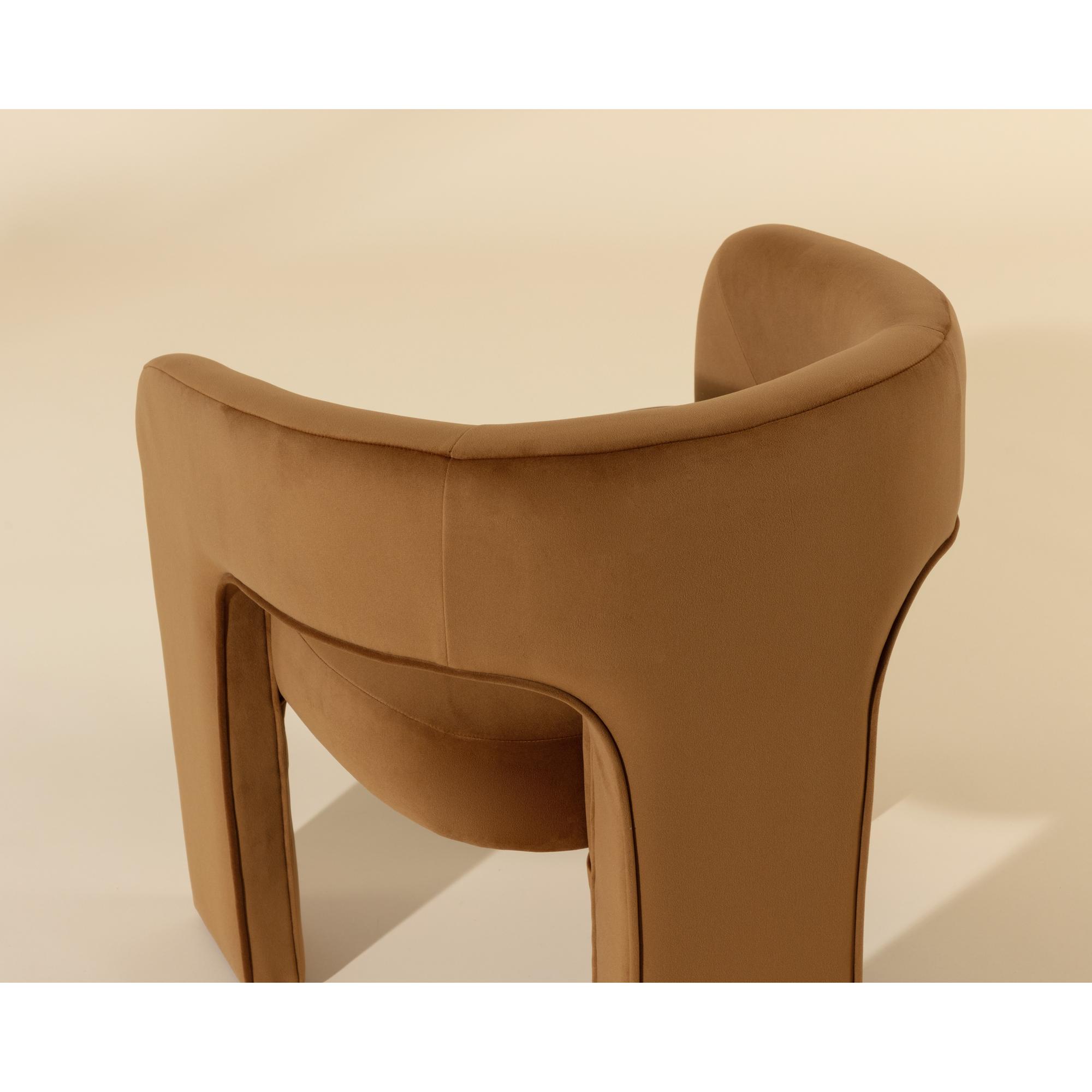 Clean lines and contoured arches add style and structure to this contemporary dining chair. Features a curved backrest and open back for optimal comfort. Eye-catching from all angles. Fully upholstered in ernst sandstone fabric.