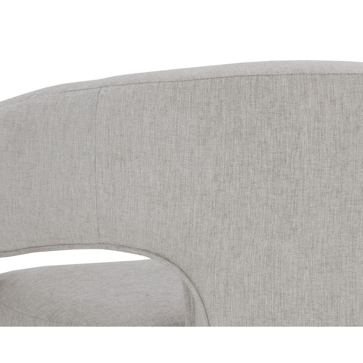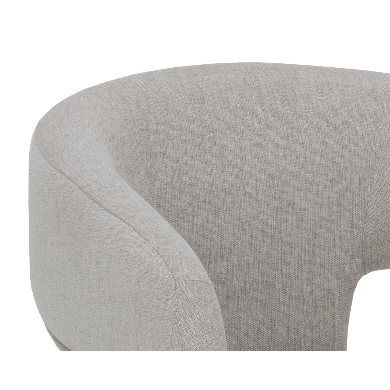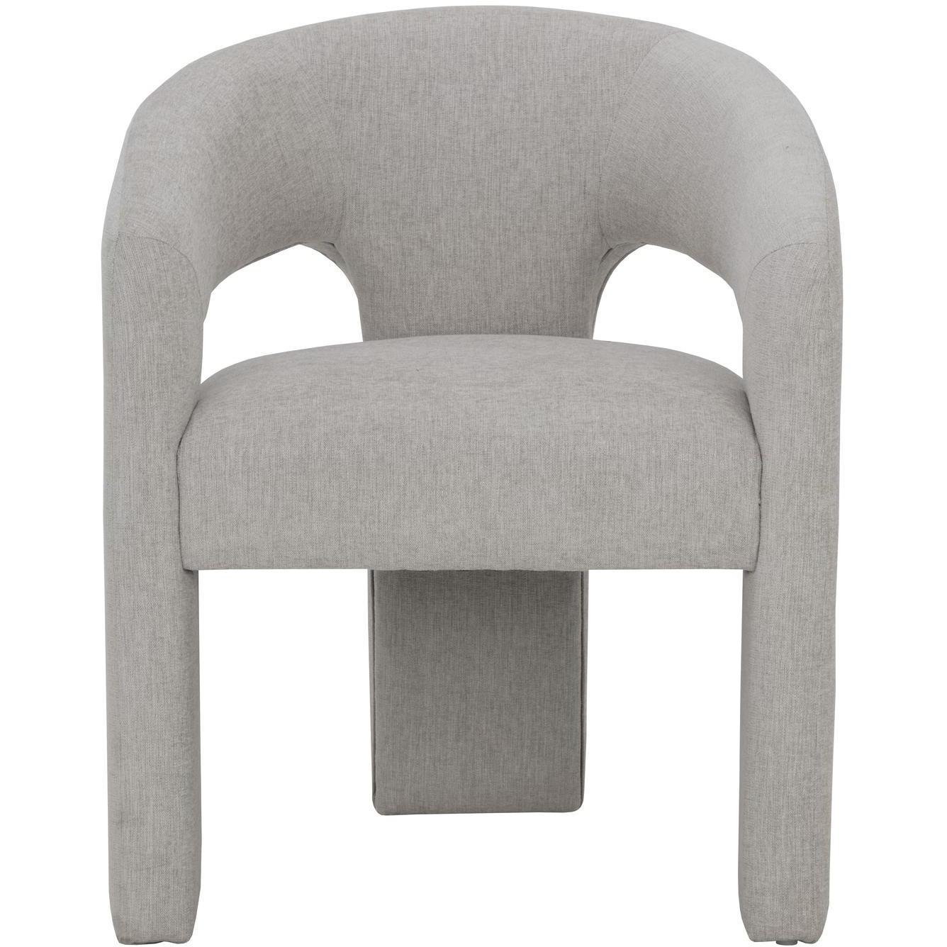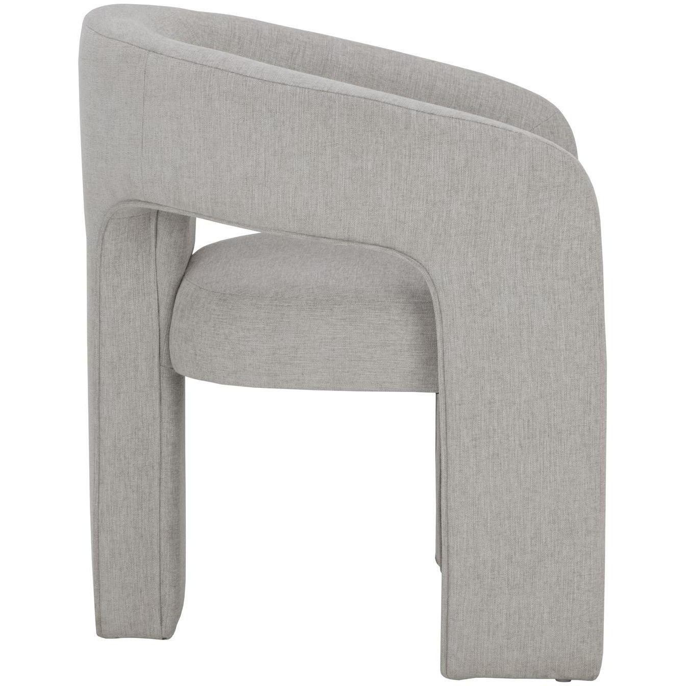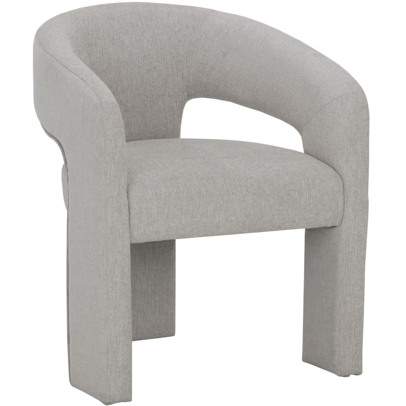 Clean lines and contoured arches add style and structure to this contemporary dining chair. Features a curved backrest and open back for optimal comfort. Eye-catching from all angles. Fully upholstered in ernst sandstone fabric. Lounge chair version also available.