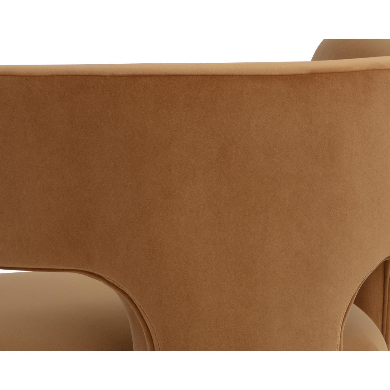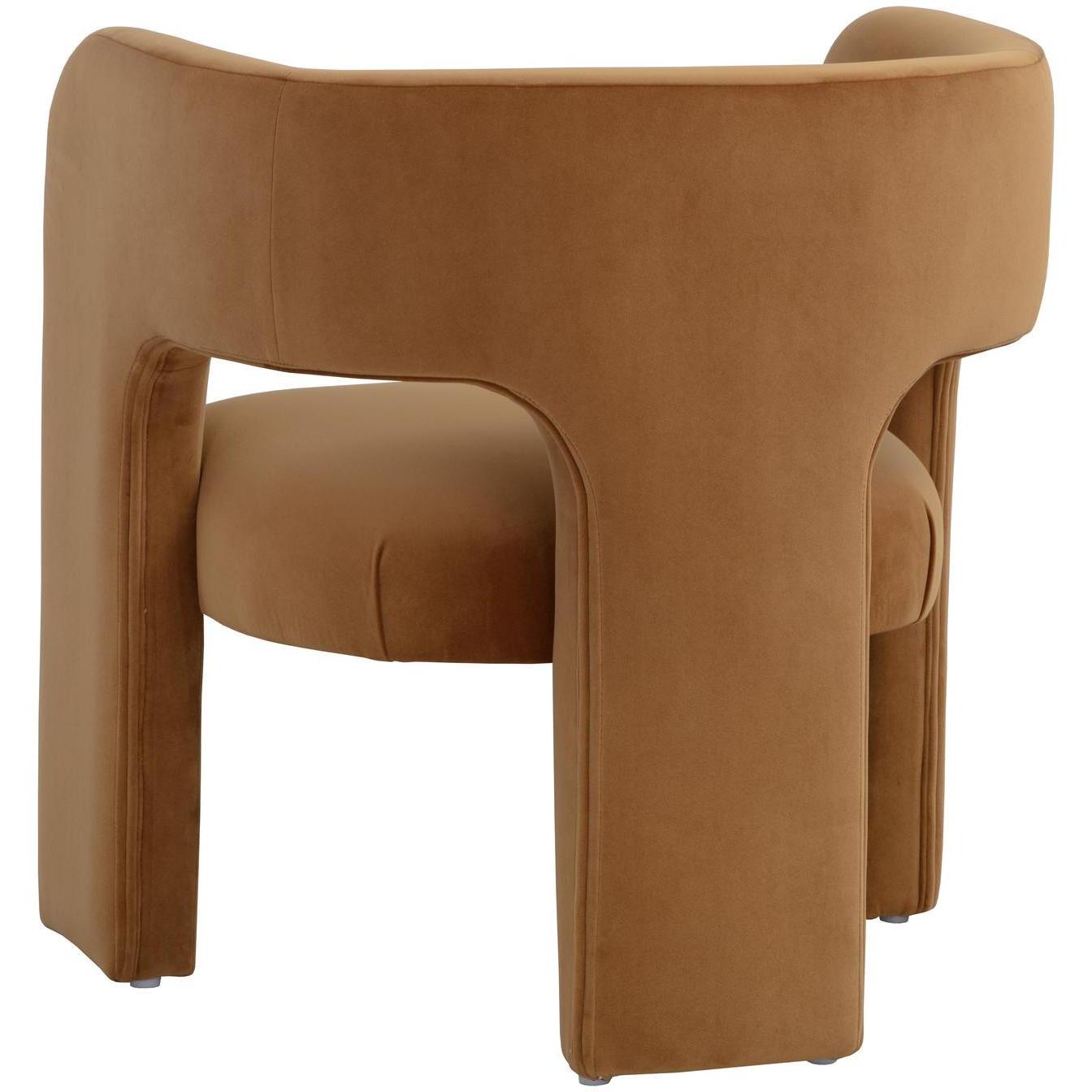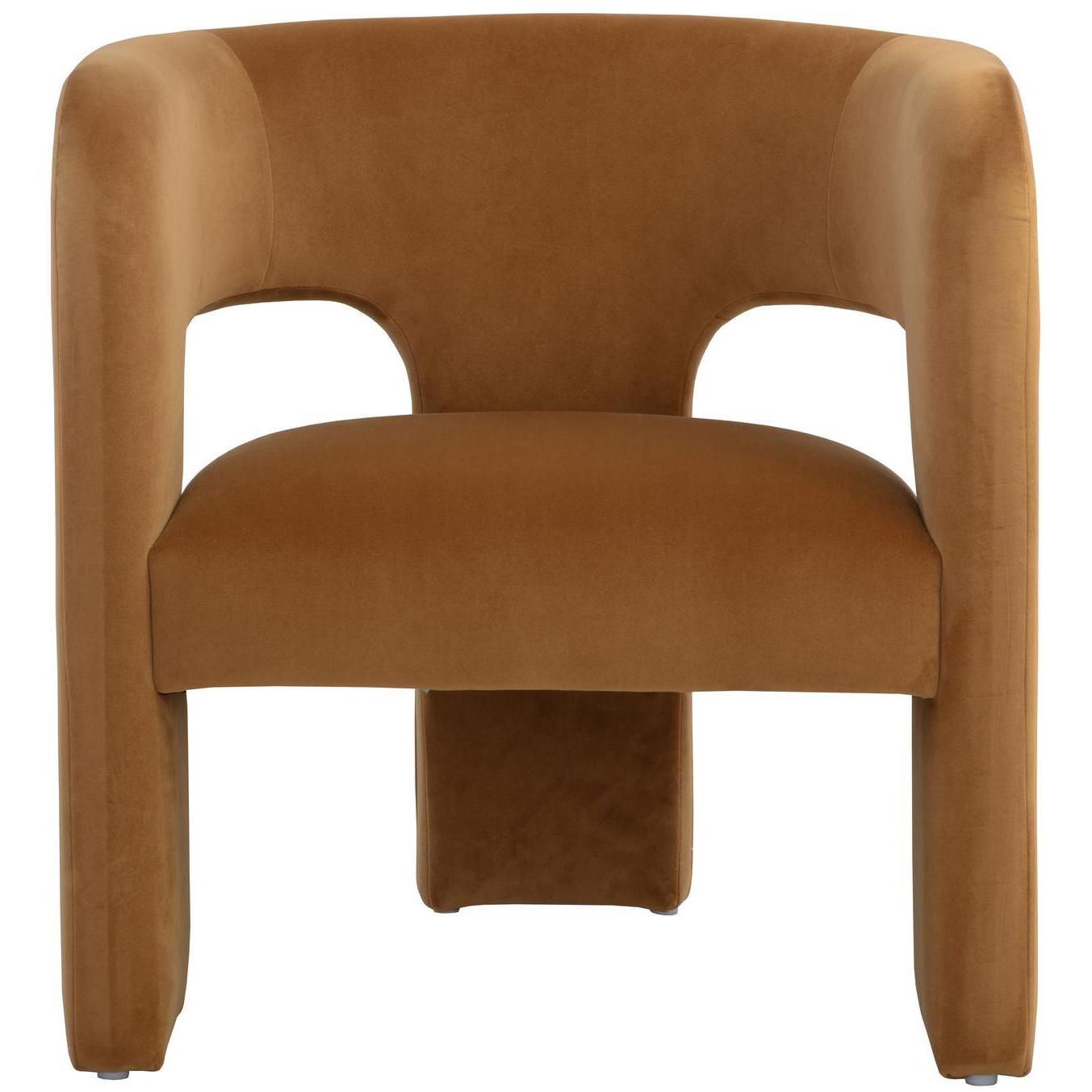 Clean lines and contoured arches add style and structure to this contemporary lounge chair. Features a curved backrest and open back for optimal comfort. Eye-catching from all angles. Fully upholstered in meg gold fabric.