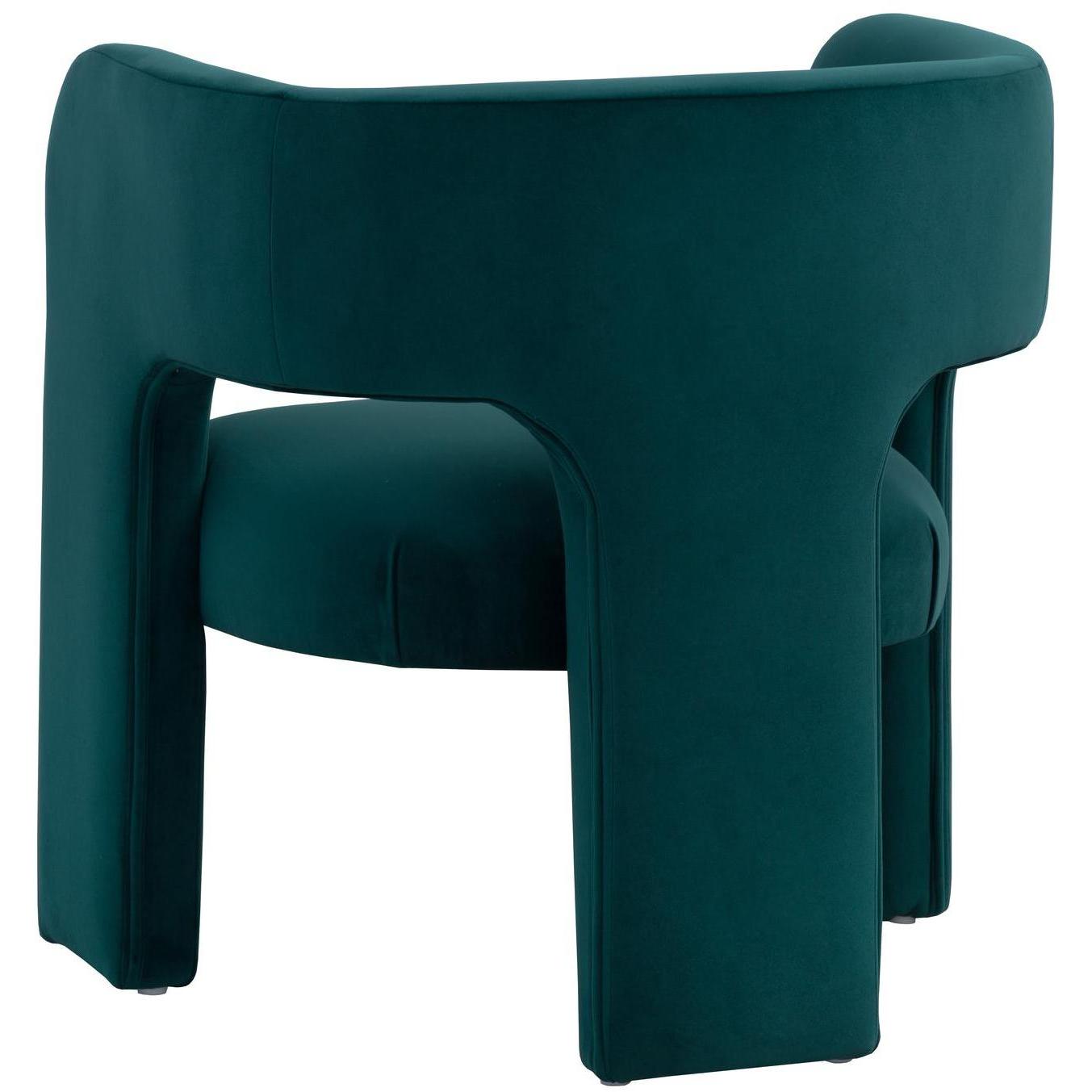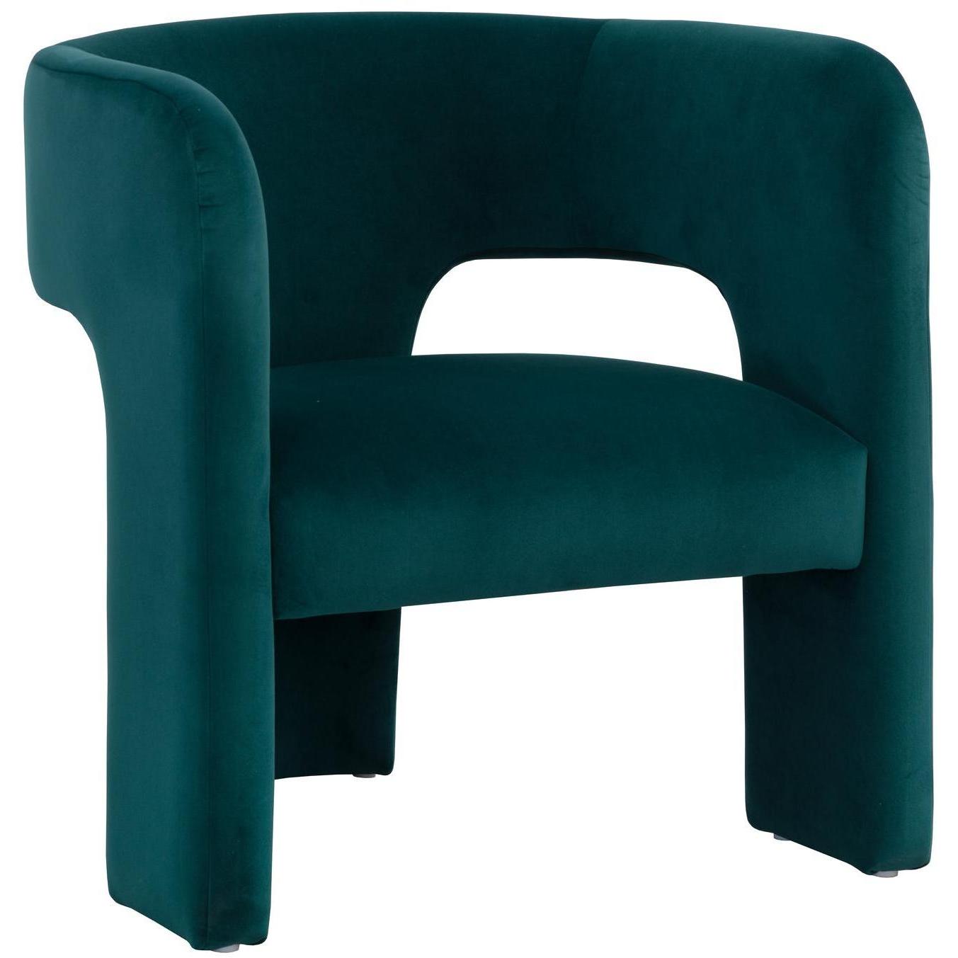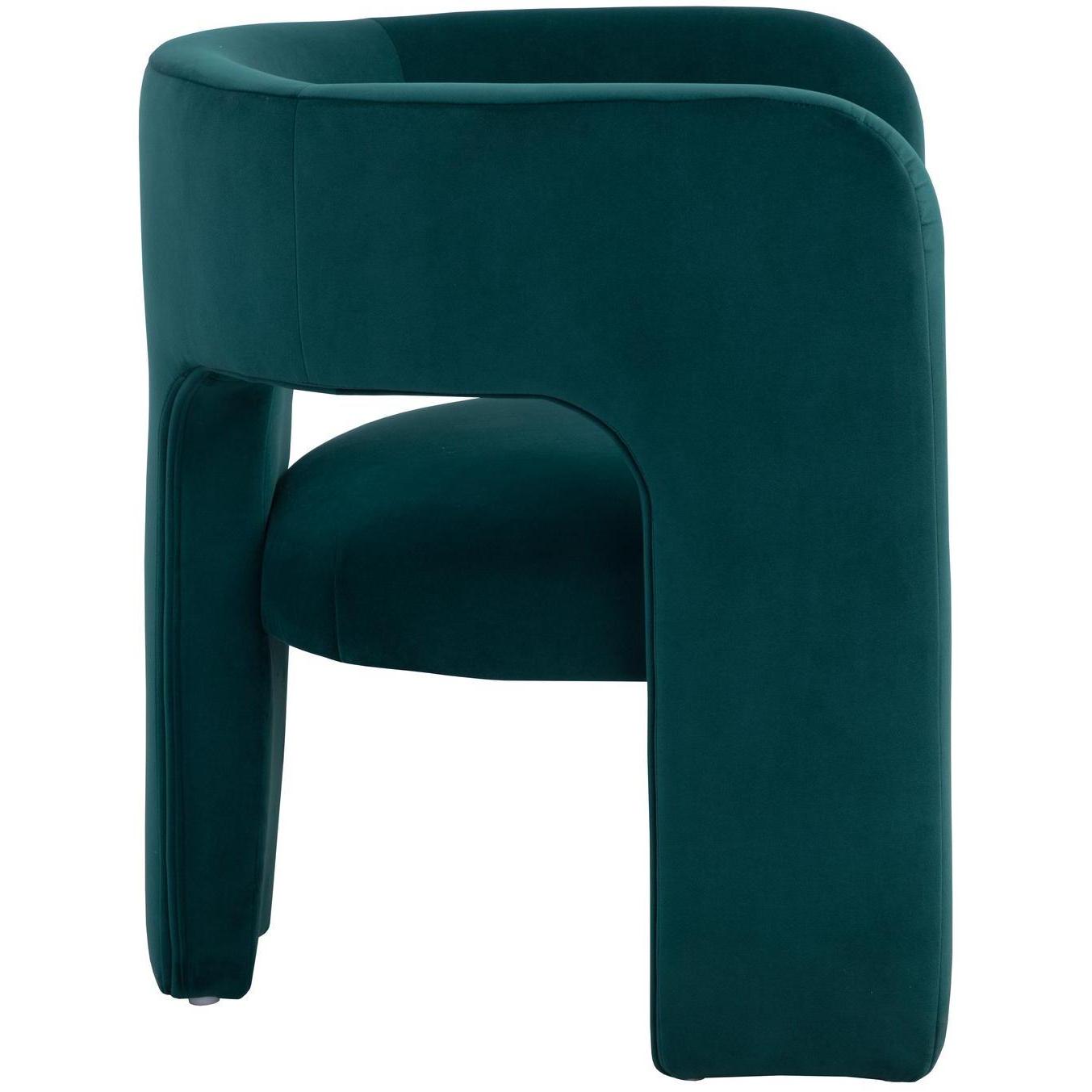 Clean lines and contoured arches add style and structure to this contemporary lounge chair. Features a curved backrest and open back for optimal comfort. Eye-catching from all angles. Fully upholstered in meg teal fabric.