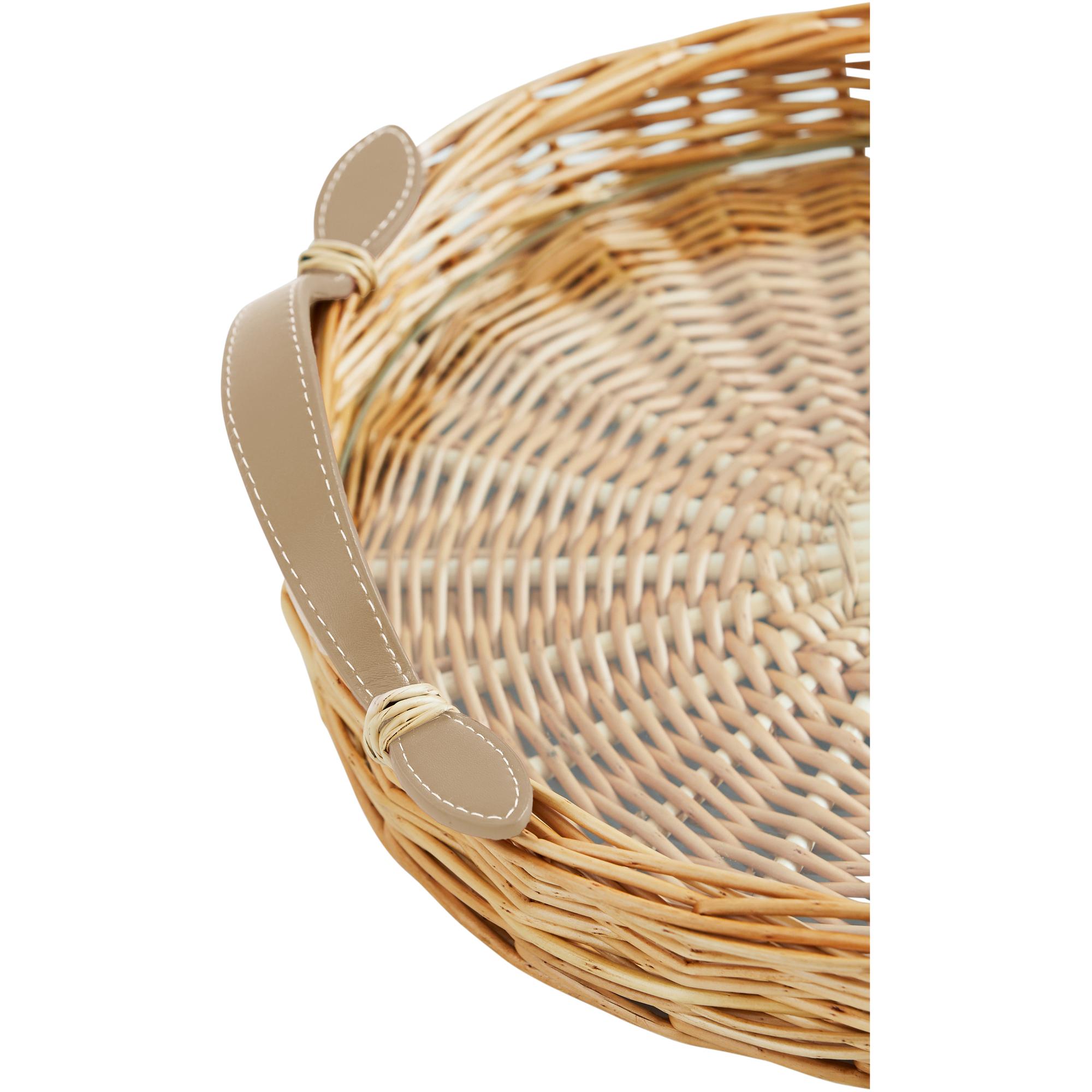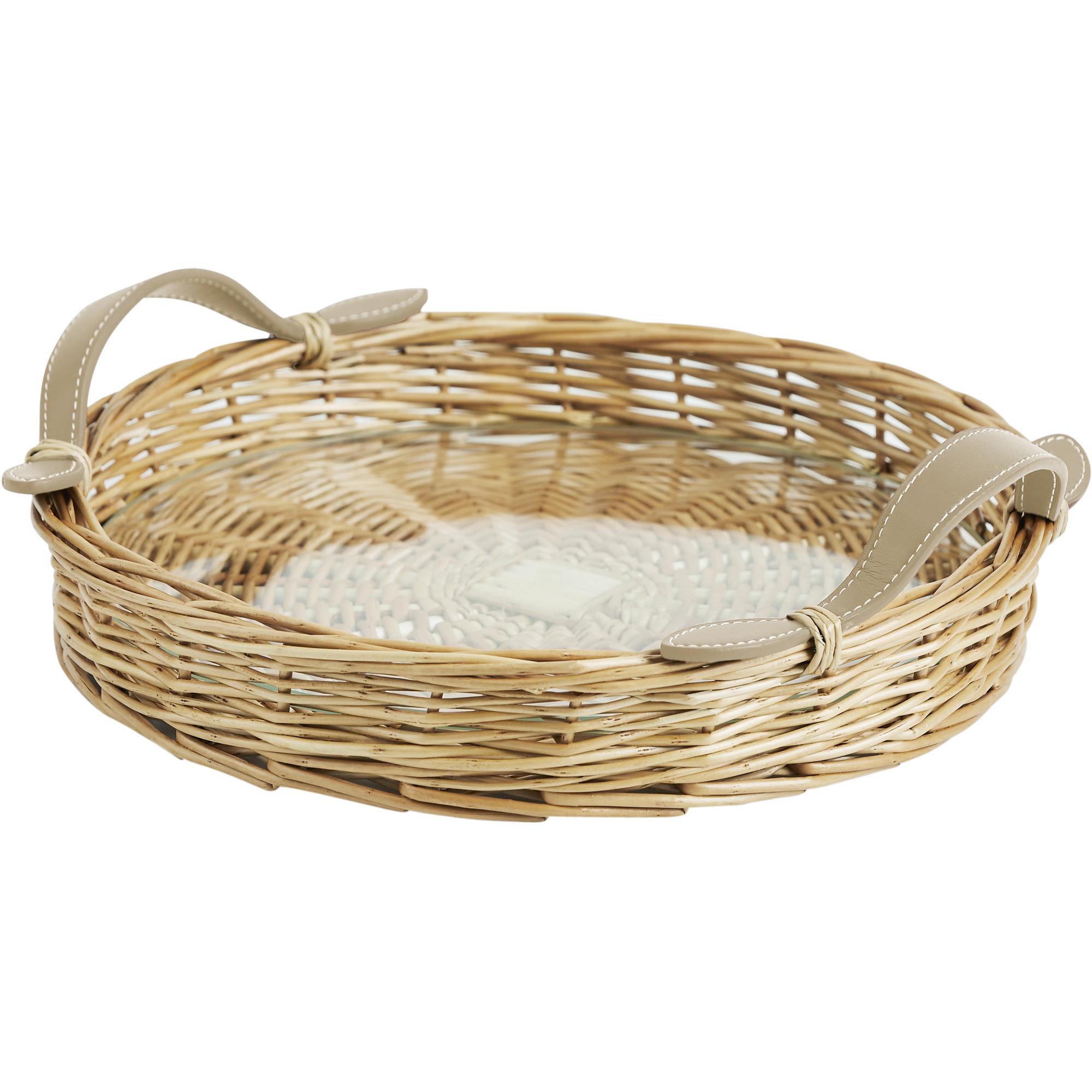A handsome handled tray is one of Amanda’s must-haves for serving drinks, staging a bedside table or corralling supplies on the desktop. These Round Island Trays are hand woven of willow and finished with fine stitched mocha colored leather handles. A tempered glass insert catches drips and protects your tray’s natural finish. Large; 24″ D x 2.75″H