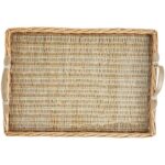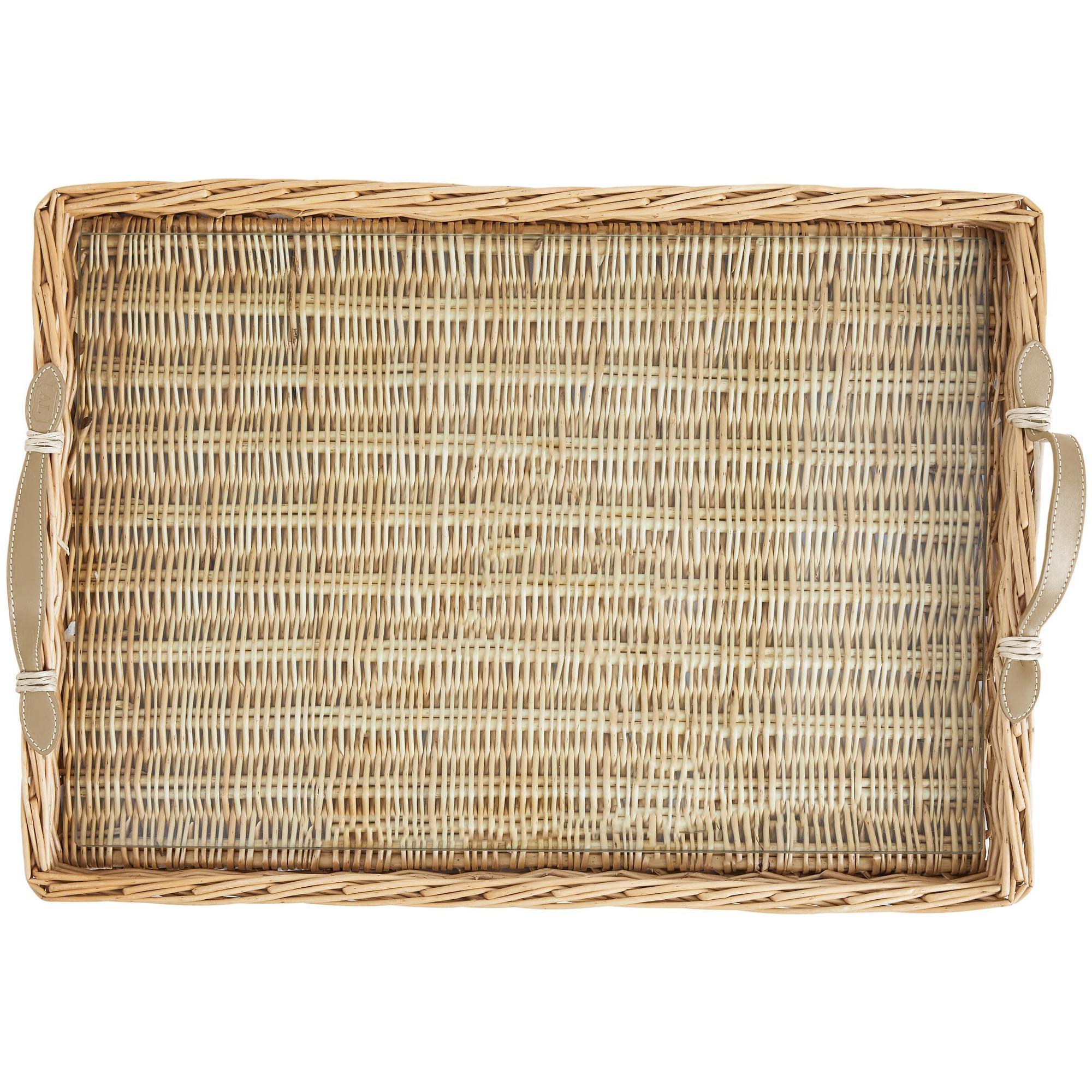 Amanda Lindroth’s Signature Island Tray made from natural willow with fine mocha colored leather handles and a fitted tempered glass insert. Smaller sizes work beautifully as a bedside table or desk accent. Large sizes function with equal ease as ottoman decor or for carrying cocktails. Small: 12″L x 9″W, Large: 23 1/2″L x 14″W