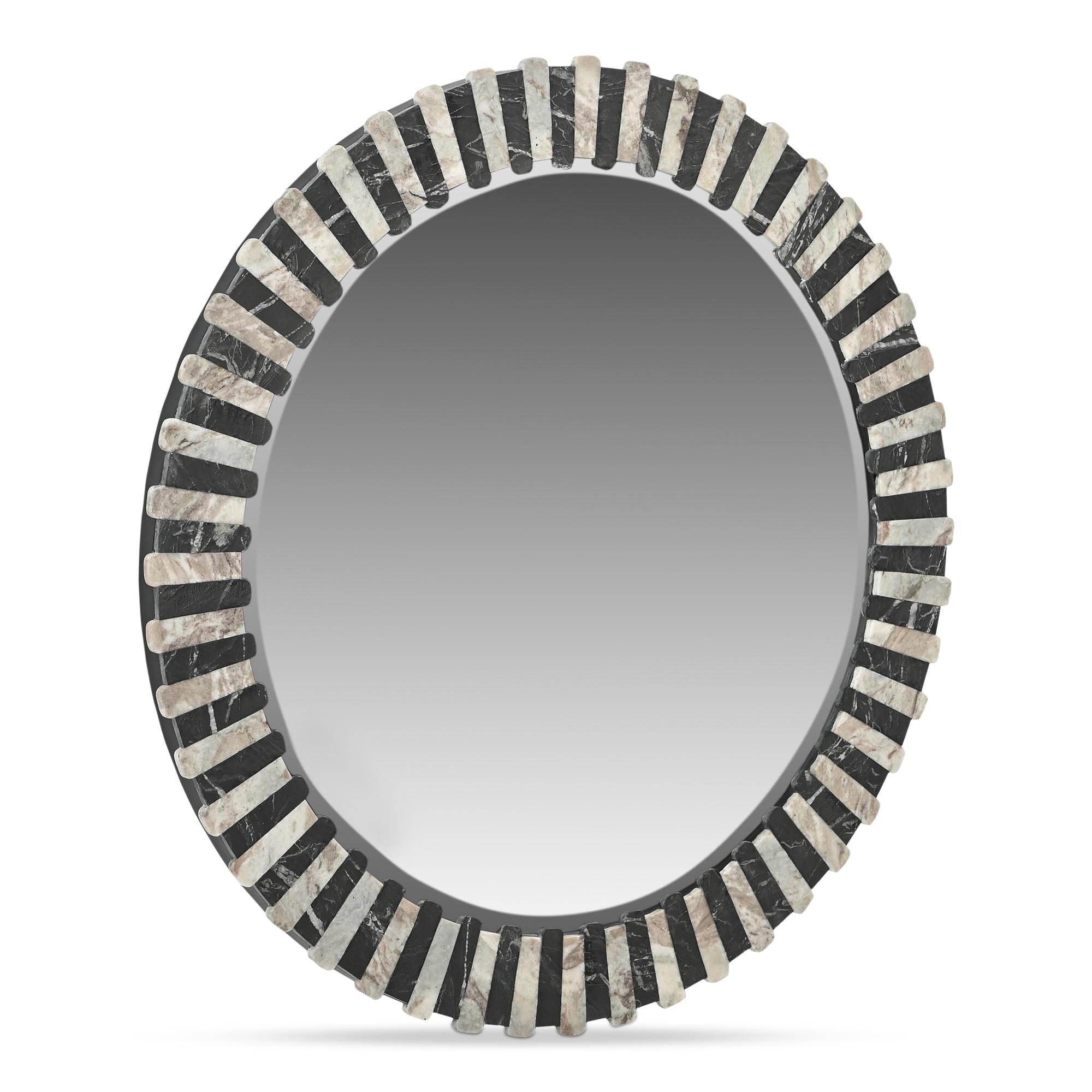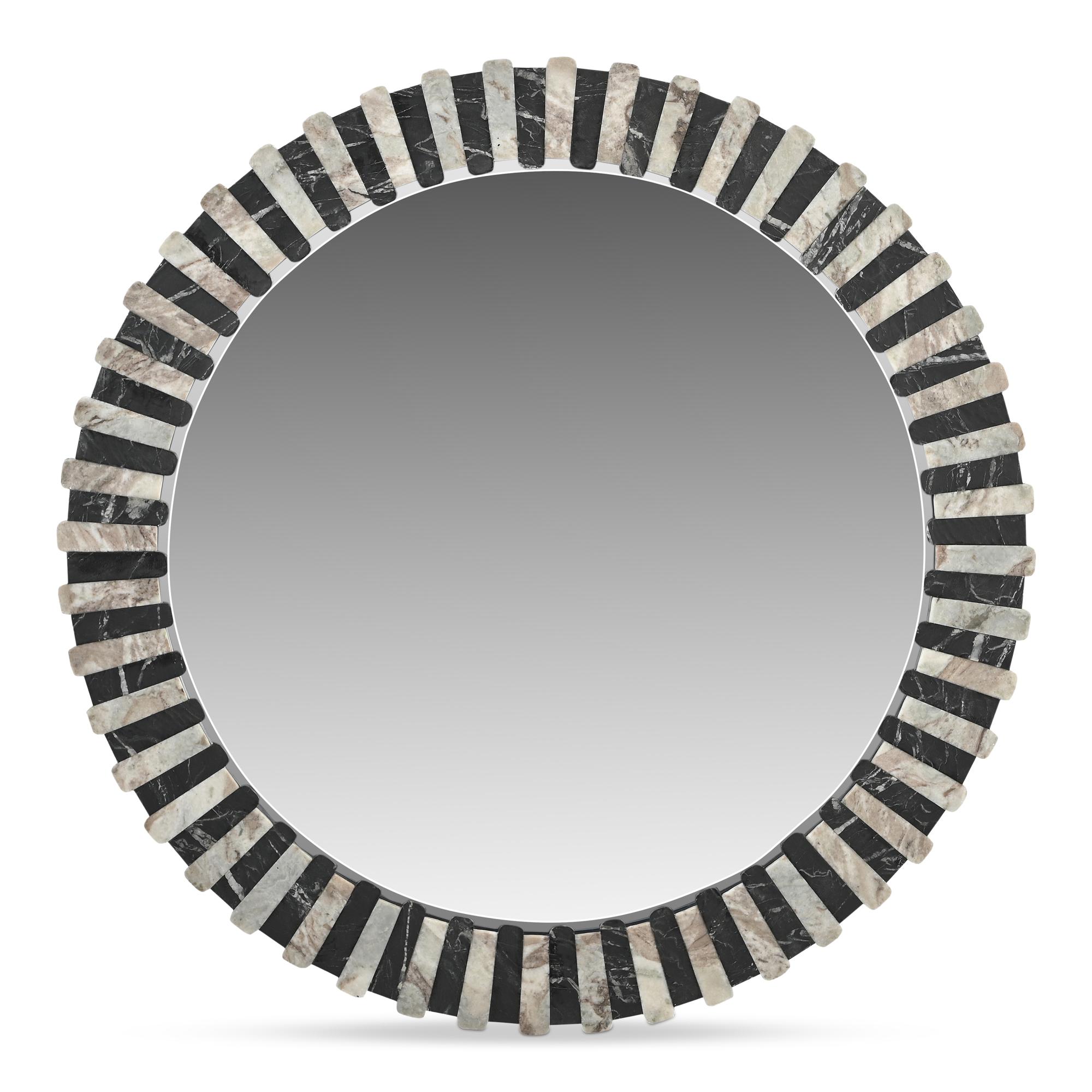 The Isolde mirror marries Art Deco elegance with contemporary style, featuring hand-laid Torrento and black marble with a unique leathered, matte finish. Designed for modern sensibilities yet drawing from classic inspiration, its alternating light and dark pattern adds a striking contrast.