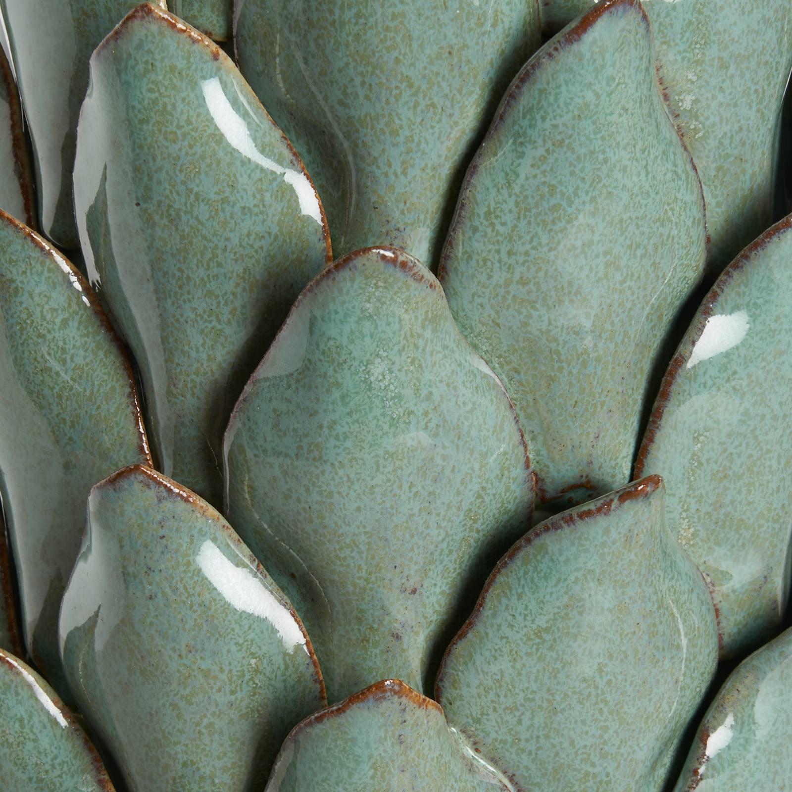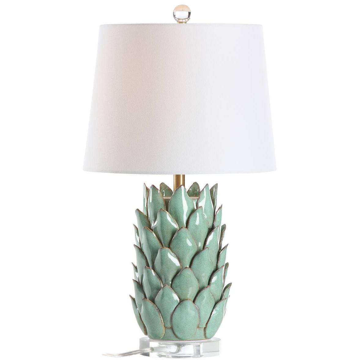 The Issey Table Lamp captures organic beauty with sculptural elegance. Its ceramic base, inspired by layered artichoke leaves, features a soft seafoam green glaze with hand-applied texture and subtle gold accents. Resting on a clear acrylic base and topped with a crisp white linen shade, the Issey Lamp brings a touch of nature-inspired artistry to any space. Perfect for adding texture and sophistication to coastal, transitional, or modern interiors.