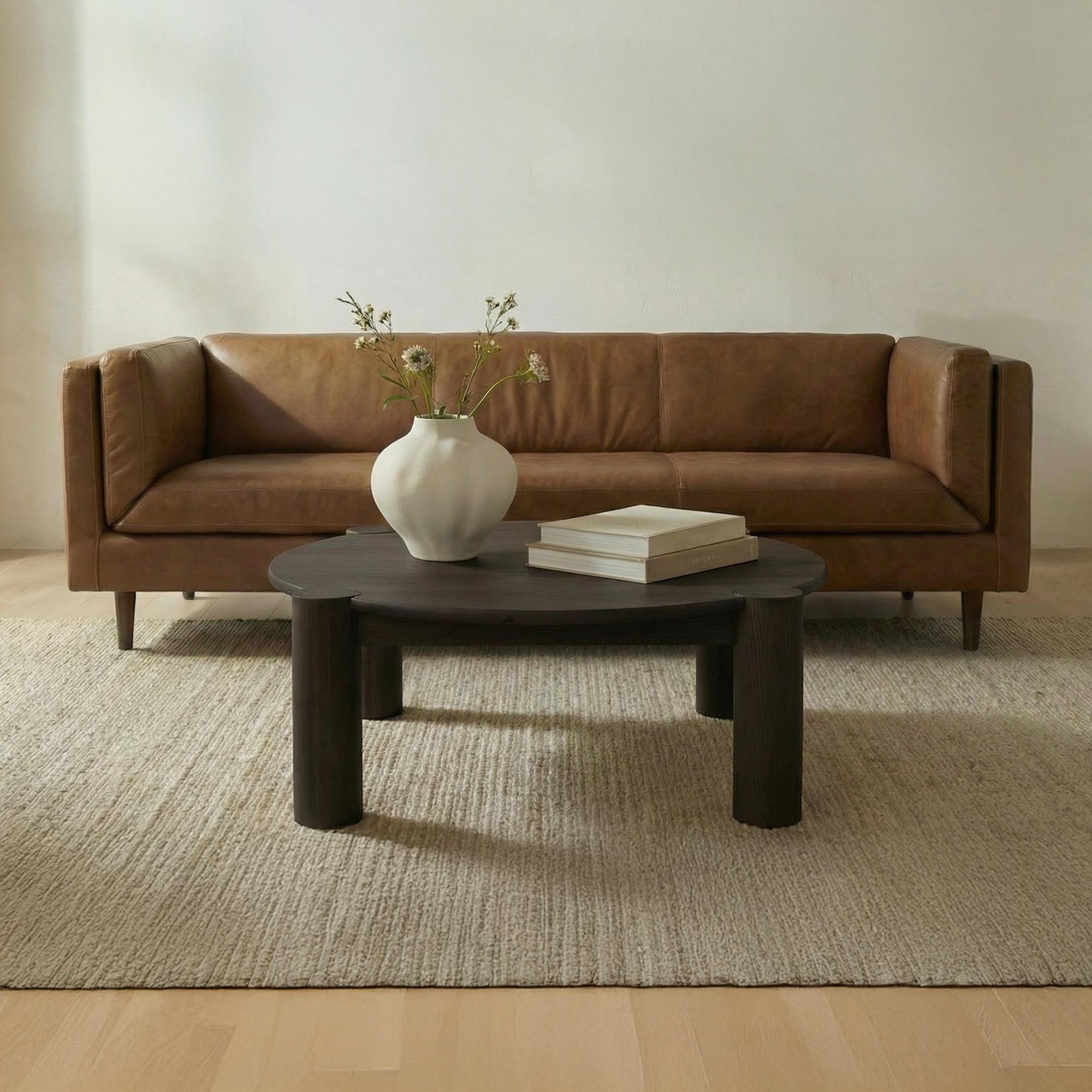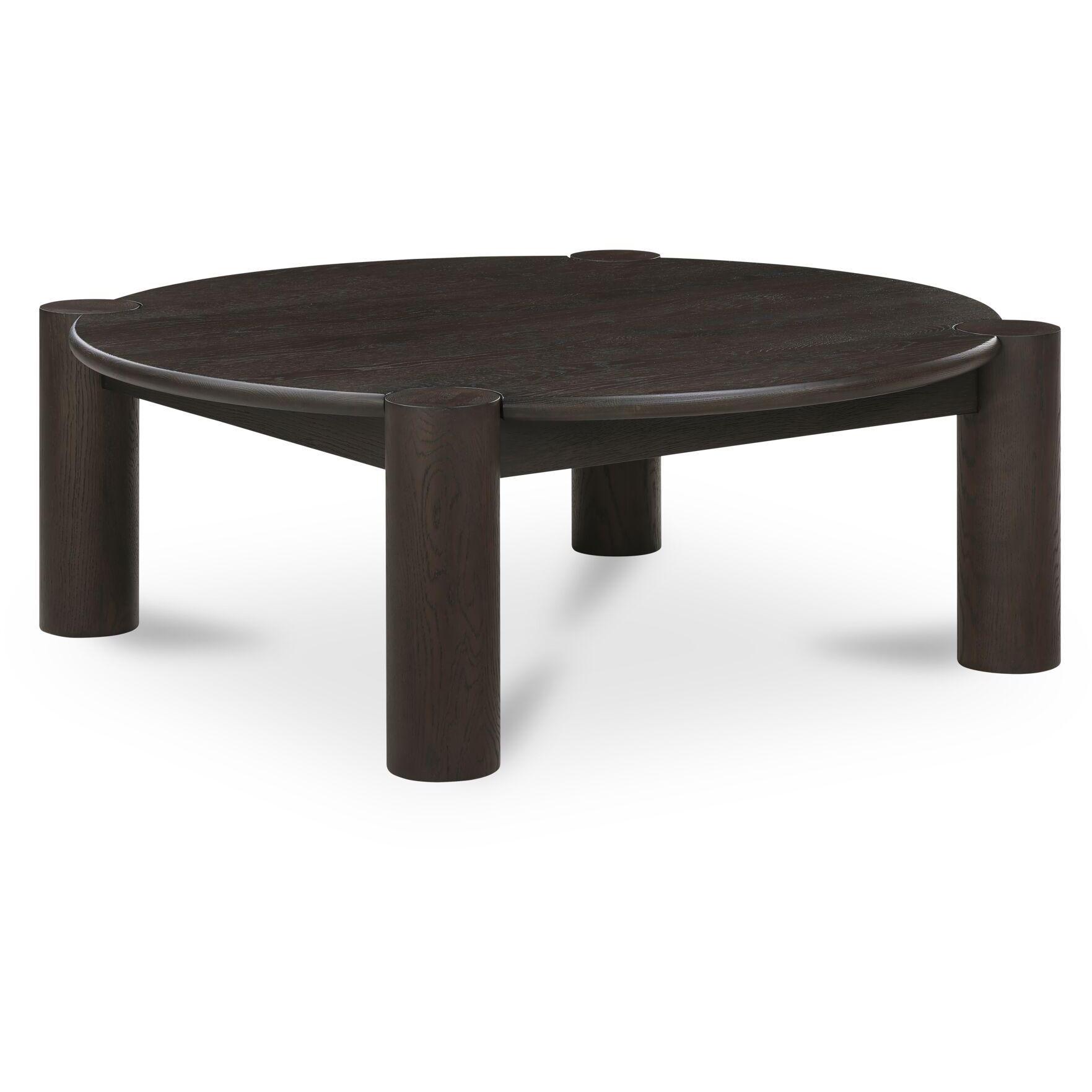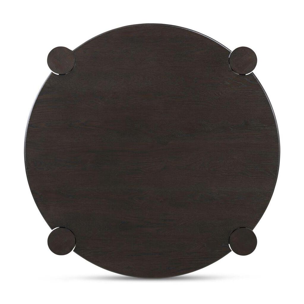 Built to round things out. A solid oak top with a smooth bullnose edge meets four sculptural column legs in a bold joinery detail that’s all craft and confidence. The legs add weight and definition to the rounded form, striking a balance between soft curves and strong structure. Finished in a wire-brushed dark brown, it’s grounded, sculptural, and made to hold the room and the conversation.