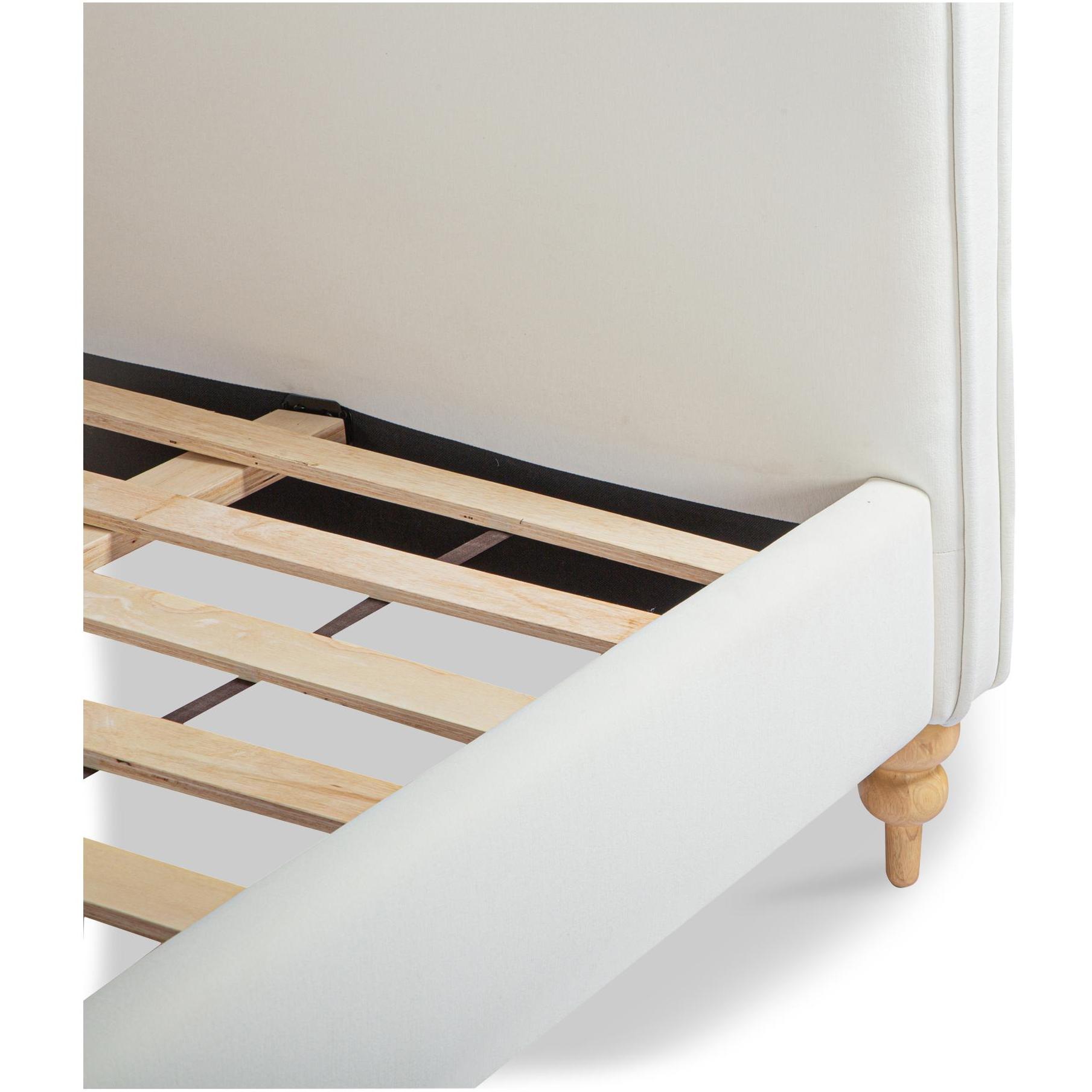 The Jacqueline bed embraces a Provençal-inspired design with a gently waved headboard and footboard, fully upholstered in cream. Geometric stacked legs of solid ash add a contemporary twist to traditional charm. Meticulously crafted with a padded headboard, this bed offers both comfort and durability, transforming the bedroom into a haven of tranquility.