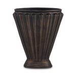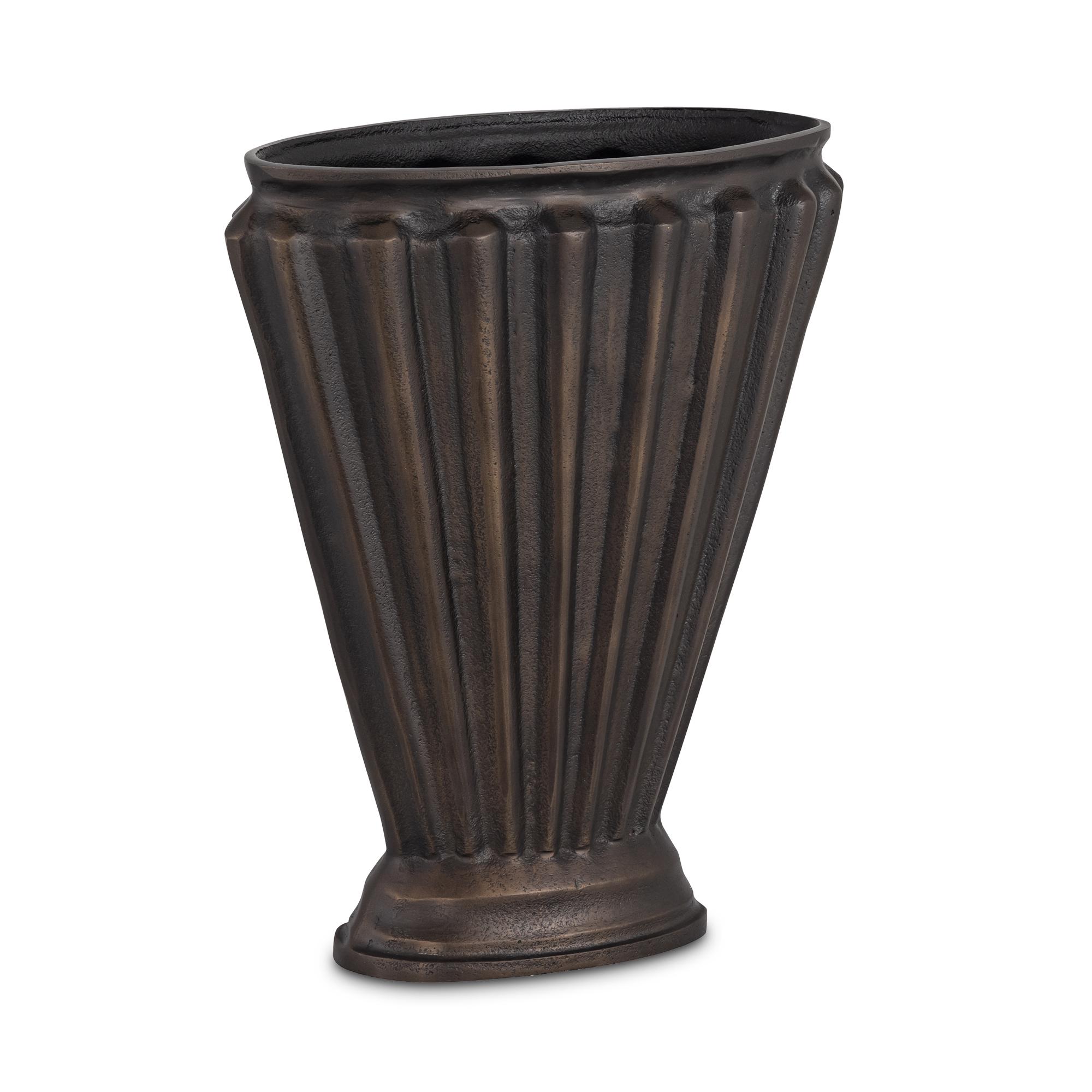 Echoing Art Deco silhouette, the Jade vase in an aged brass cast aluminum stands as a testament to timeless elegance. Marrying modern form and decorative motifs, the scalloped fan shape creates a mesmerizing interplay of light and shadow. Exquisite channel details evoke bygone luxury, while the elongated opening allows for striking floral arrangements.