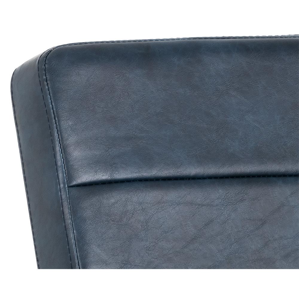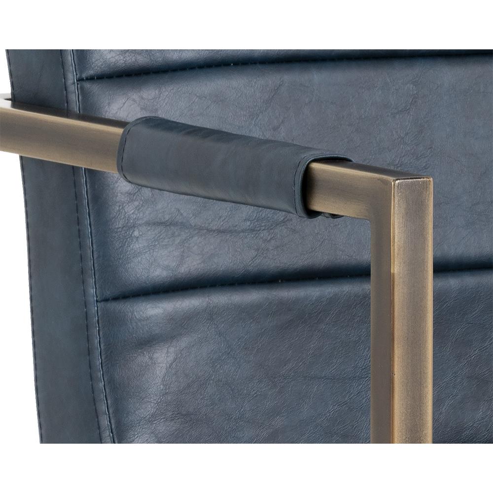 A retro inspired armchair stocked in masculine vintage blue faux leather with a rustic bronze steel frame and cantilever base. Can be placed in transitional and contemporary dining, living and office spaces. Handle With Care: This design has been crafted with faux leather. Faux leather is manufactured to reflect the natural characteristics of leather; as such, colour variations, markings, wrinkles, grooves, and light scratches are appreciated characteristics. No two pieces will be alike.