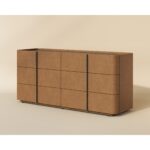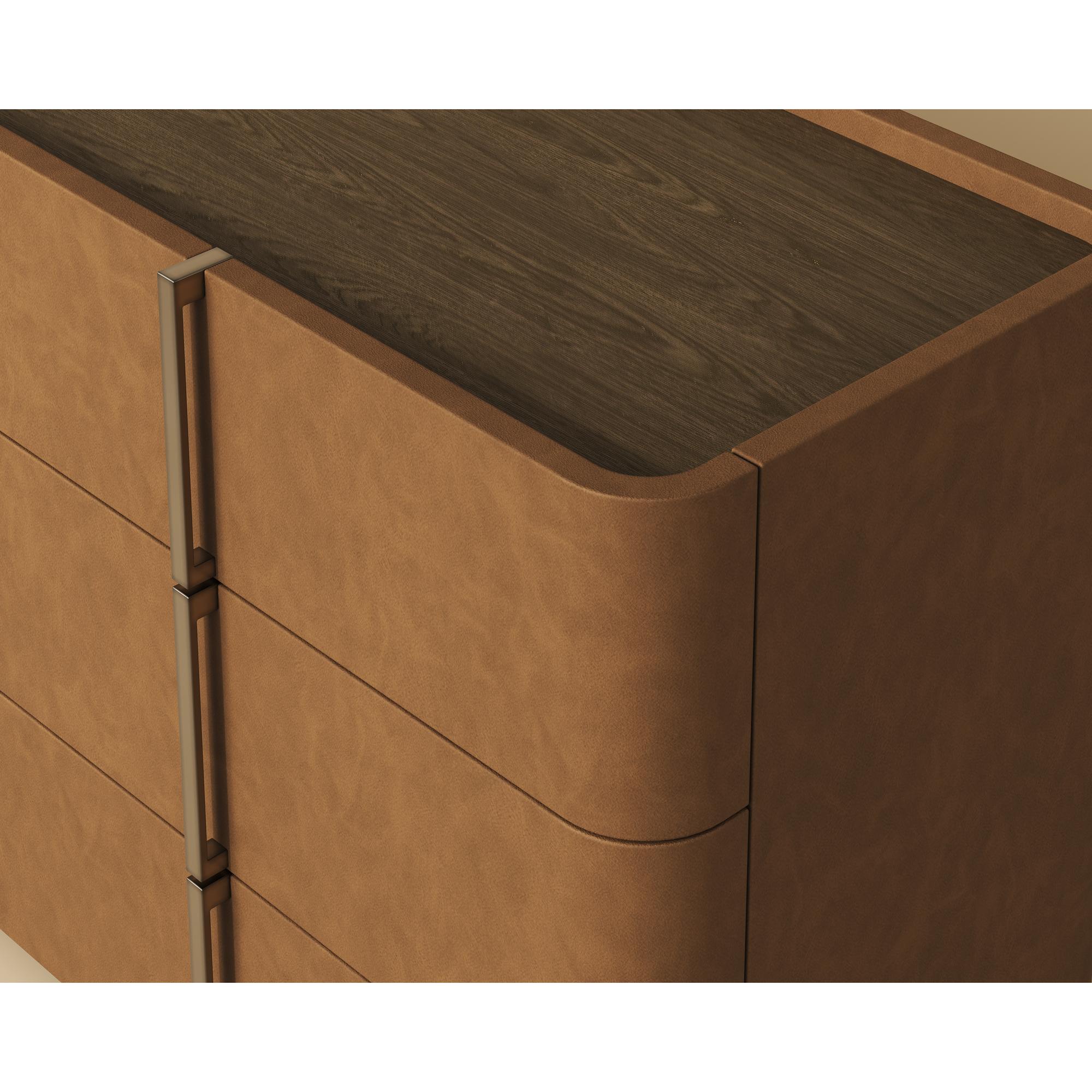 This contemporary dresser is defined by its beautiful and gentle curves. Wrapped in cream faux leather with a brown oak veneer tabletop that is sure to impress. Includes six drawers and completed with a solid acacia wood base.