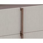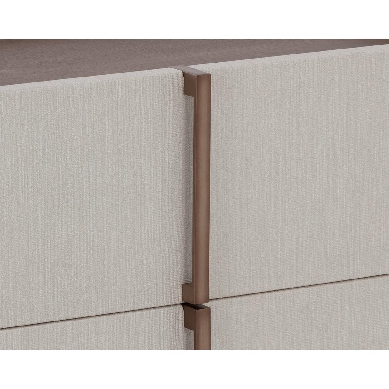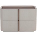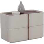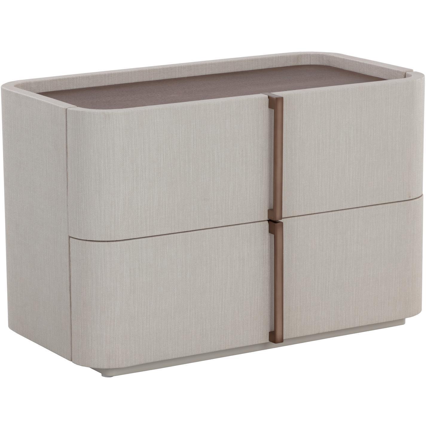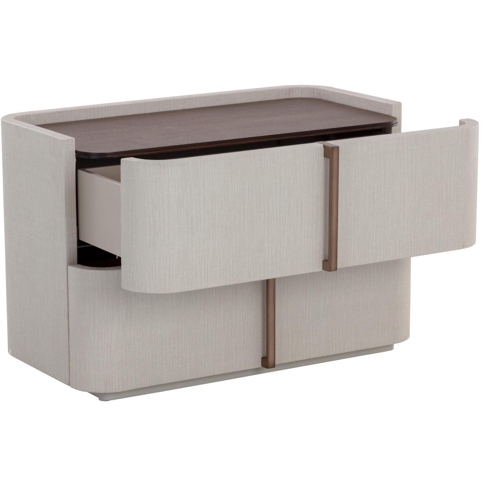 This contemporary large nightstand is defined by its beautiful and gentle curves. Wrapped in cream faux leather with a brown oak veneer tabletop that is sure to impress.