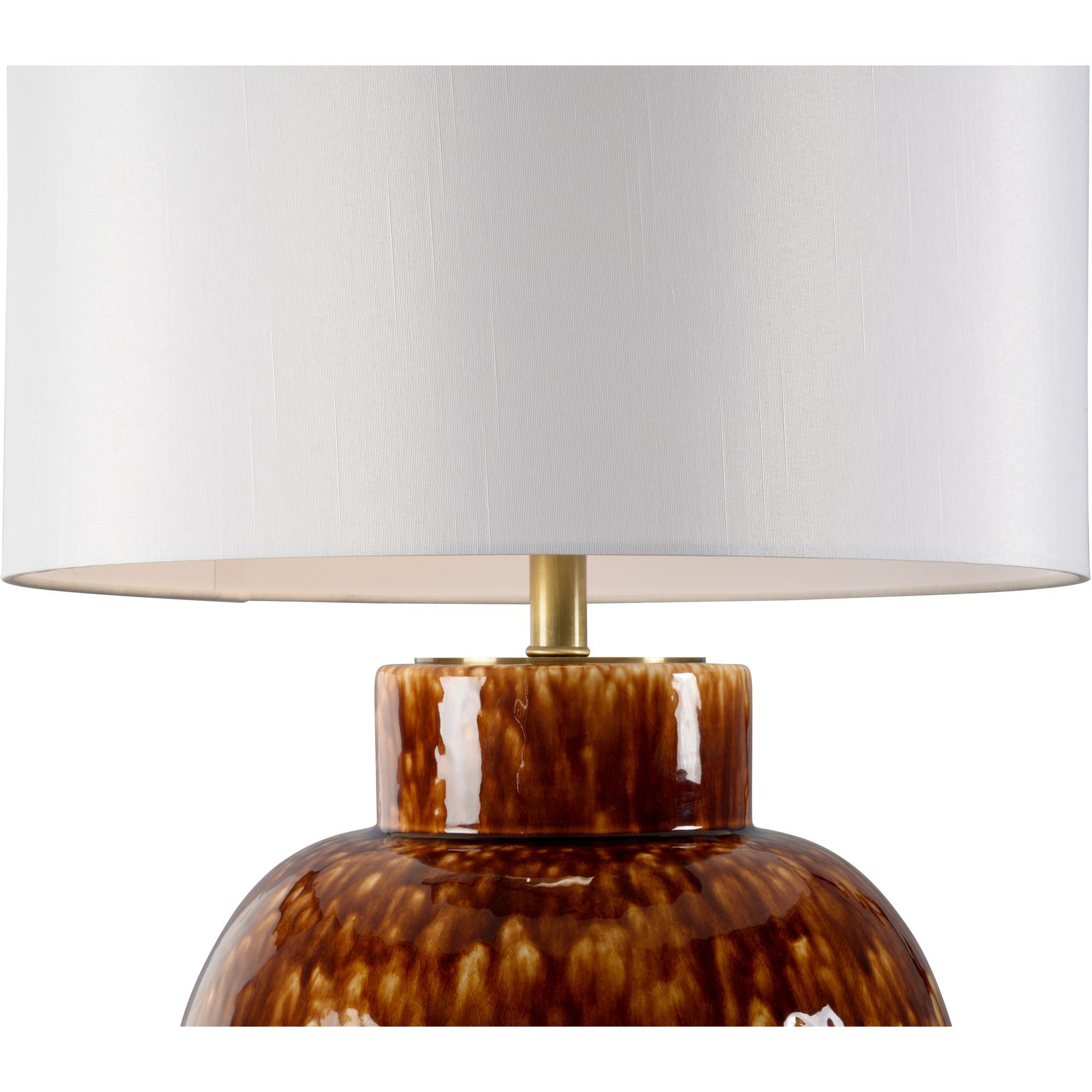 Offering modern and traditional beauty, the Tortoise Ceramic Vase Lamp is perfect for adding warmth and style to any setting. Made of ceramic with a glazed finish, gold accents, and white round fabric shade.