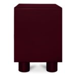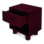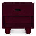 The Jolene nightstand infuses the bedroom with a touch of vibrant elegance. This deep red nightstand, expertly crafted with a rubberwood frame, offers both style and practicality. The soft-close drawer and open shelf provide versatile organization options. Playful legs and a paired-back frame with a coordinating handle create a charming silhouette that brings personality without compromising sophistication.
