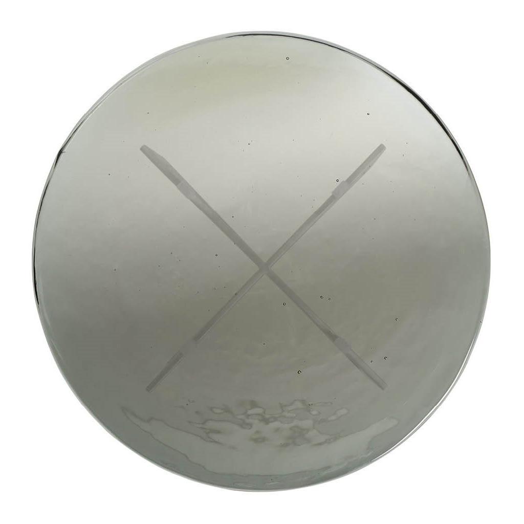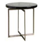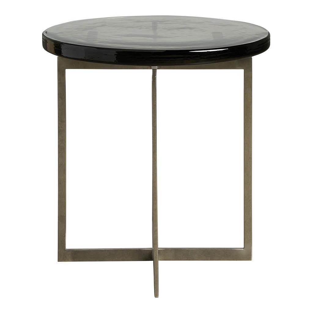 The Jordan Side Table is a captivating piece of furniture featuring a harmonious blend of modern design and timeless elegance. Its circular smoked glass top, with its ethereal pattern, rests atop a slender, stainless steel base finished in antique nickel.