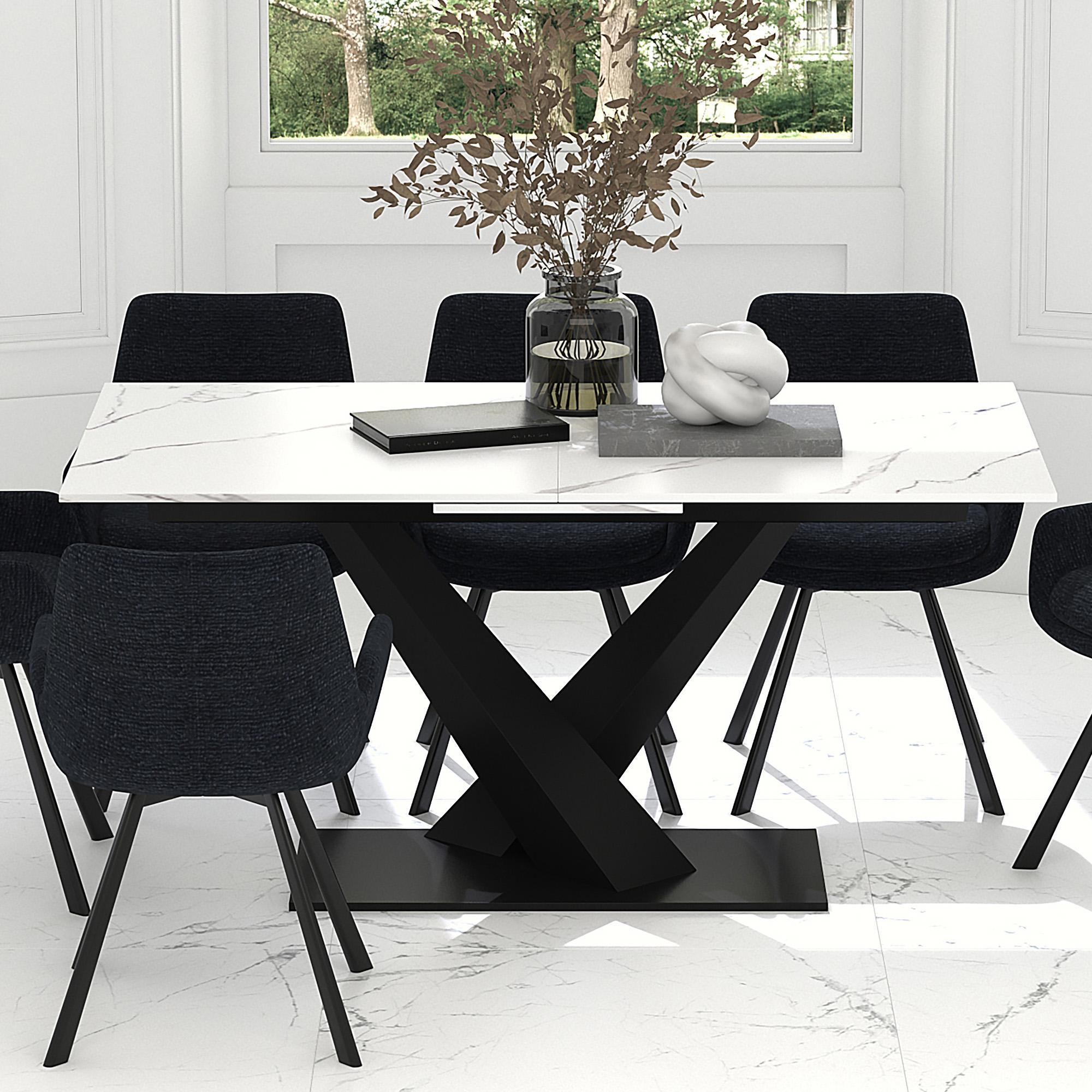 Practicality and style come together with a push and a pull. Quickly extend this table to comfortably seat 8 (or 10!) with the easy to use, one-handed mechanism. The sintered stone table is the best option for durability and design. Heat resistant, stain resistant, scratch resistant and, with the marble effect finishing, still pretty to look at! The geometric pedestal base is the perfect finishing touch on this gorgeous new centrepiece to you dining room or kitchen.