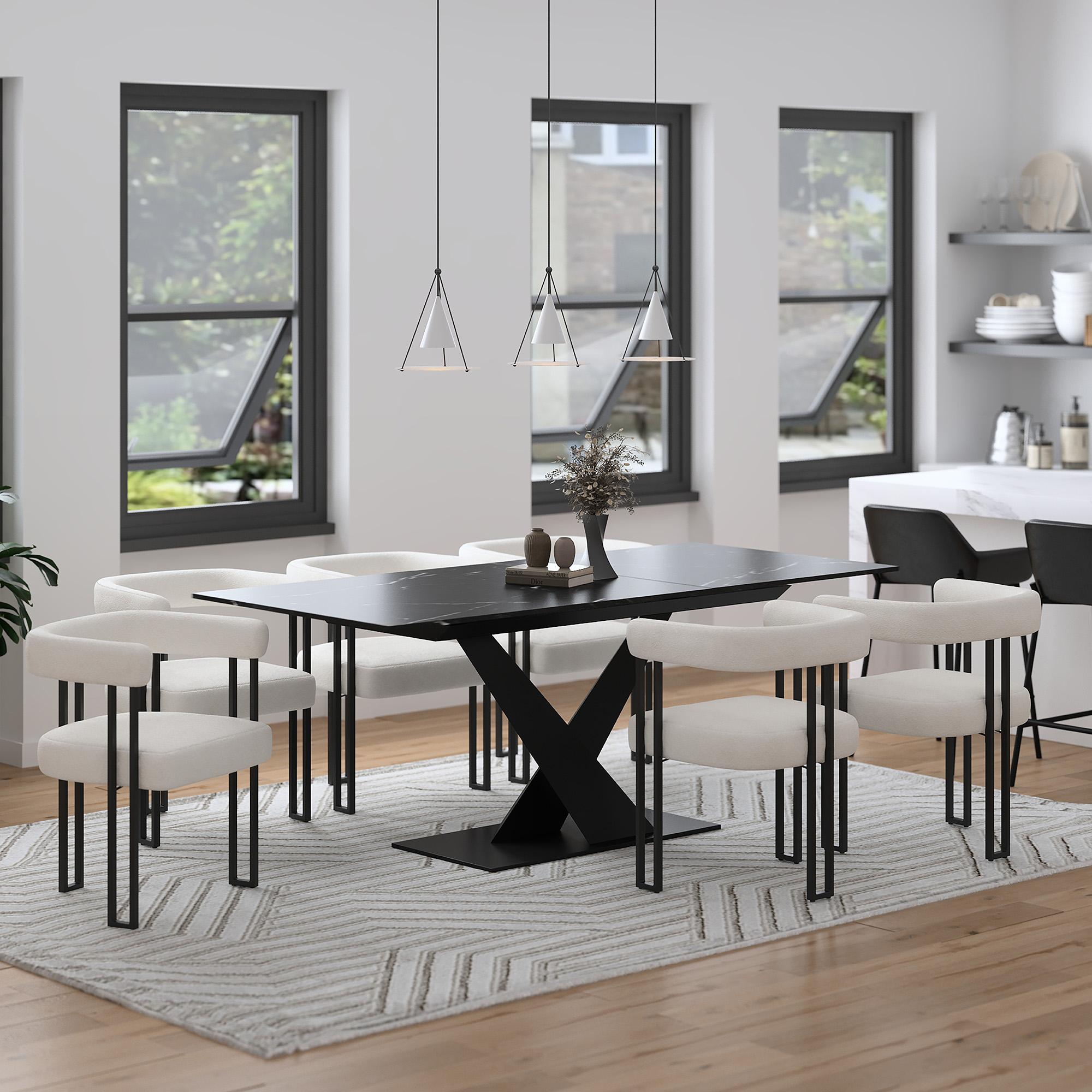 Practicality and style come together with a push and a pull. Quickly extend this table to comfortably seat 8 (or 10!) with the easy to use, one-handed mechanism. The sintered stone table is the best option for durability and design. Heat resistant, stain resistant, scratch resistant and, with the marble effect finishing, still pretty to look at! The geometric pedestal base is the perfect finishing touch on this gorgeous new centrepiece to you dining room or kitchen. Bring the magazine-worthy dining experience to life with these beautiful, boucle-upholstered dining chairs. The textured fabric is quickly becoming a design staple for creating that high-end feel in your space. The square-line black metal frames and supports the chair perfectly, providing hours of seated comfort.