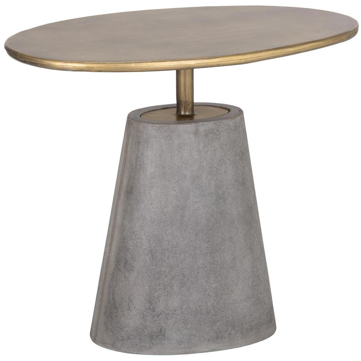 This unique side table will bring a bold yet warm look to living, lounge, and bedroom spaces. Features a dramatic grey concrete base with a brushed brass metal oval top.