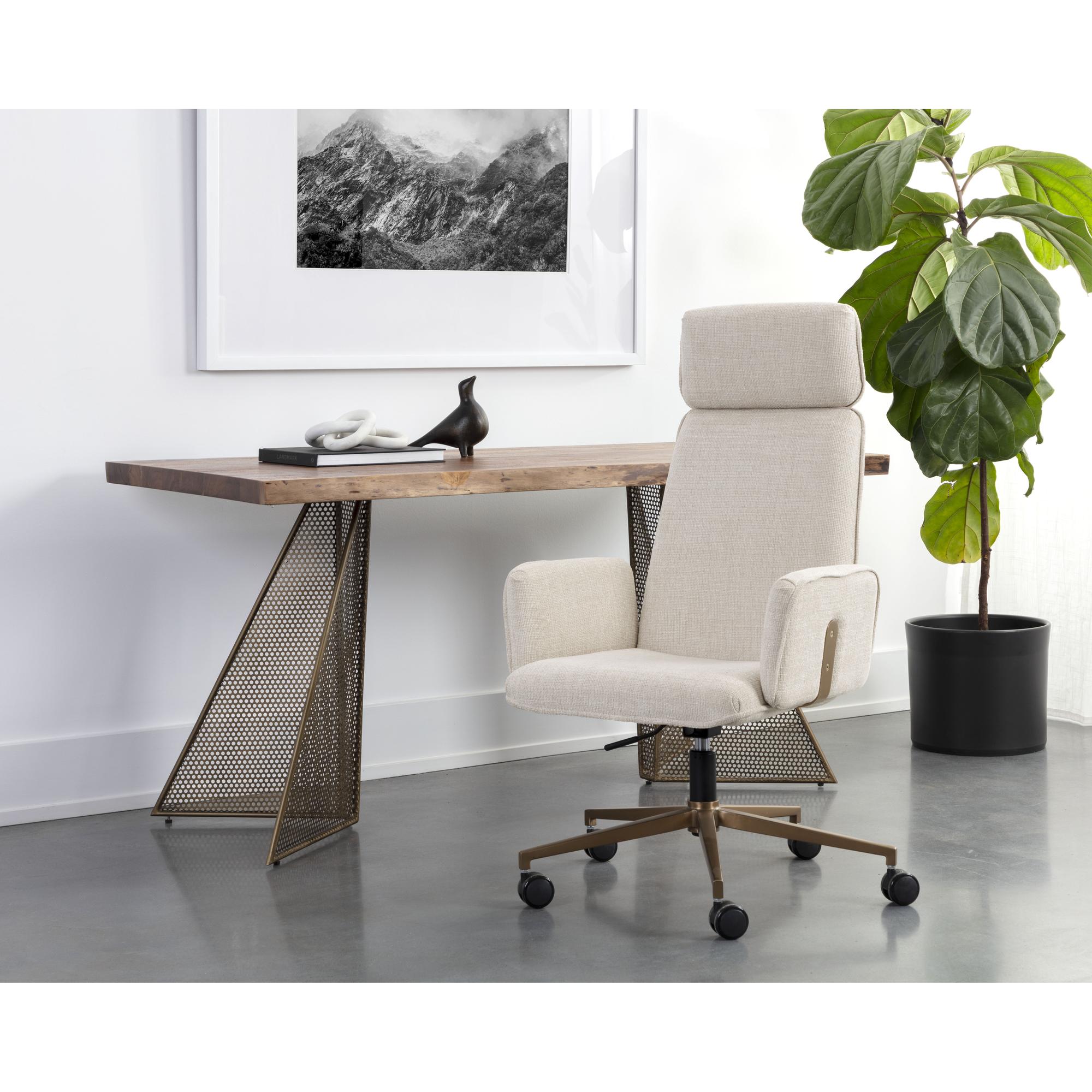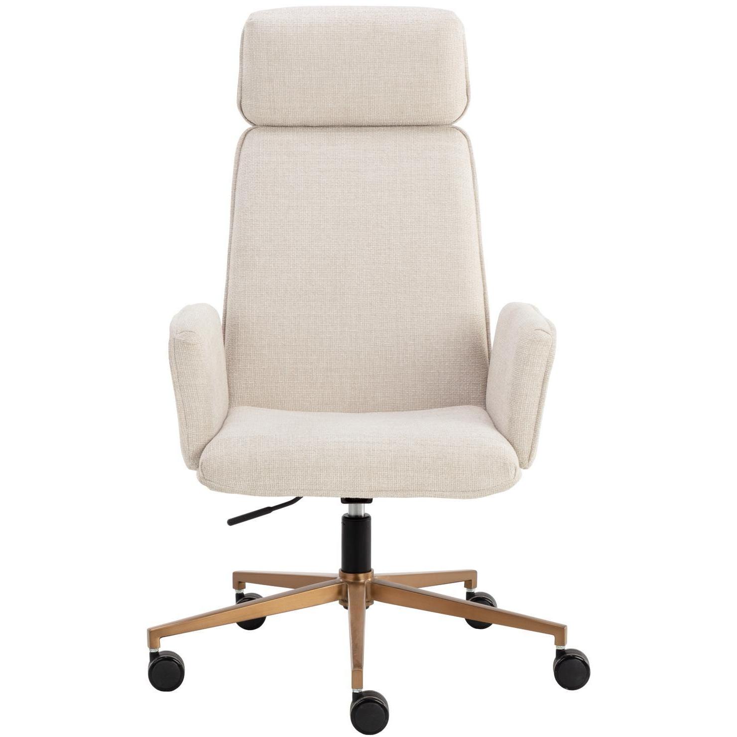 A classic silhouette and subtle curves make the Kalev Office Chair perfect for any workspace. Upholstered in chacha cream fabric with plush comfortable seating. Contrasting gold accents behind the arms and headrest match the sleek stainless steel base for added style.
