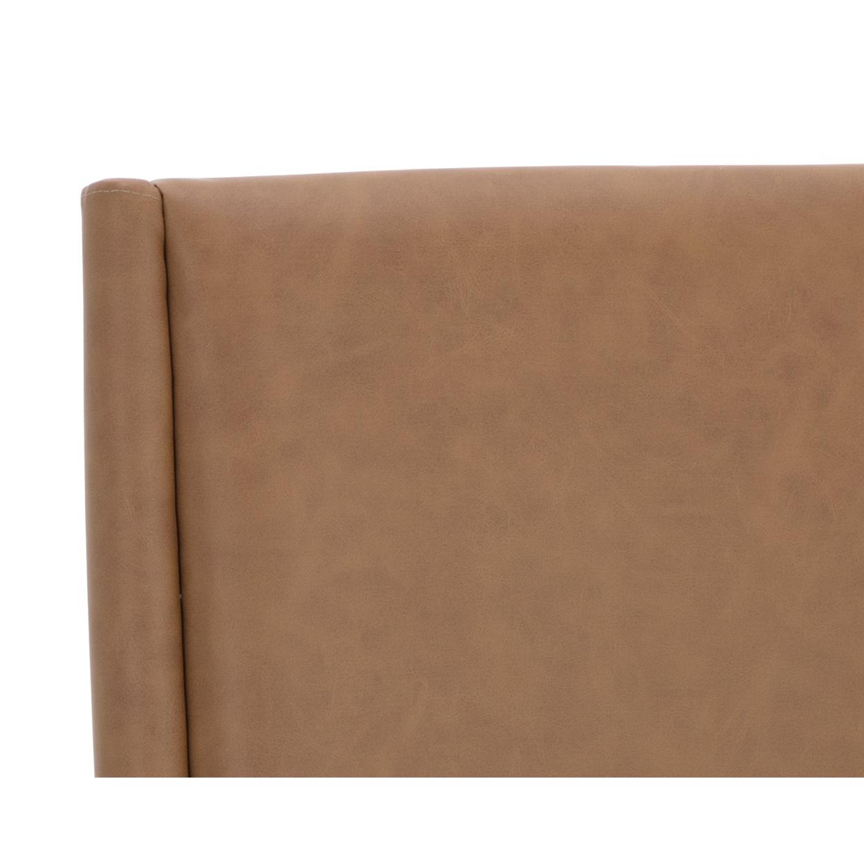 The Kalla Dining Chair brings form and function to life. Fully upholstered seating in our milliken cognac faux leather sits atop a rustic oak wood base. Gold foot caps finish the look.