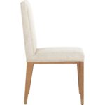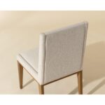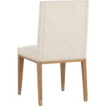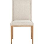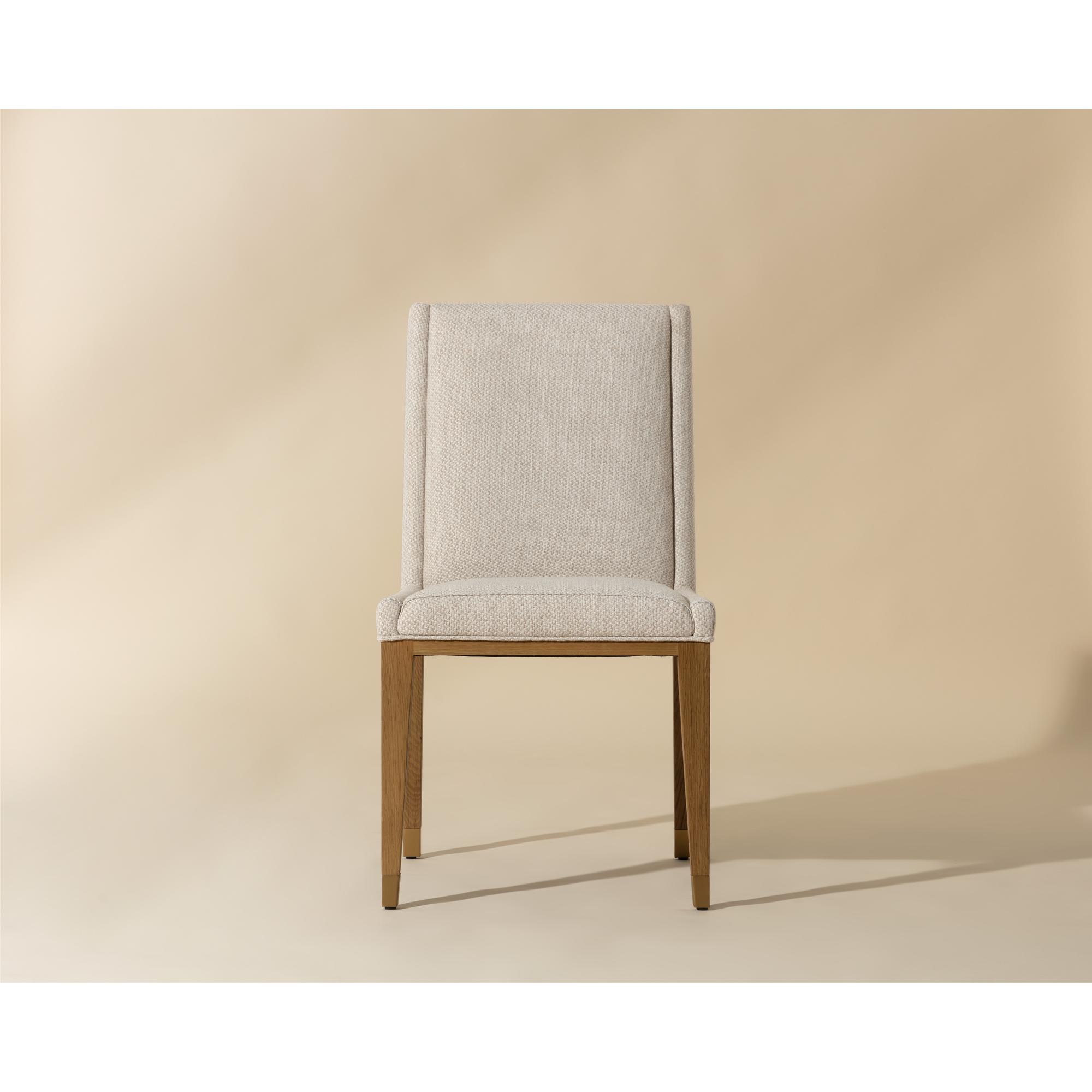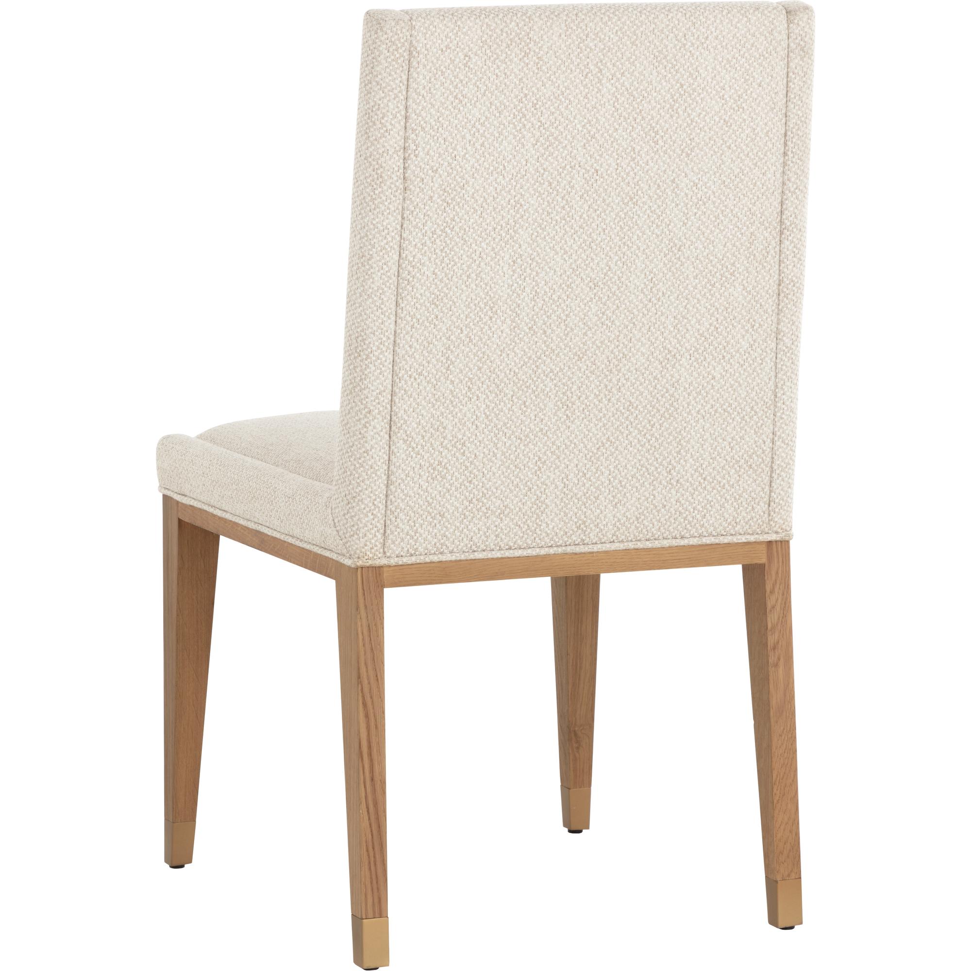 The Kalla Dining Chair brings form and function to life. Fully upholstered seating in our monument oatmeal fabric sits atop a rustic oak wood base. Gold foot caps finish the look.