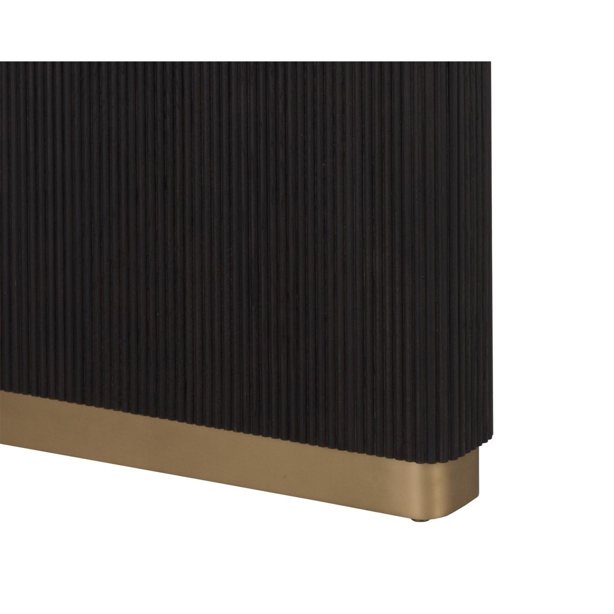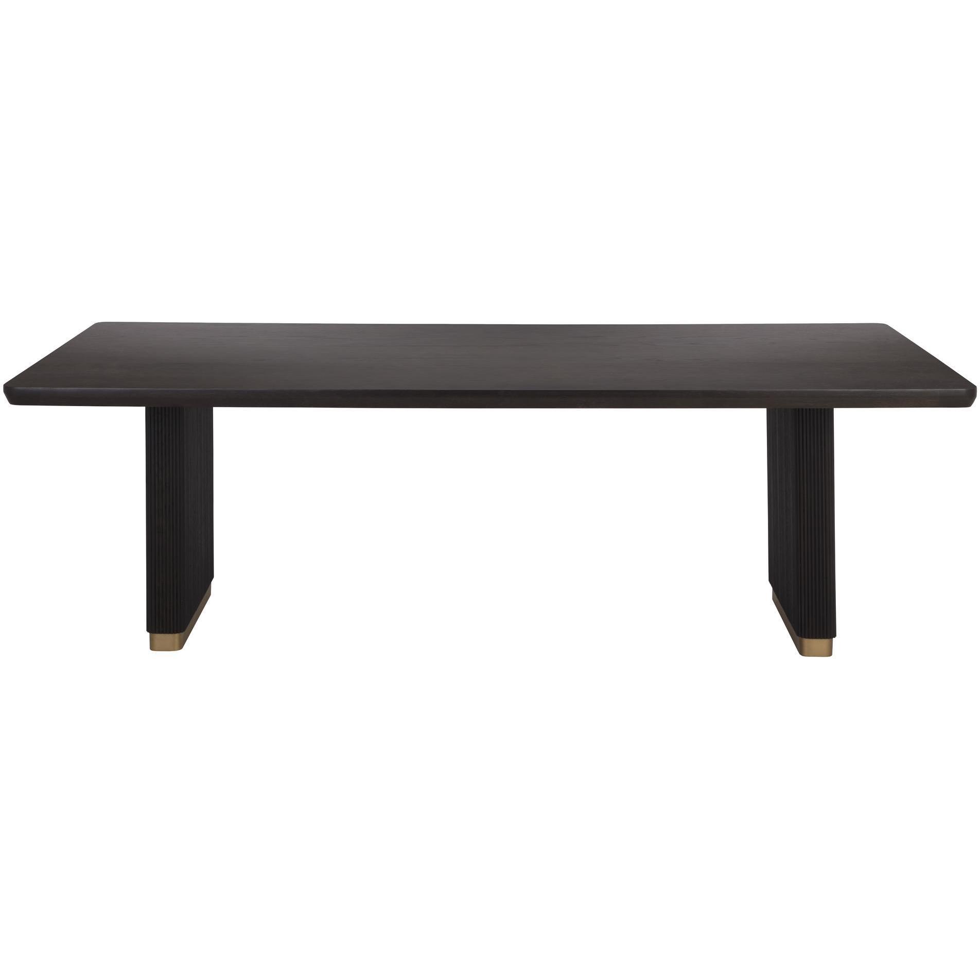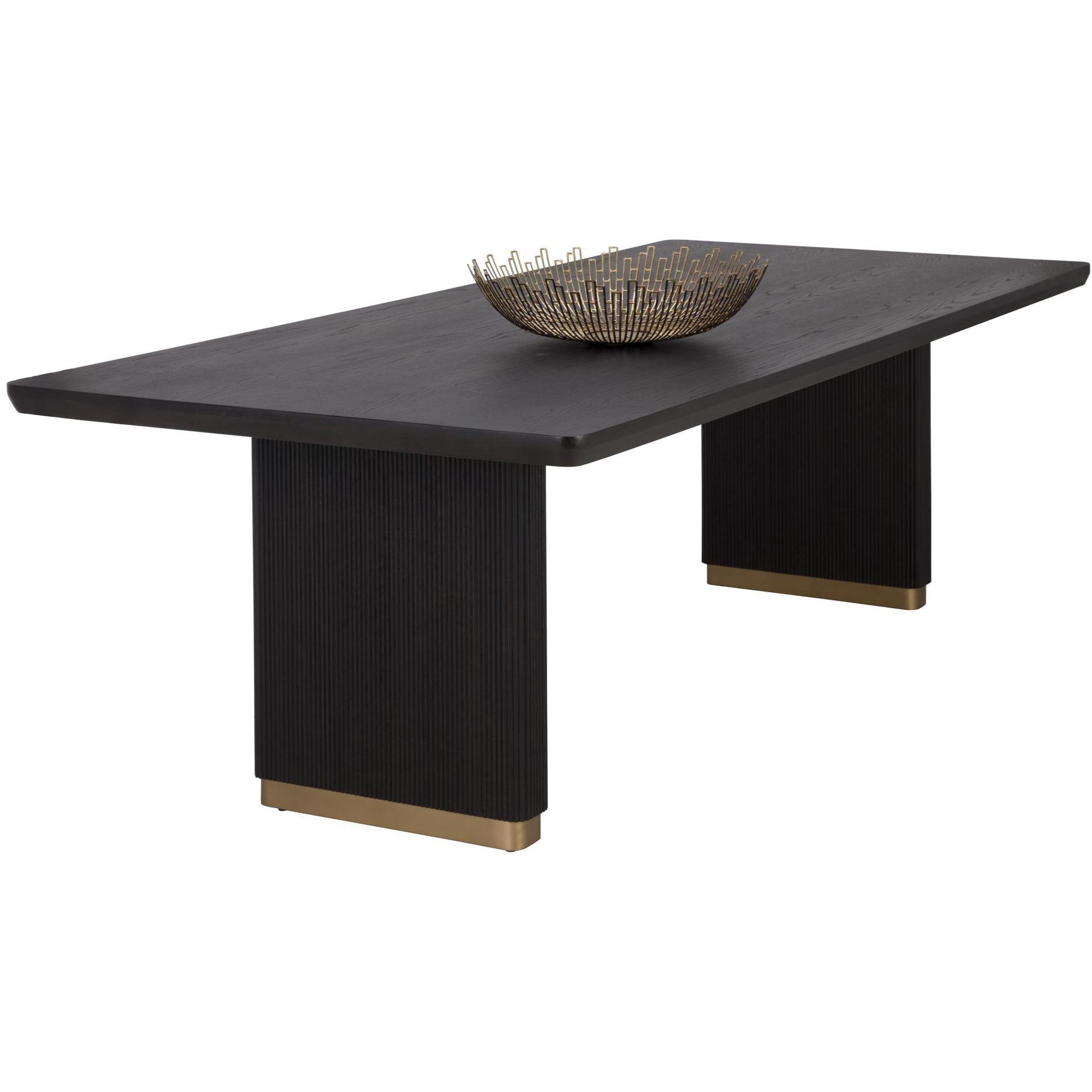 The Kalla Dining Table brings form and function to life. Crafted with a charcoal grey oak veneer table top with a chamfered edge. Vertical reeding on a solid oak wood base with brushed gold steel detailing at the bottom finishes the look. As wood is an organic, porous material, these pieces will contain natural variation of texture and may also exhibit fine indentations and cracks. Wood pieces will also display a disparity of colour and grain, and visible knots and burls that add to the character of each piece.